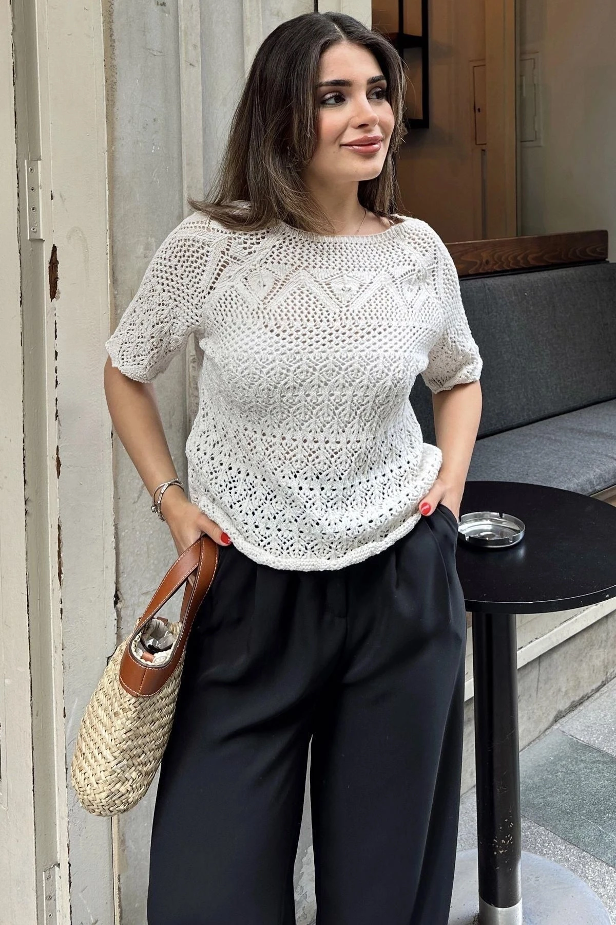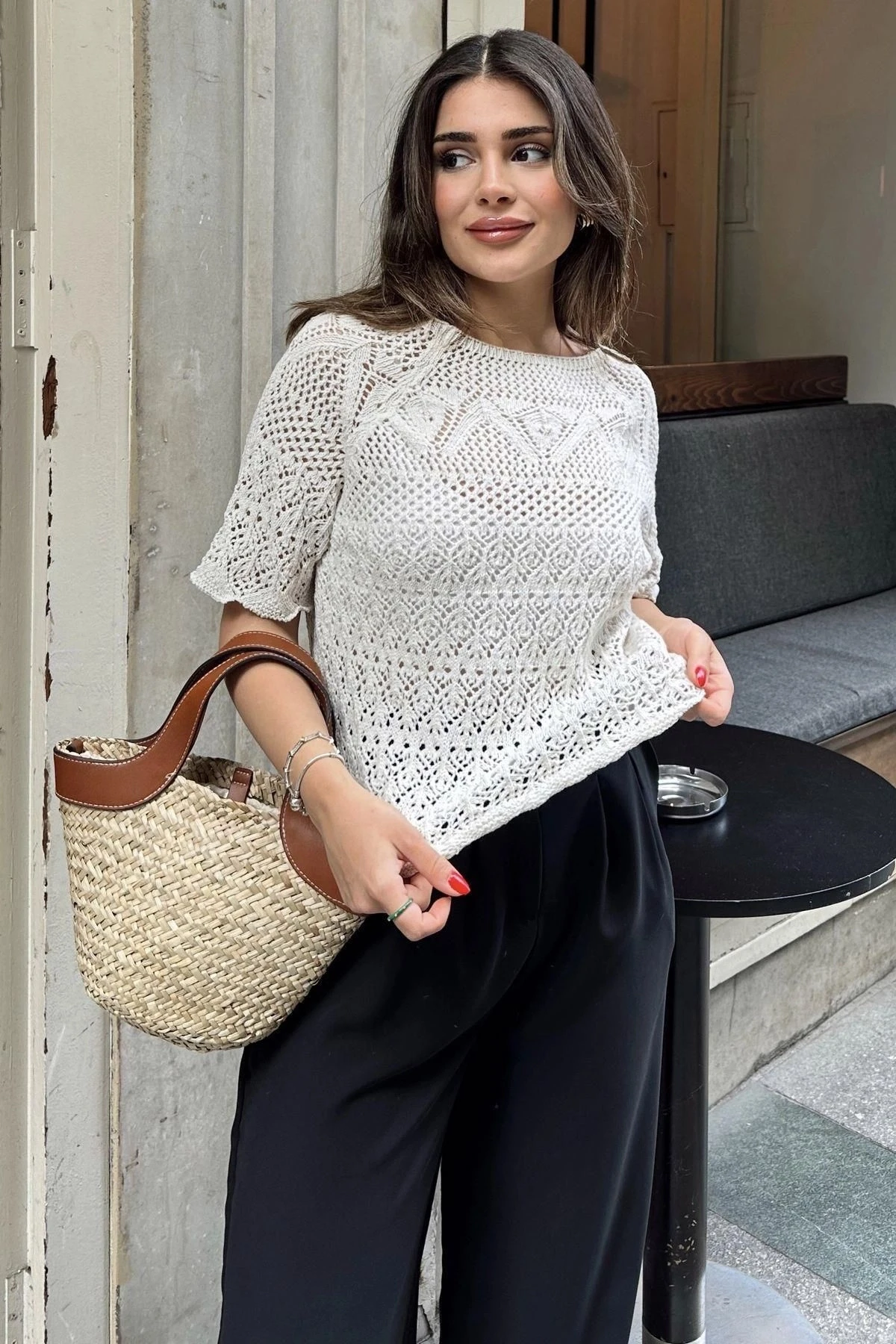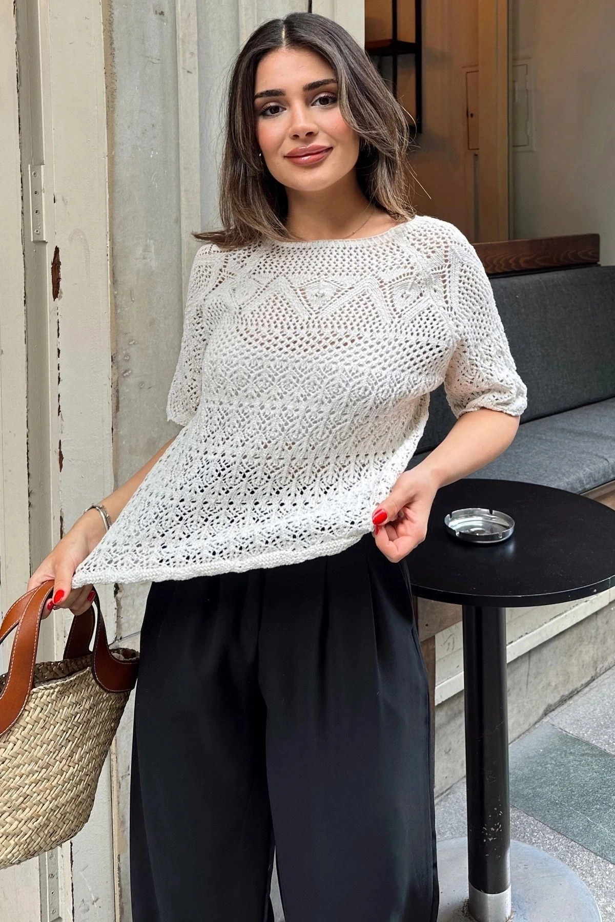 Kadın Ekru Ajurlu Merserize Triko Örme, Terletmez, Salaş Kalıp, Bisiklet Yaka Bluz