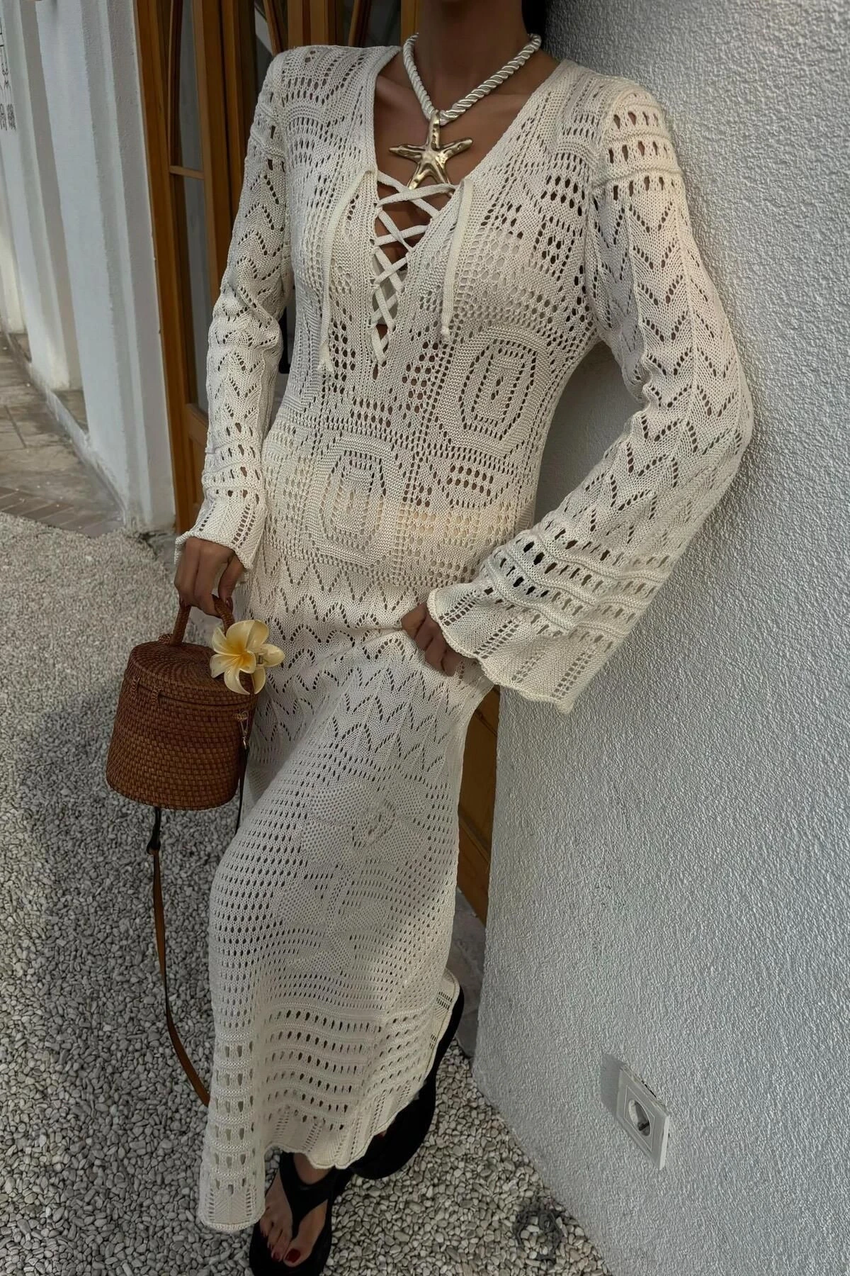 Kadın Ekru Akrilik Ajurlu Uzun V Yaka Elbise