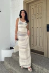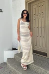 Kadın Ekru Akrilik Dokuma Uzun Kolsuz Kare Yaka Elbise