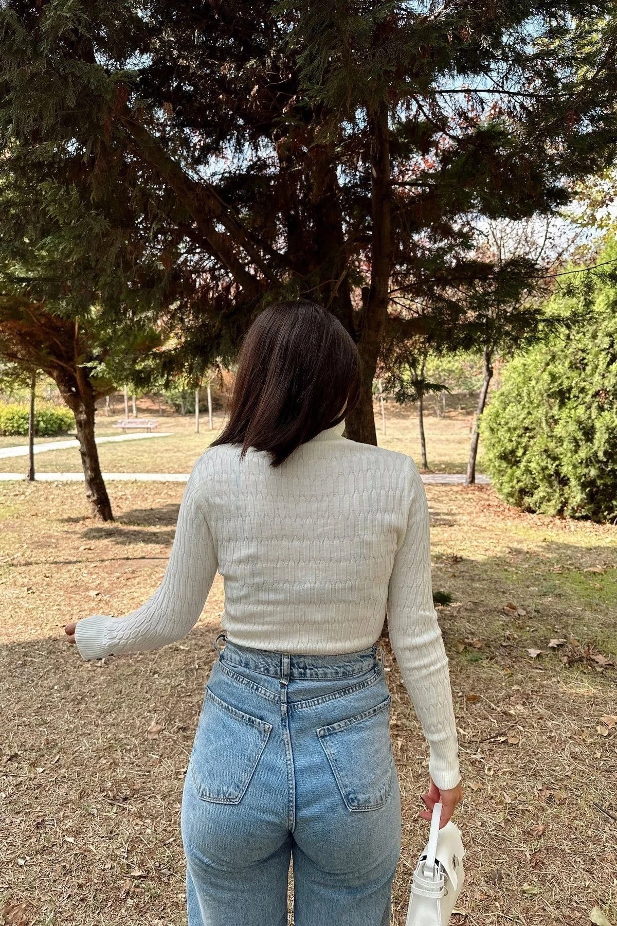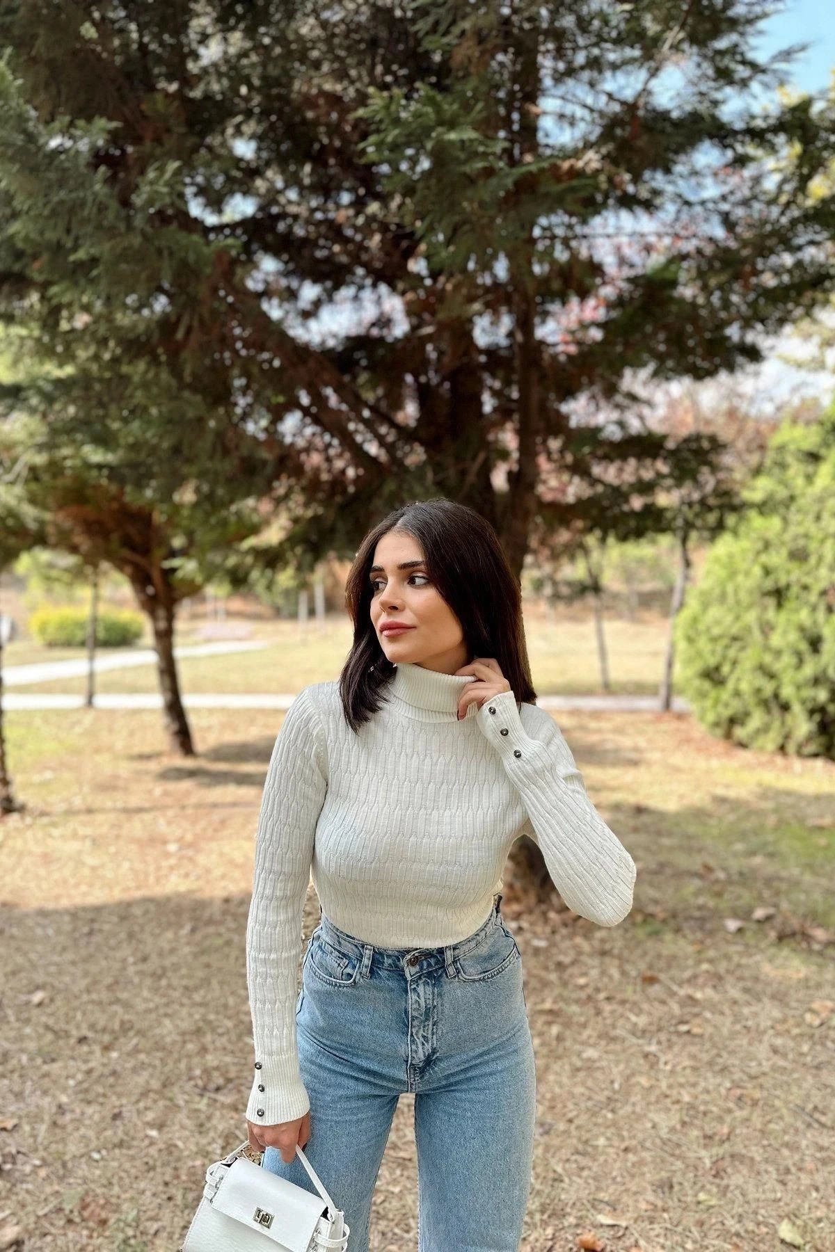 Kadın Ekru Boğazlı Yaka, Uzun Kol, Vucüda Oturan Esnek Kumaş, Düğme Manşet, Örgü Desen, Triko Bluz