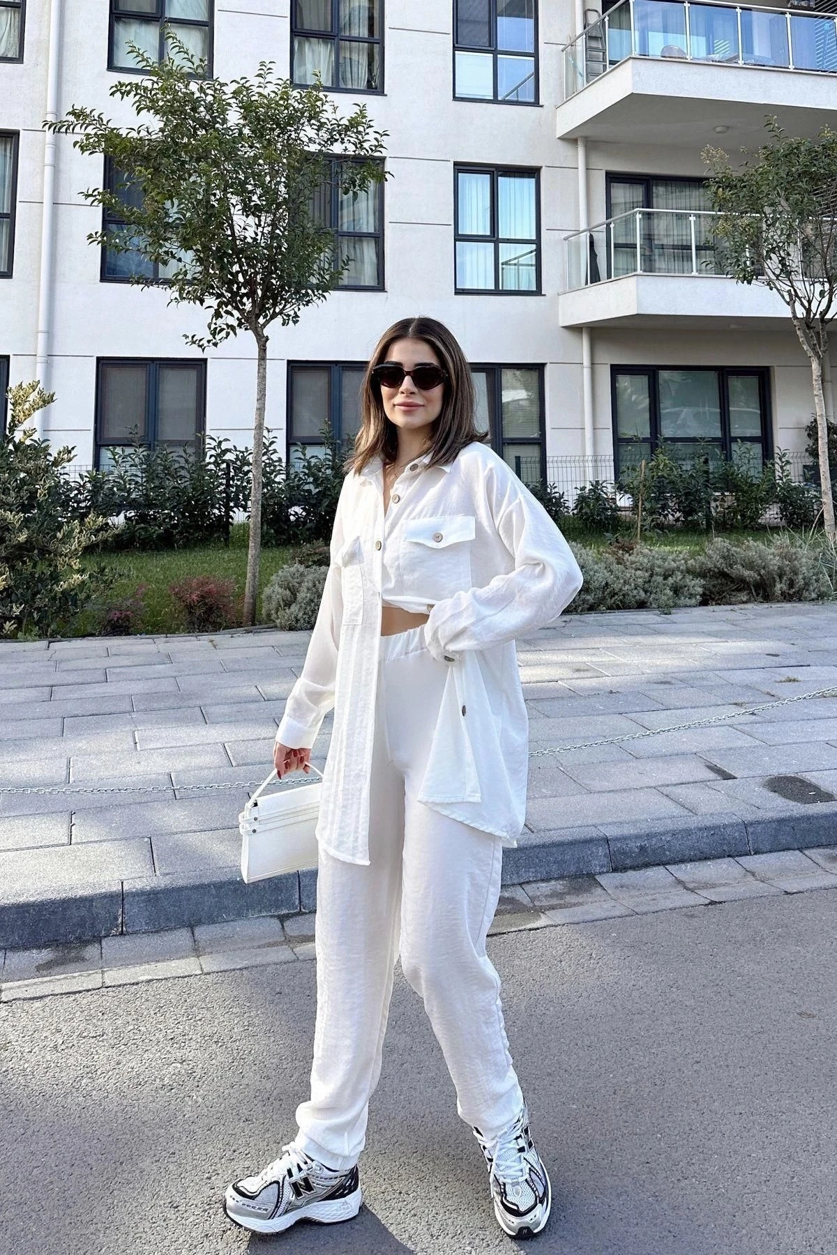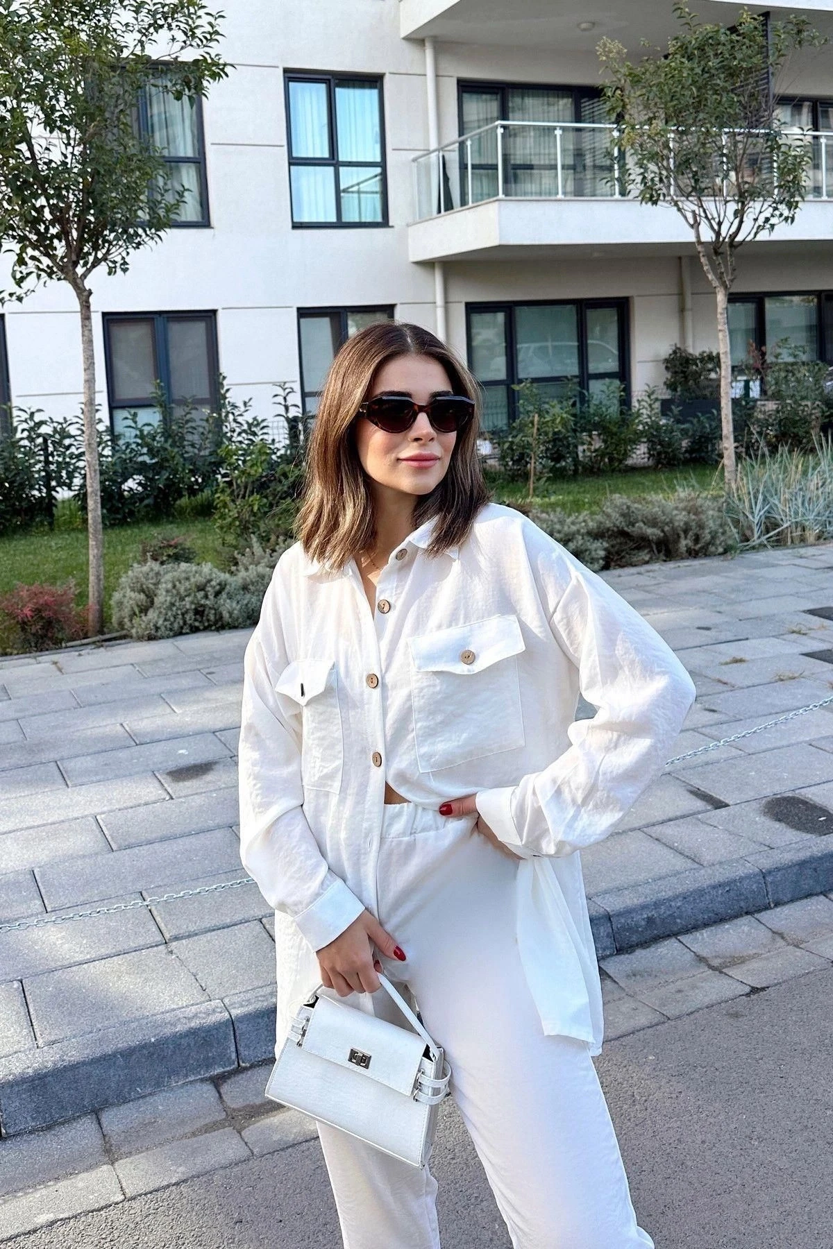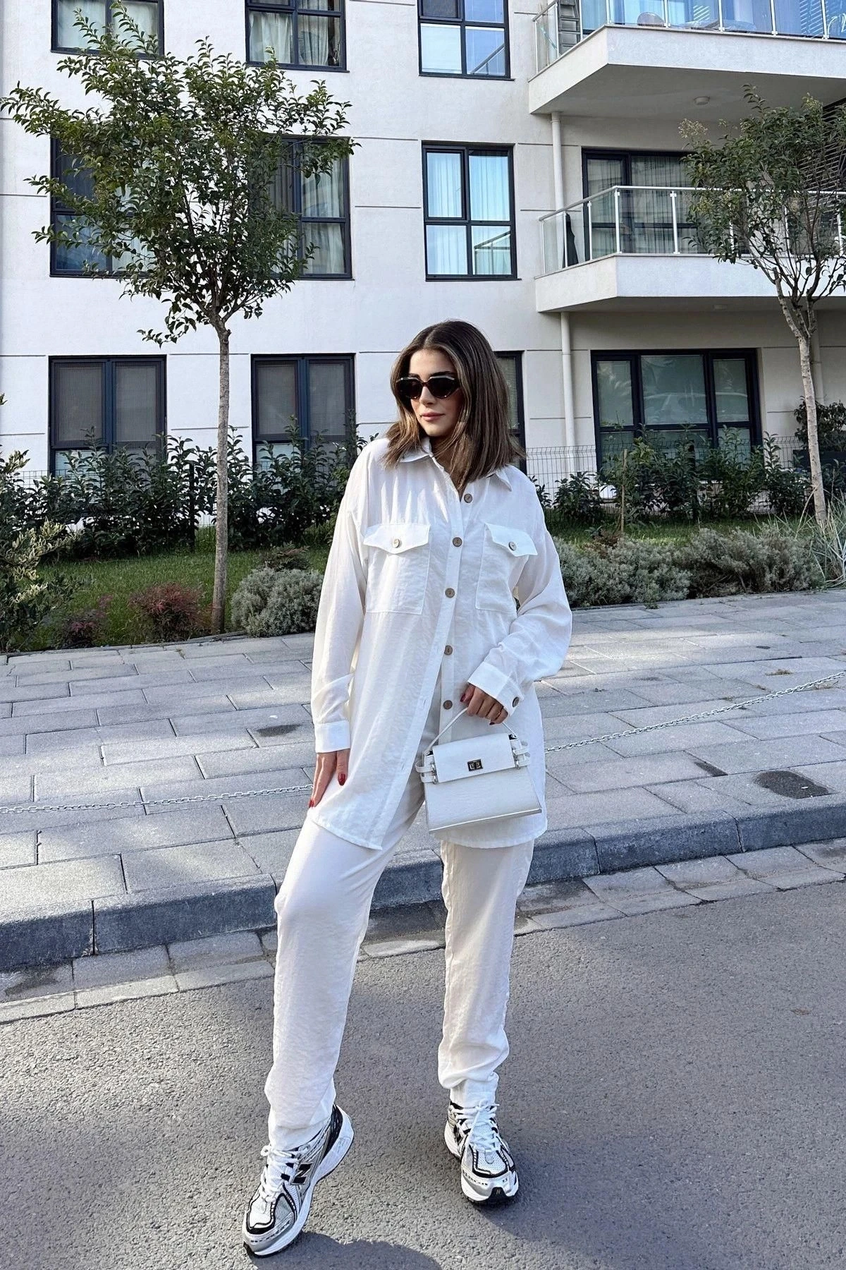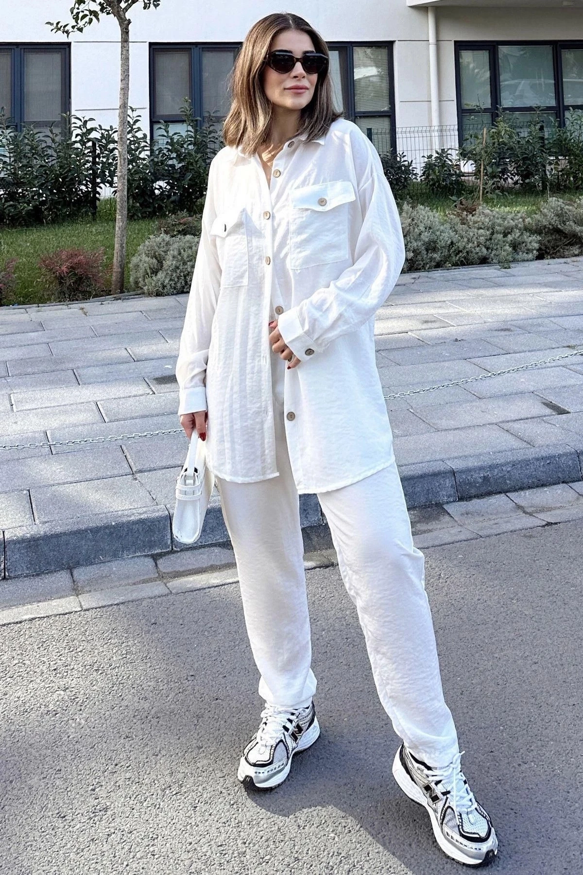 Kadın Ekru Çift Cepli Uzun Gömlek & Beli Lastikli Pantolon - Rahat Alt & Üst Takım