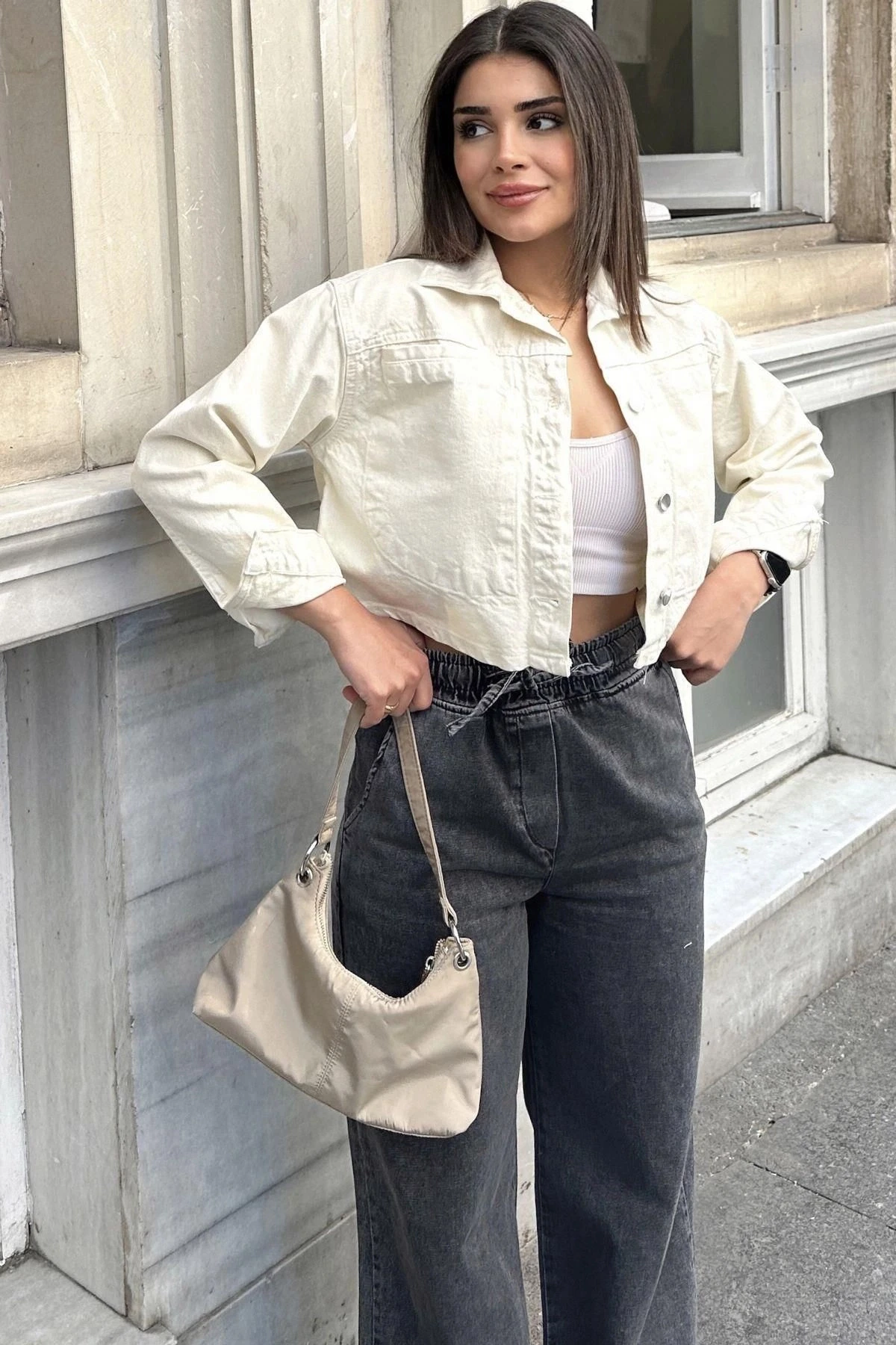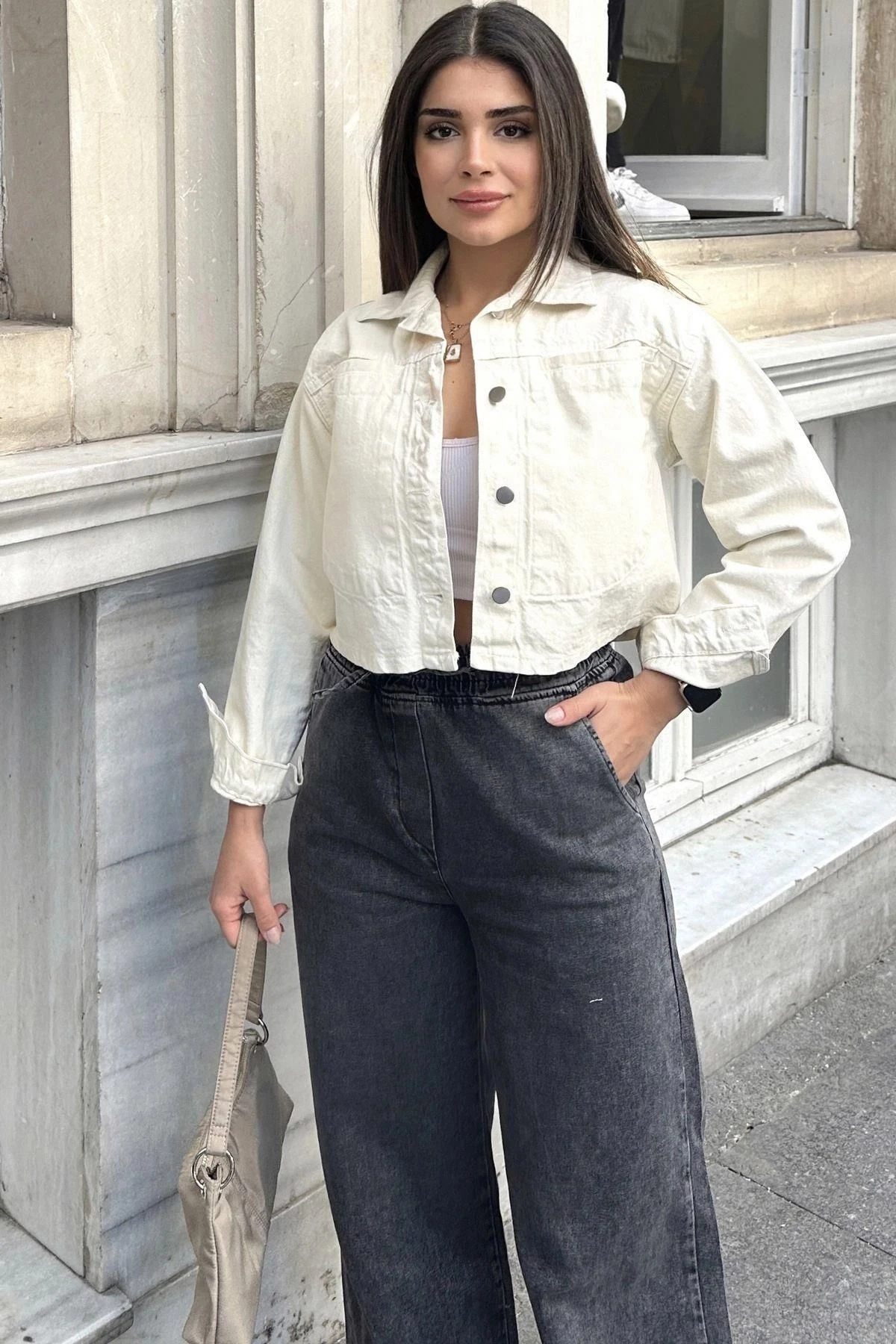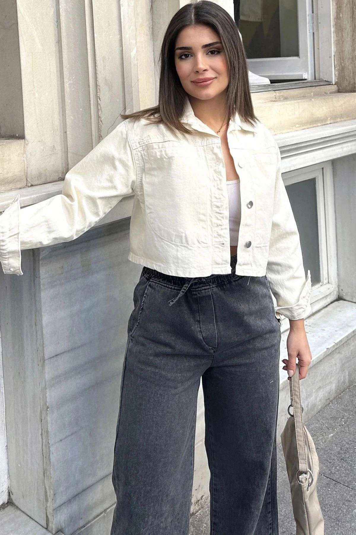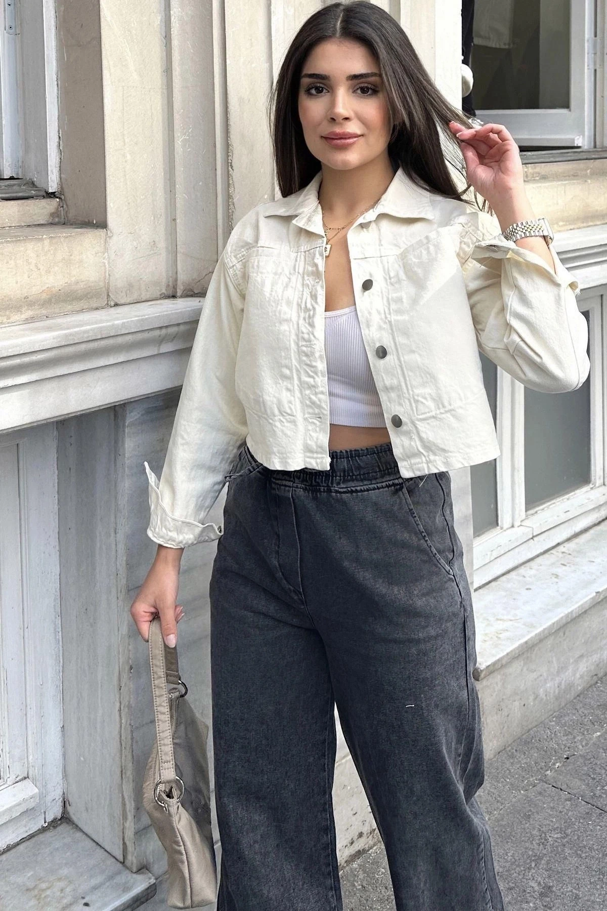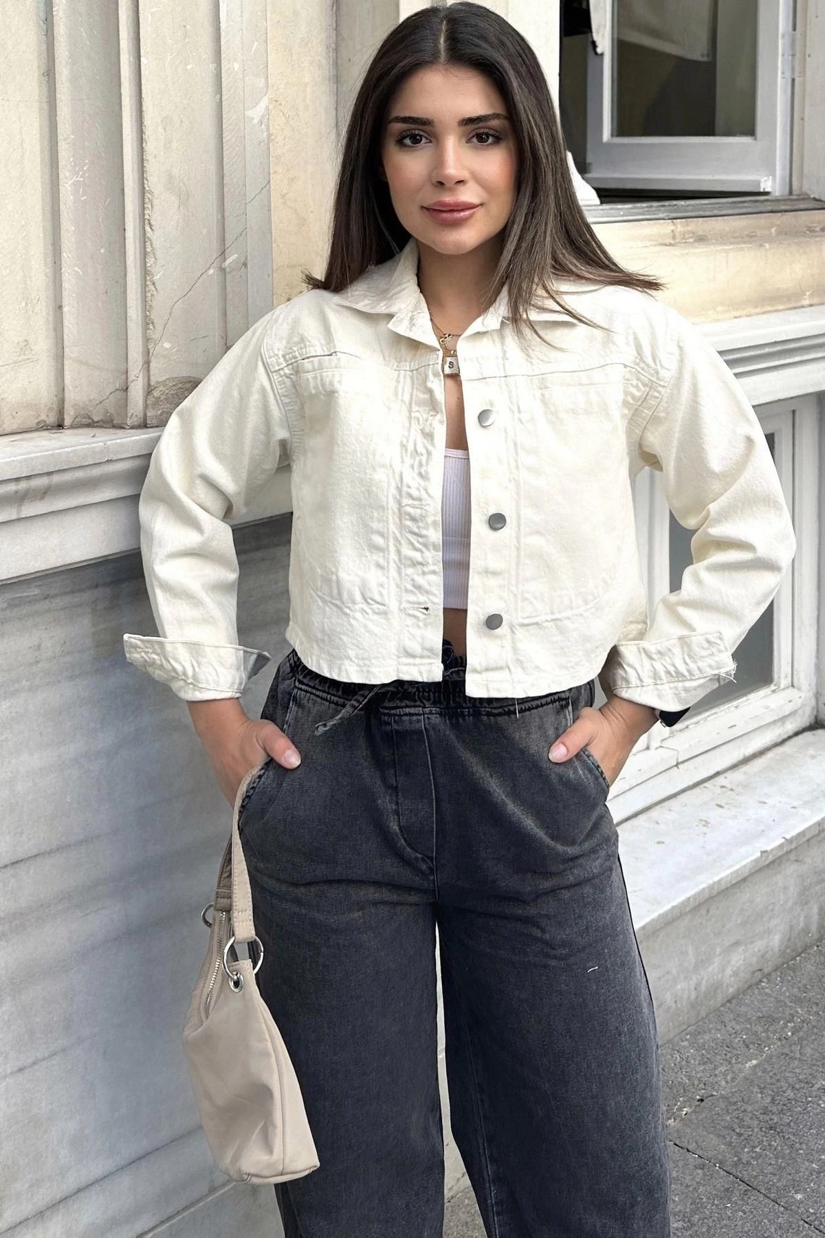 Kadın Ekru Crop Kesim, Düğmeli, Rahat Kalıp, Gabardin Ceket