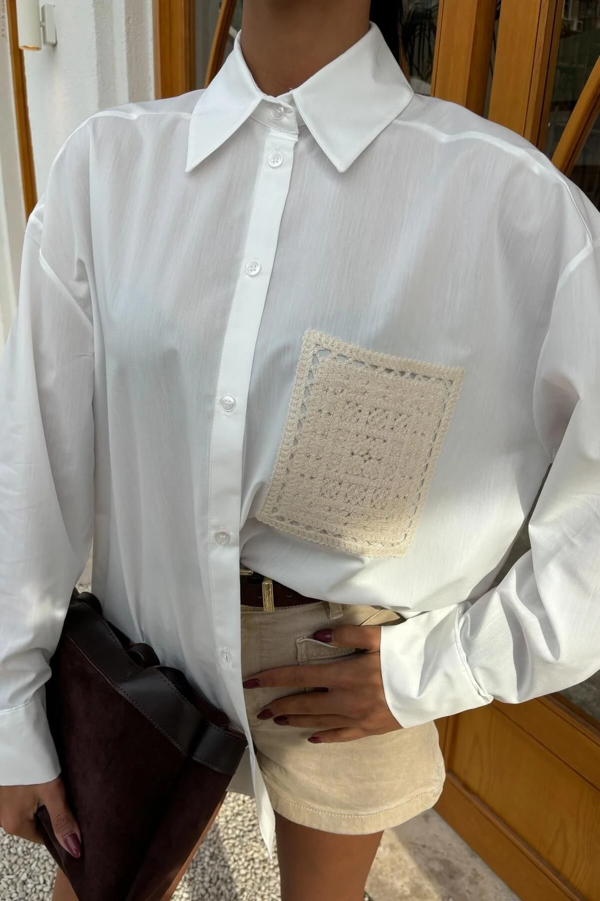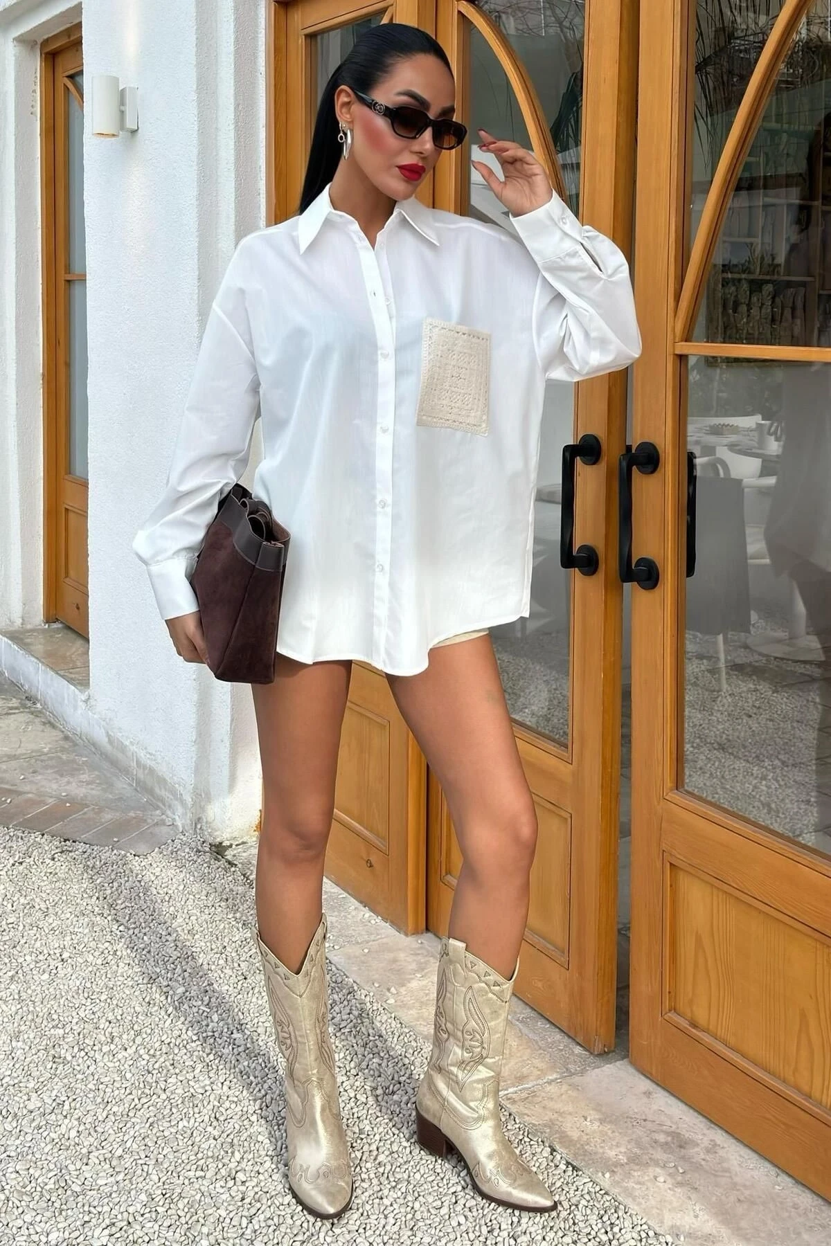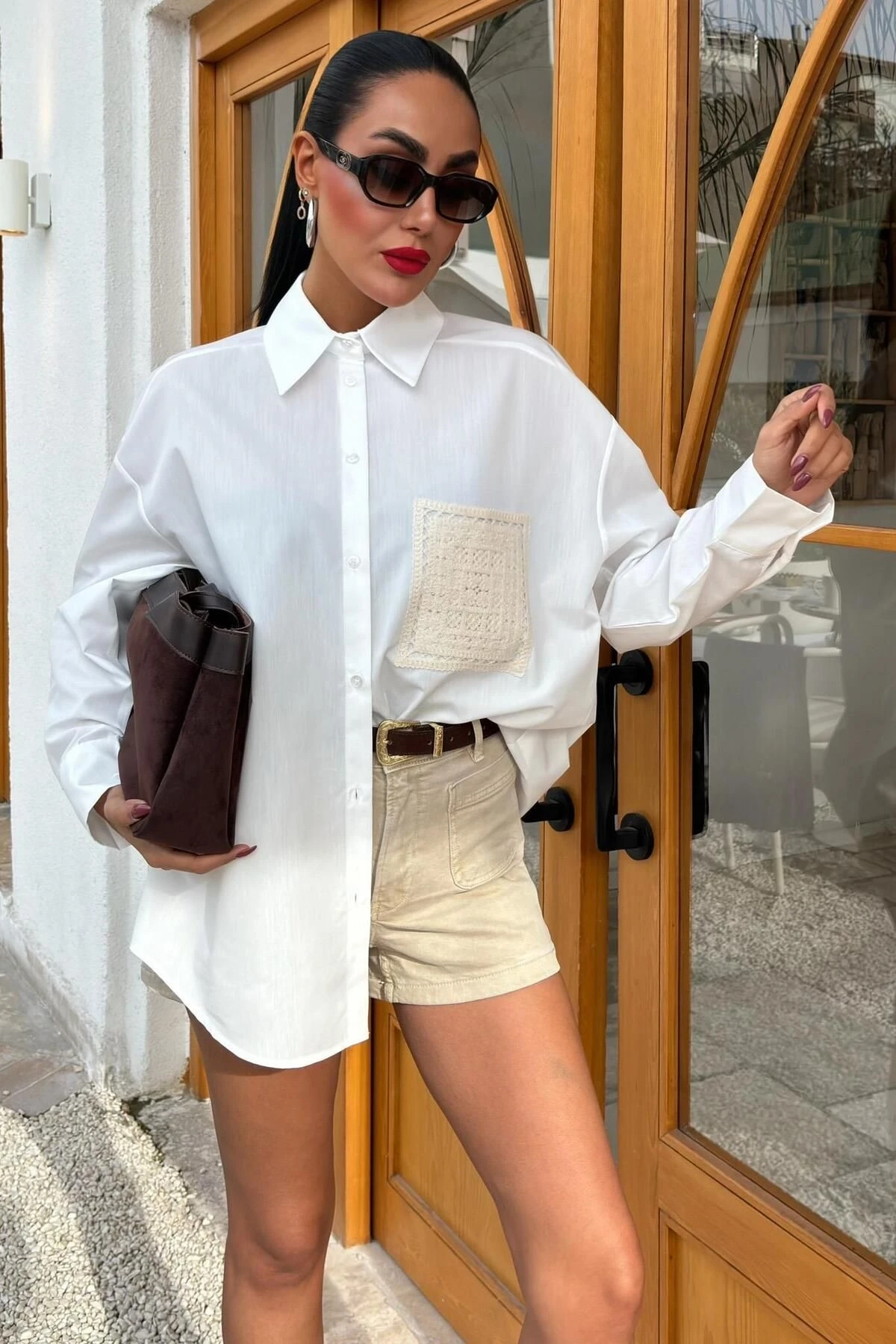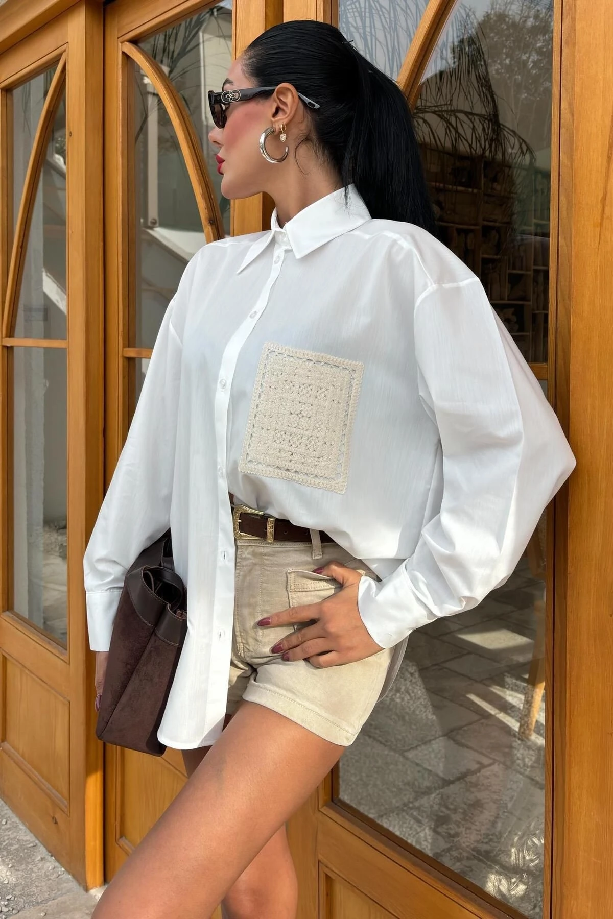 Kadın Ekru Dokuma Uzun Cepli Oversize Gömlek