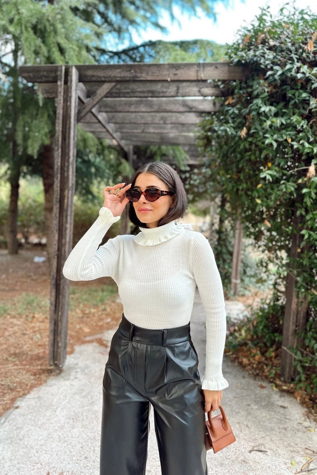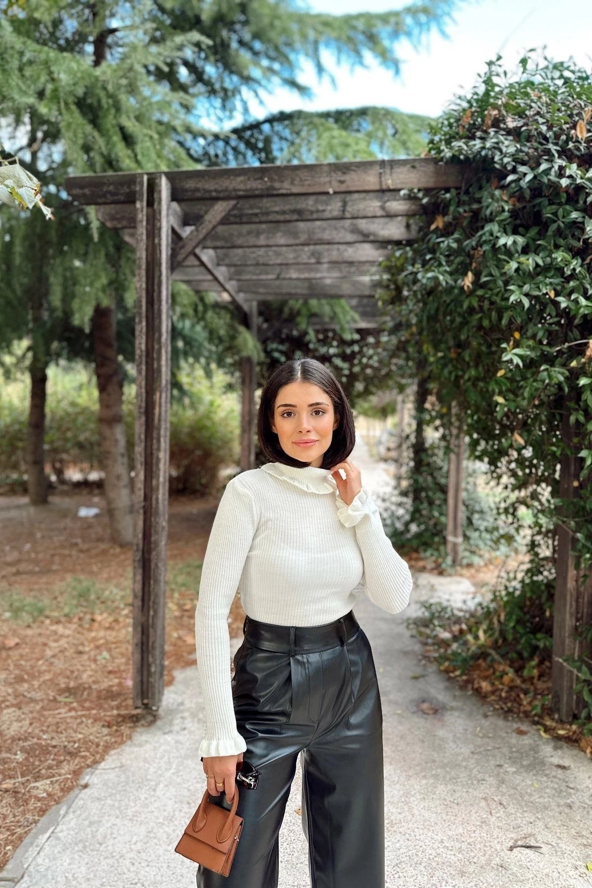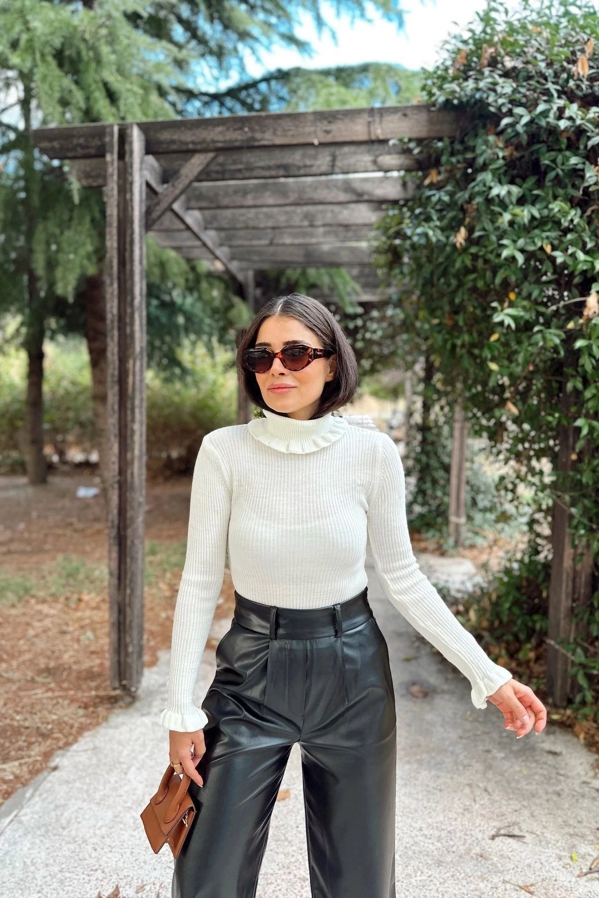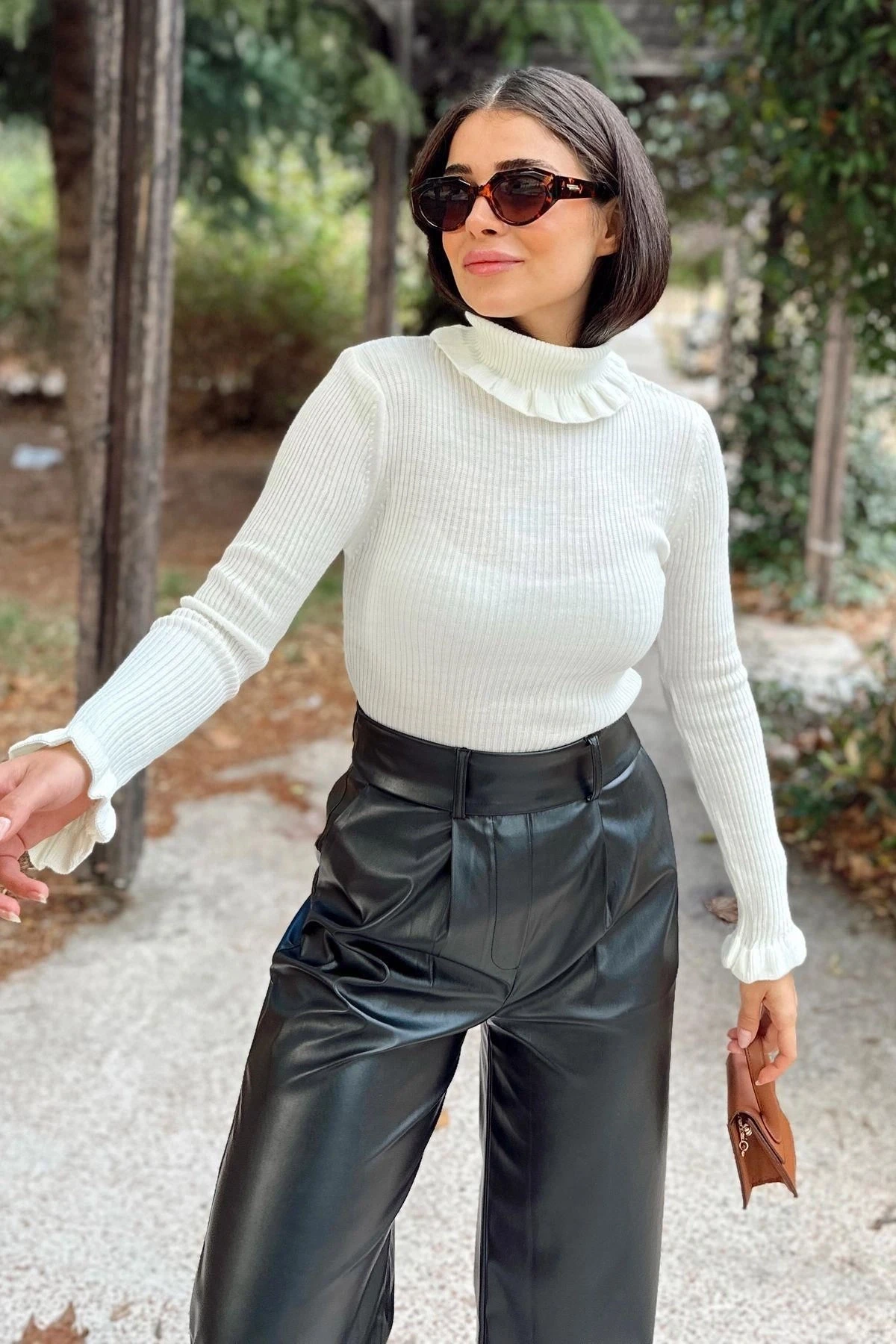 Kadın Ekru Fırfırlı Boğazlı Yaka, Uzun Kol, Vucüda Oturan Kalıp, Esnek Kumaş, Düz Desen, Triko Bluz