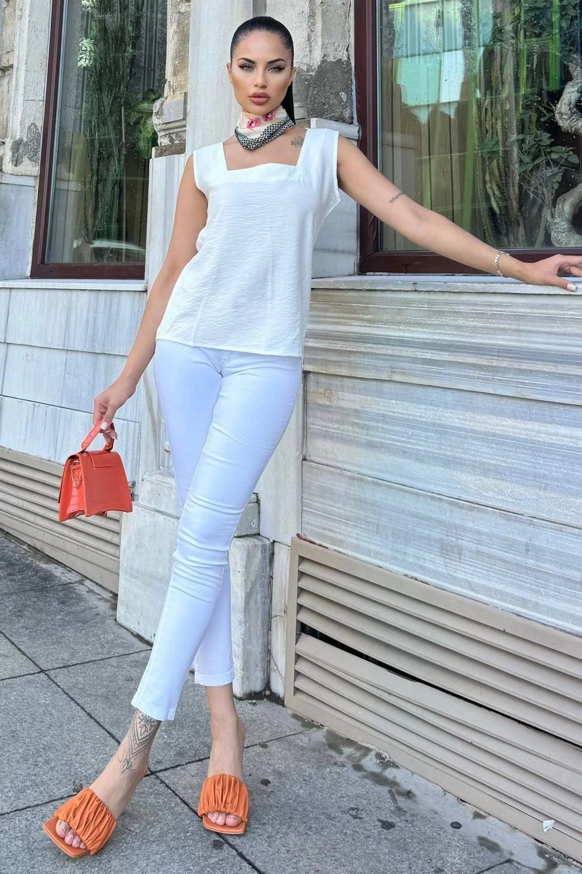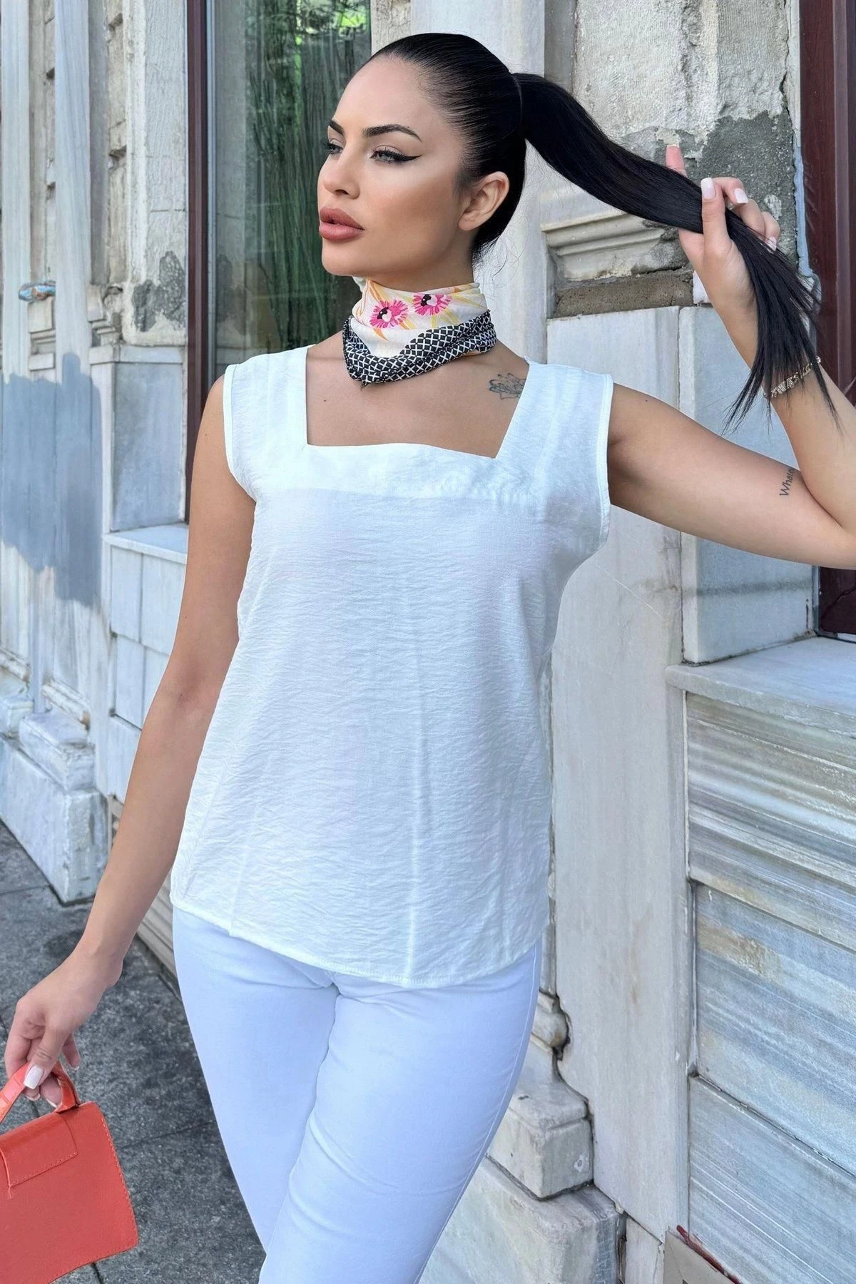 Kadın Ekru Kalın Askılı, Kare Yaka, Salaş Keten Bluz