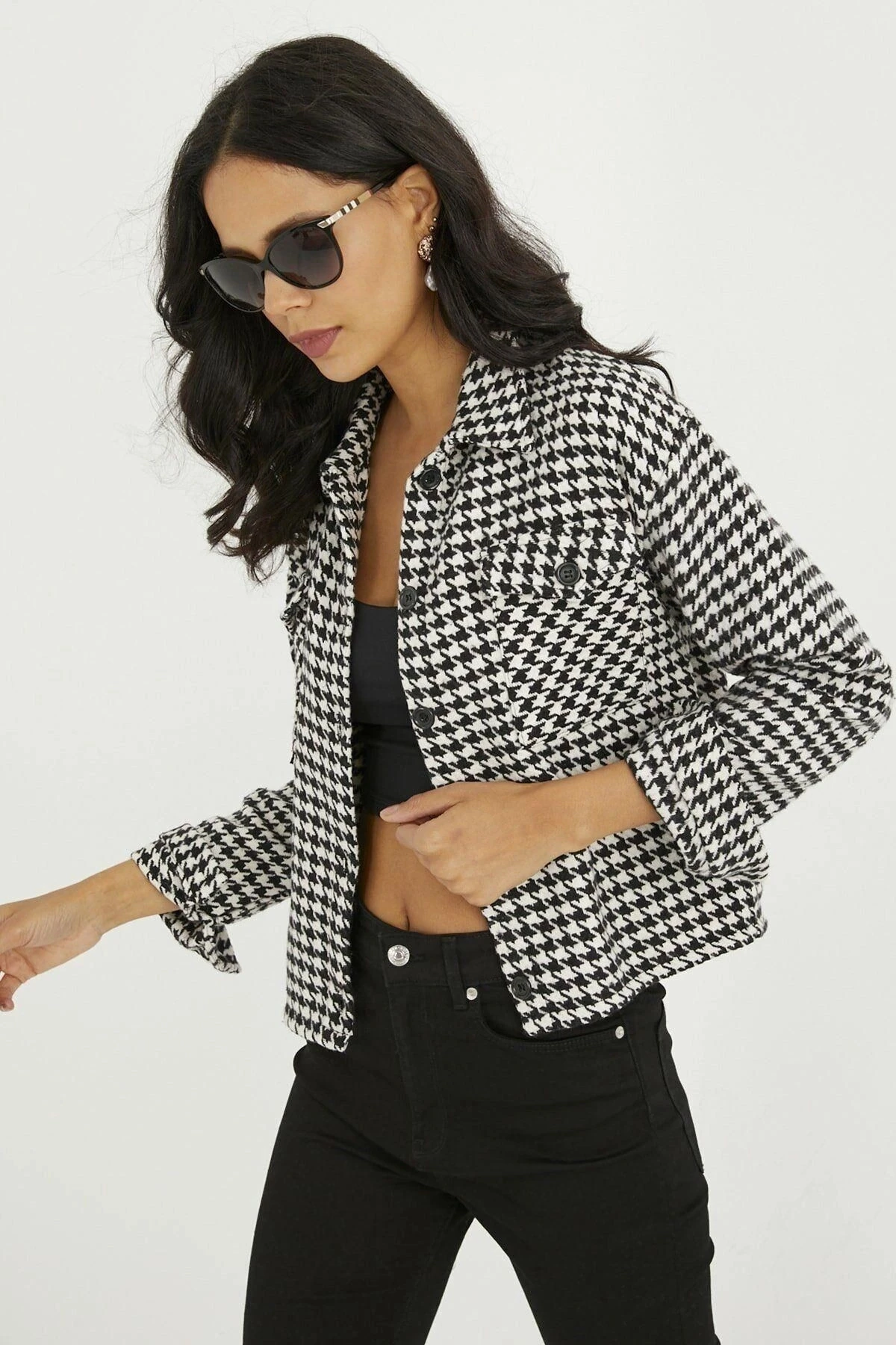 Kadın Ekru Klasik Yaka, Uzun Kol, Cep Detaylı, Kazayağı Desenli, Regular Kesim, Standart Boy Yelek.
