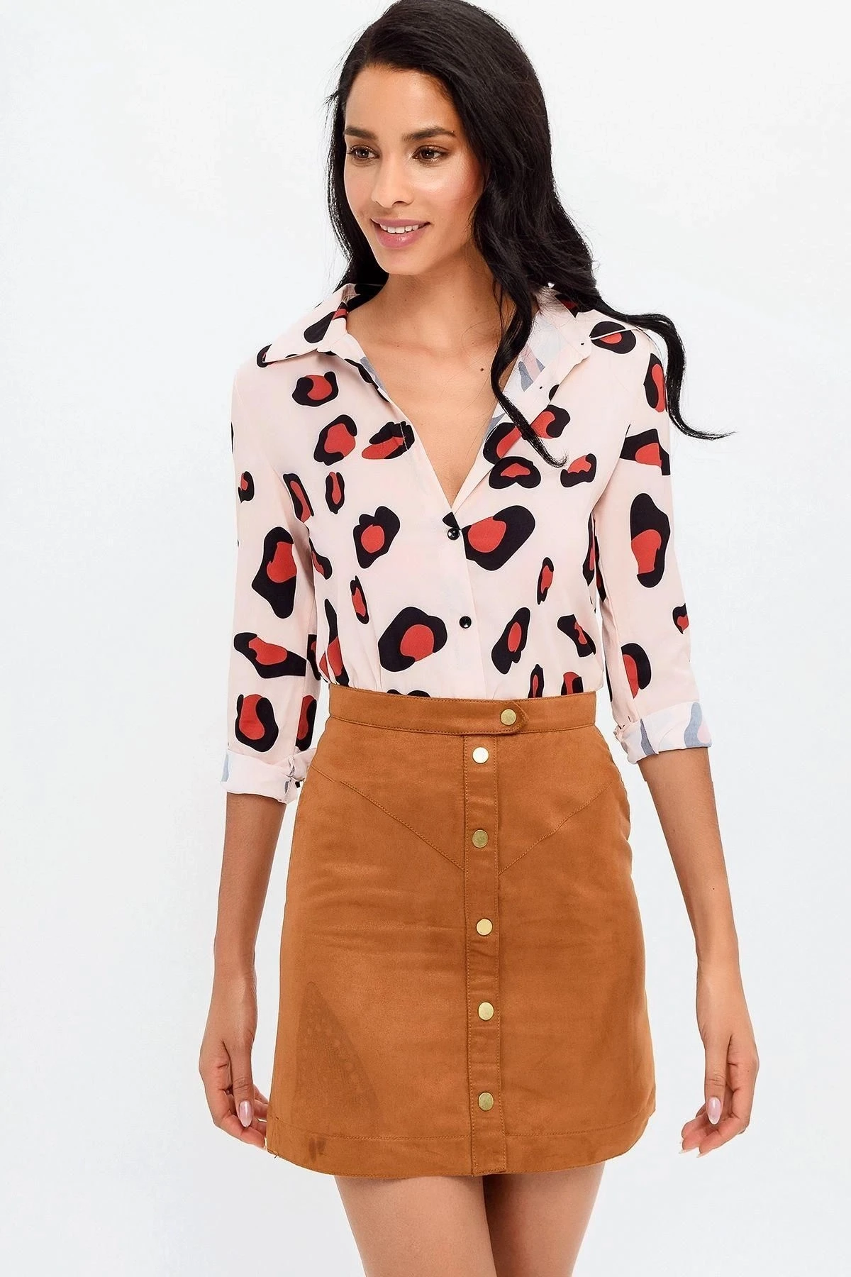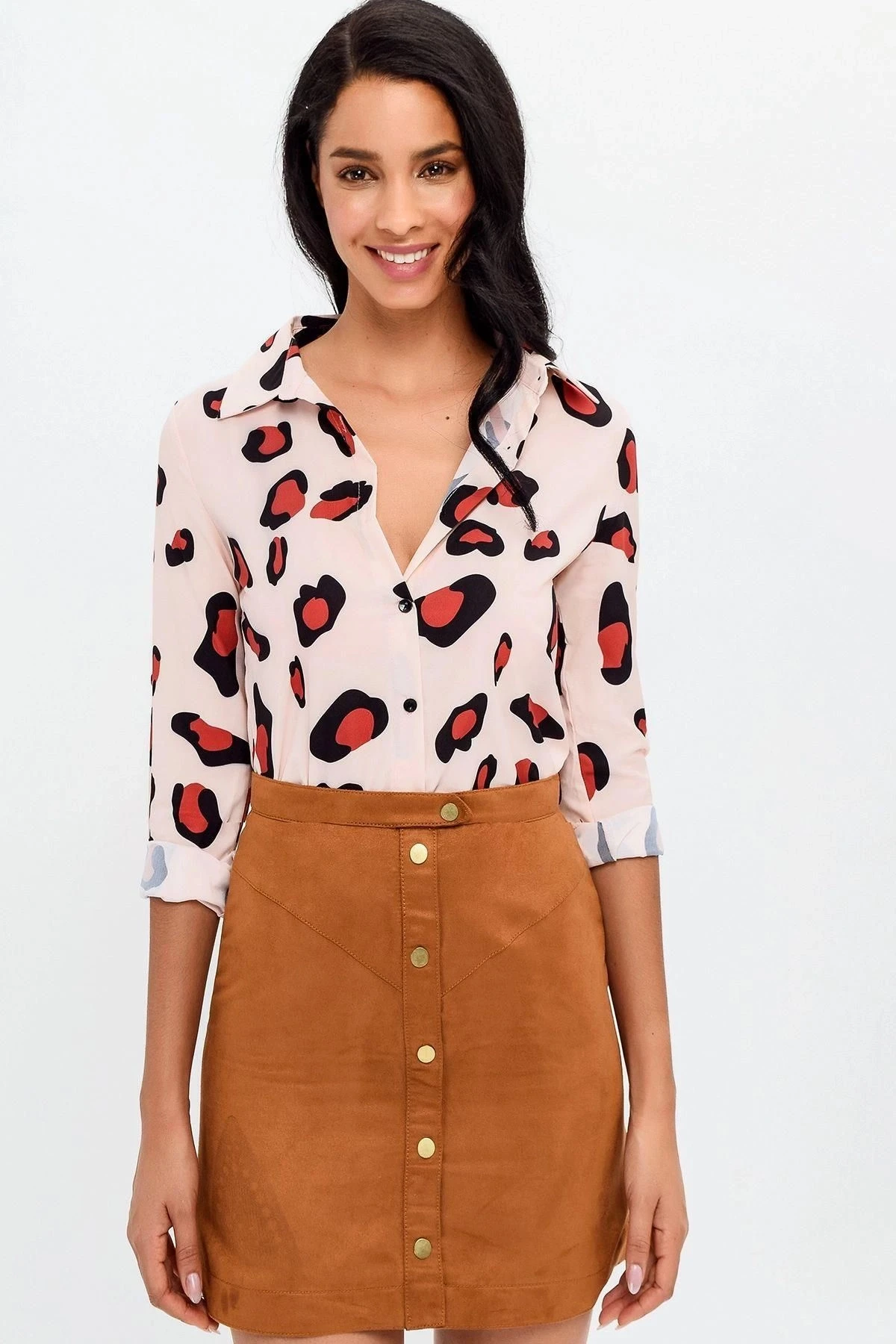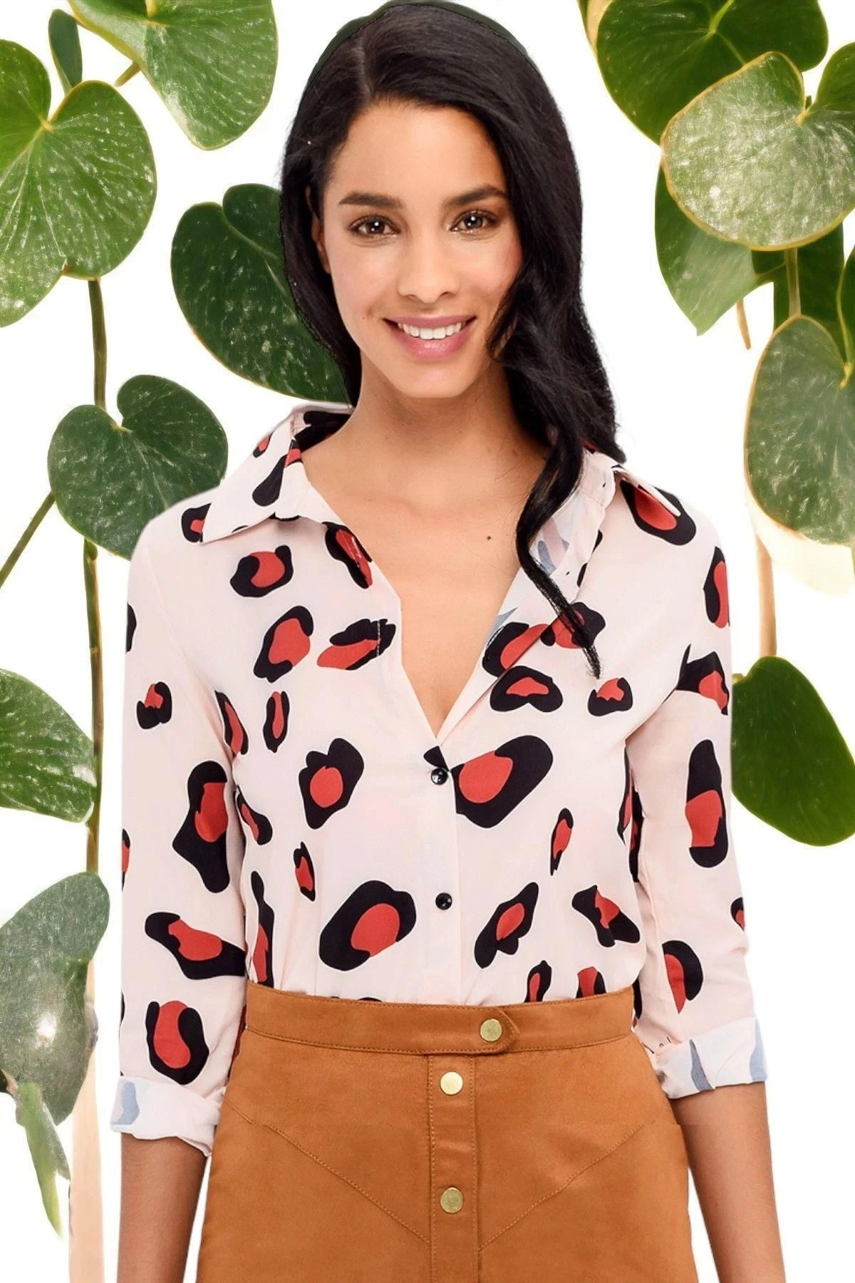 Kadın Ekru Leopar Desenli, Klasik Yaka, Uzun Kol, Regular Kesim, Standart Boy Gömlek
