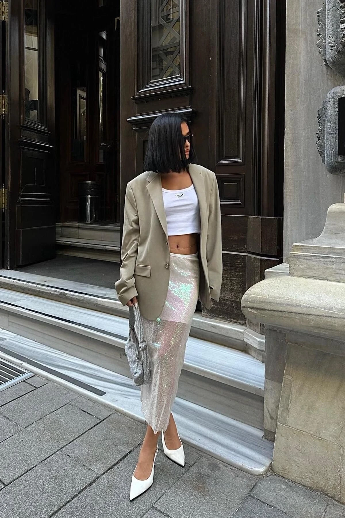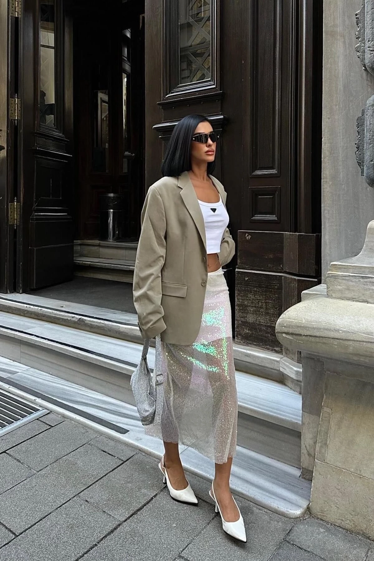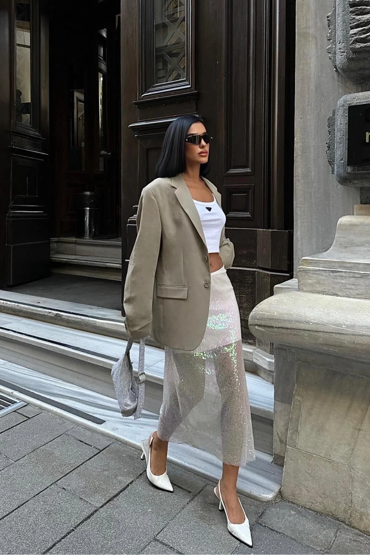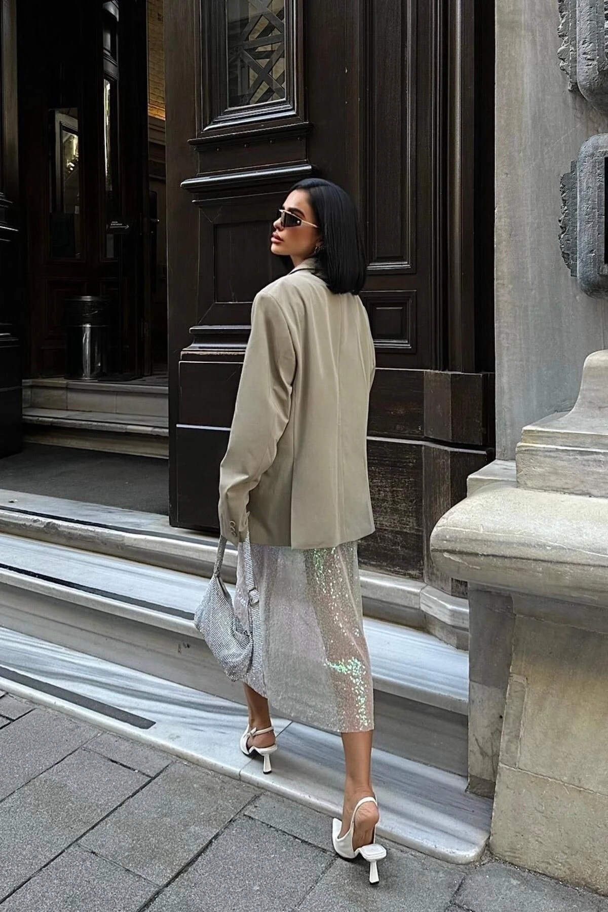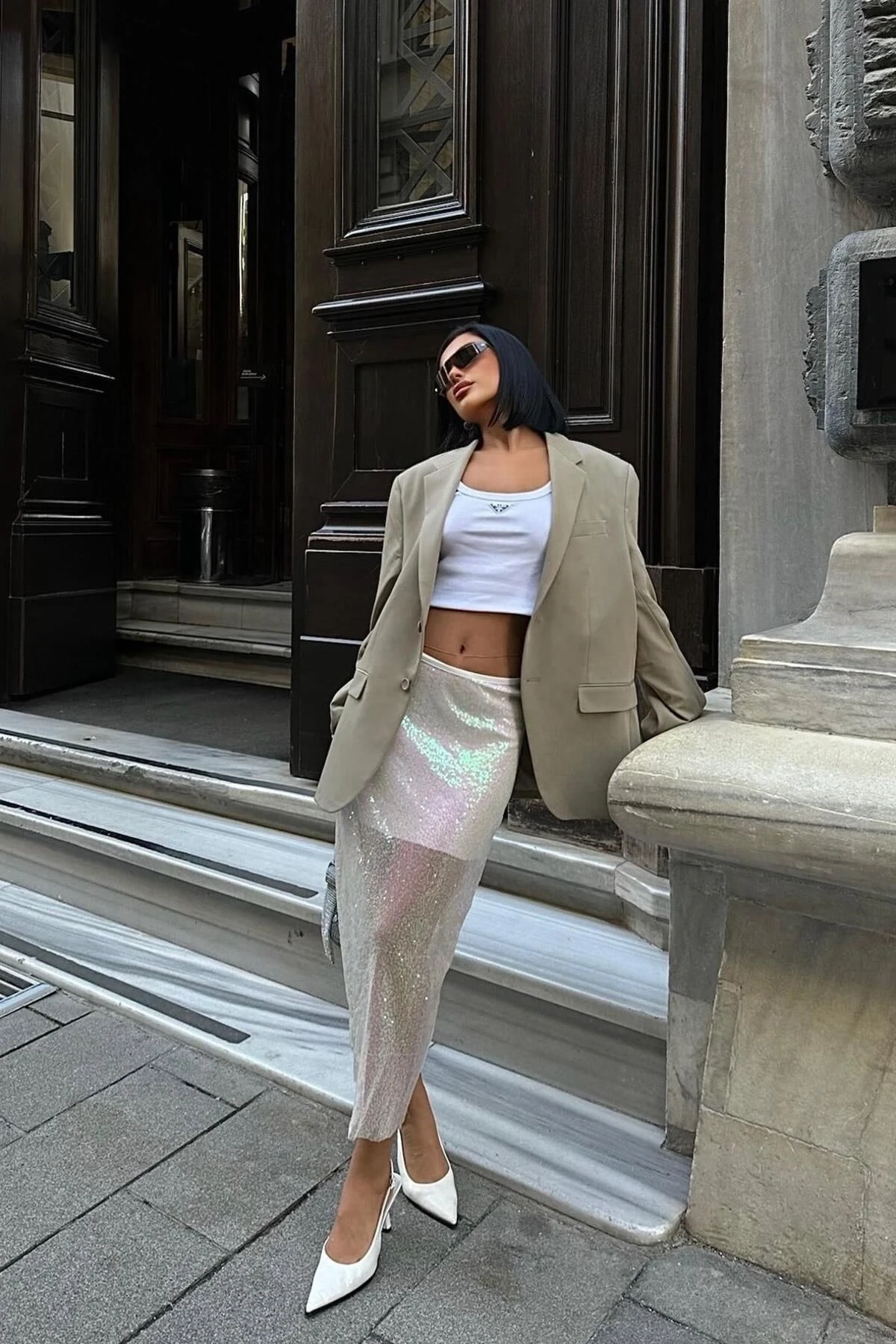 Kadın Ekru Parlak Polyester Pulpayet Midi Etek