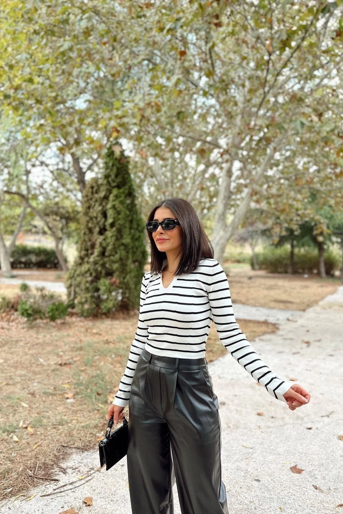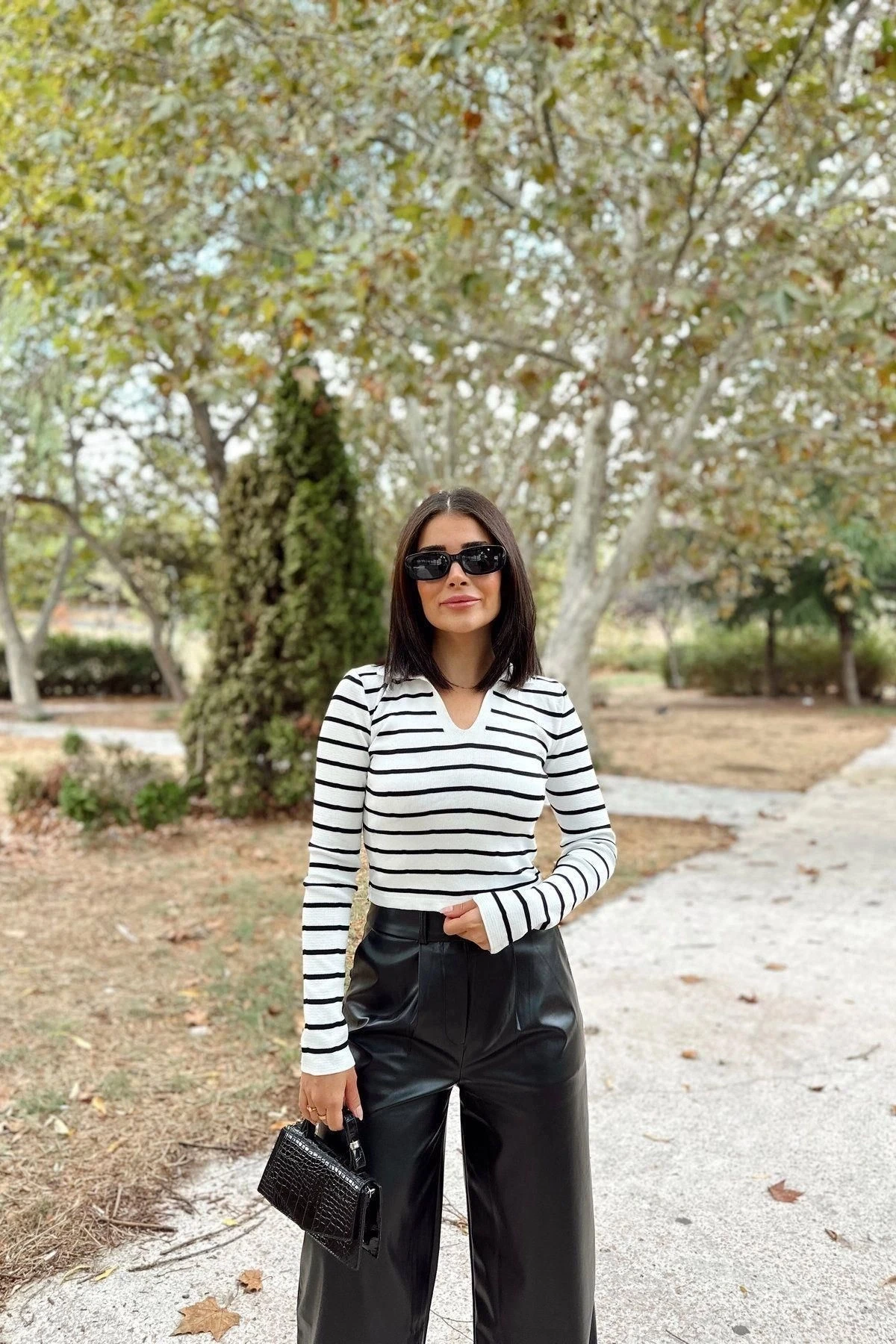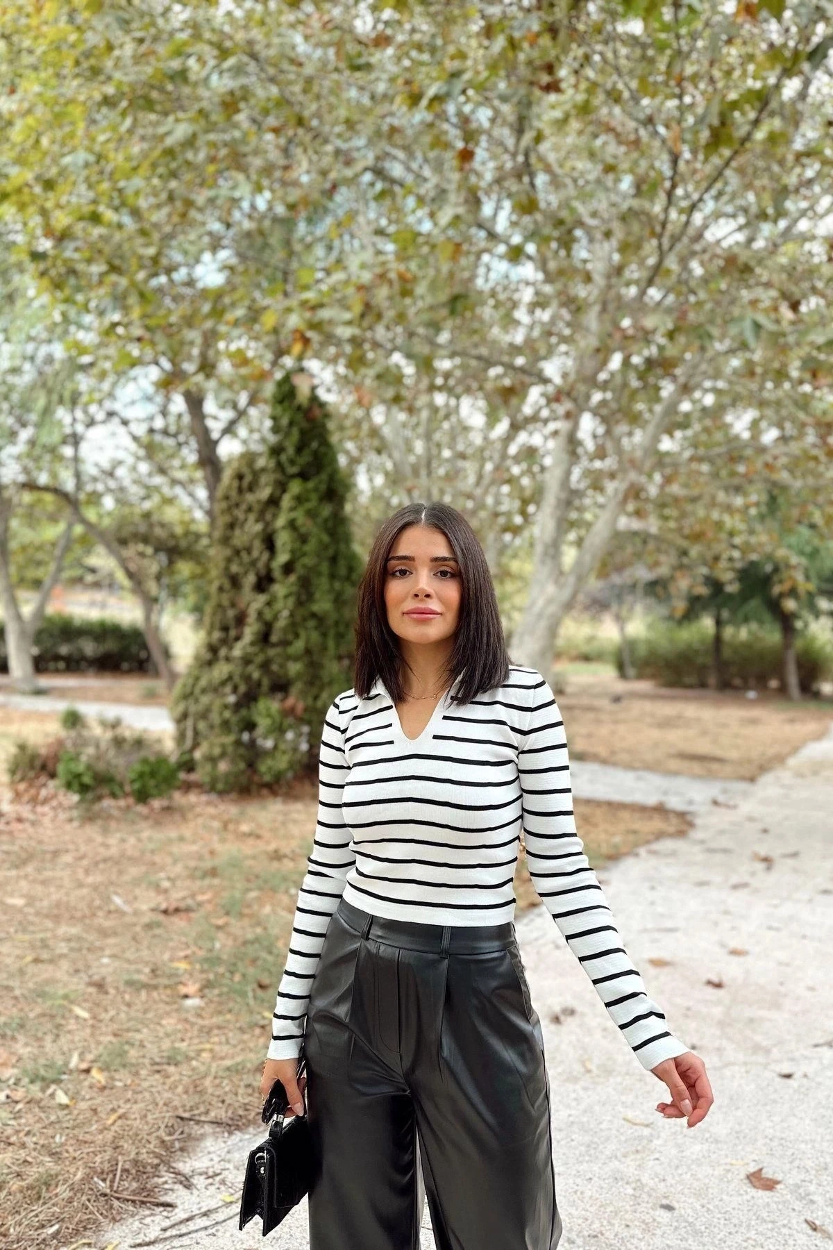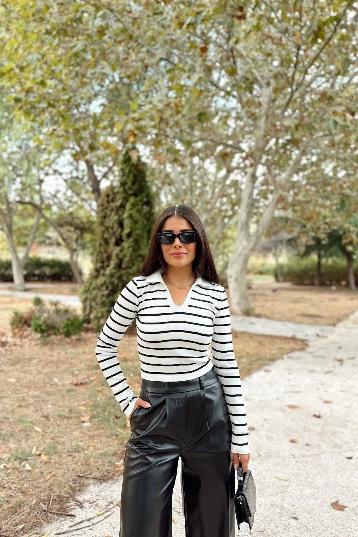 Kadın Ekru Polo Yaka, Uzun Kol, Vucüda Oturan Kalıp, Esnek Kumaş, Çizglili Desen, Triko Bluz