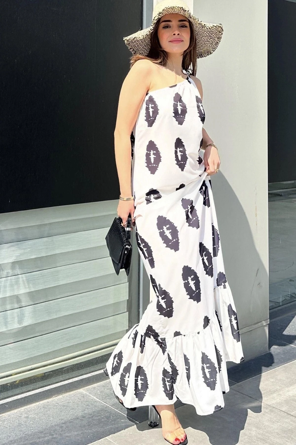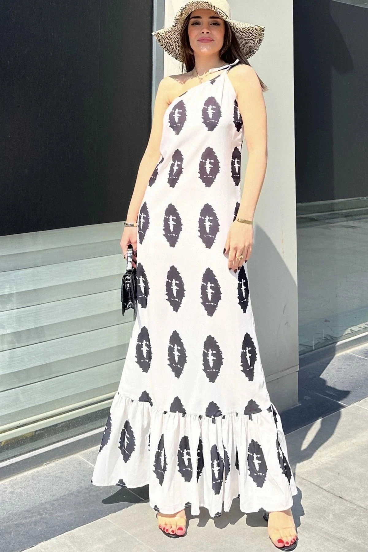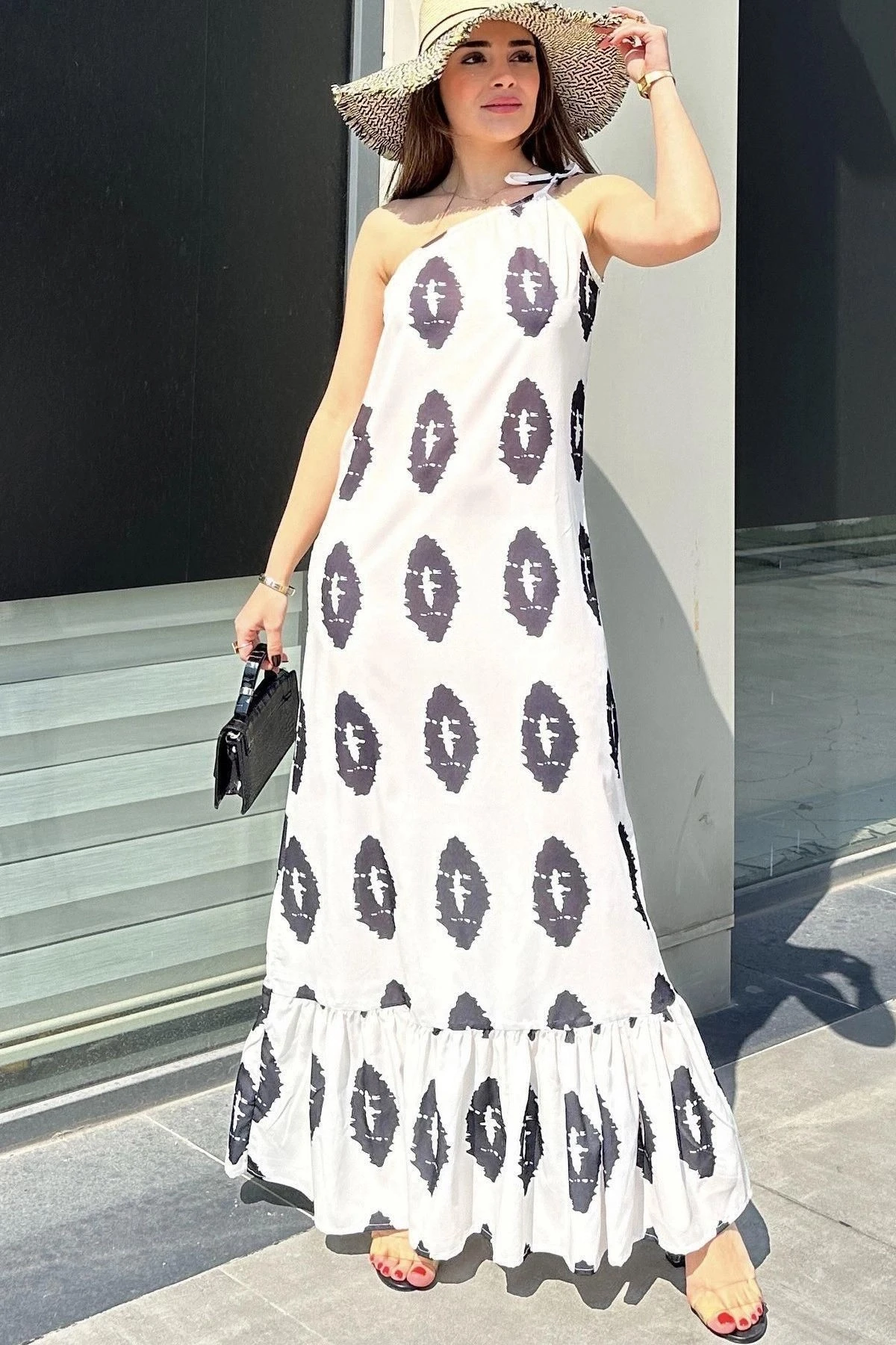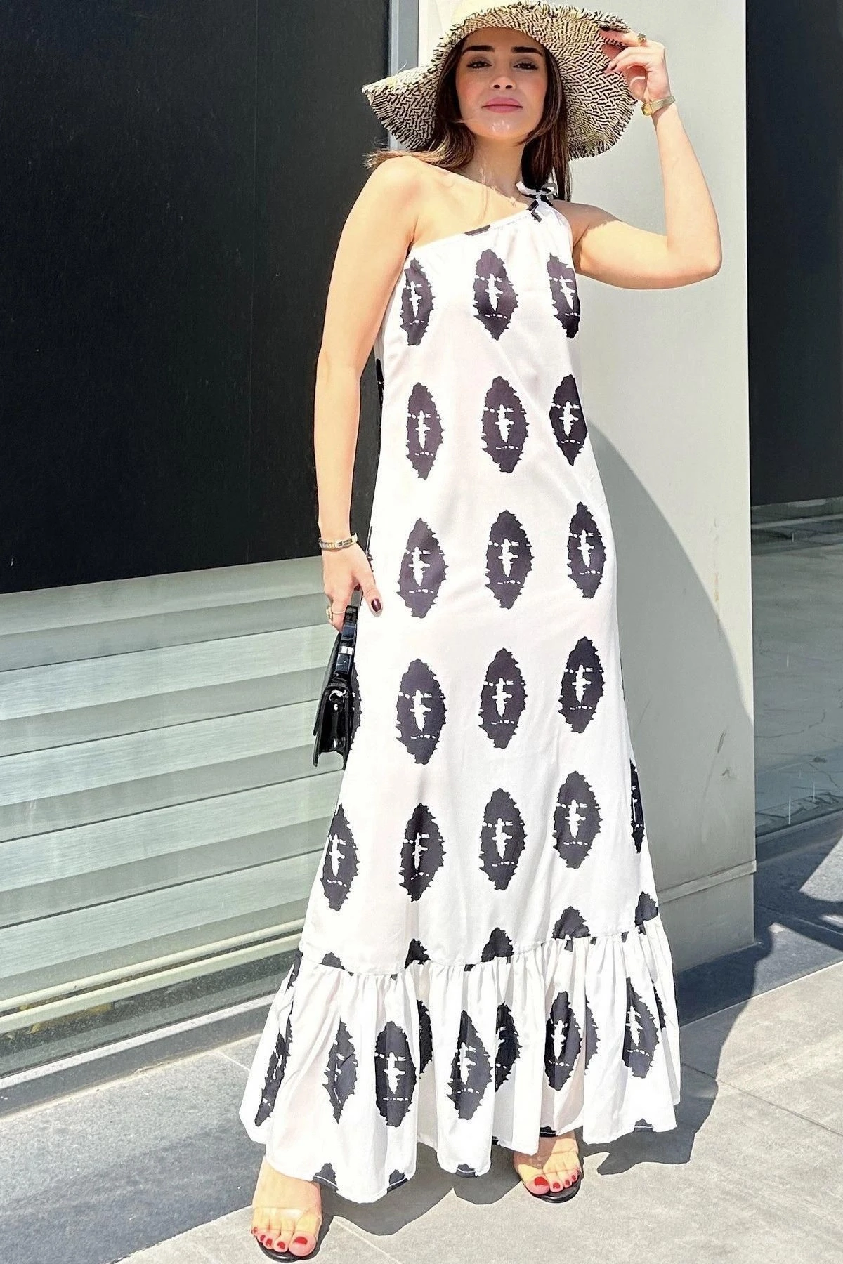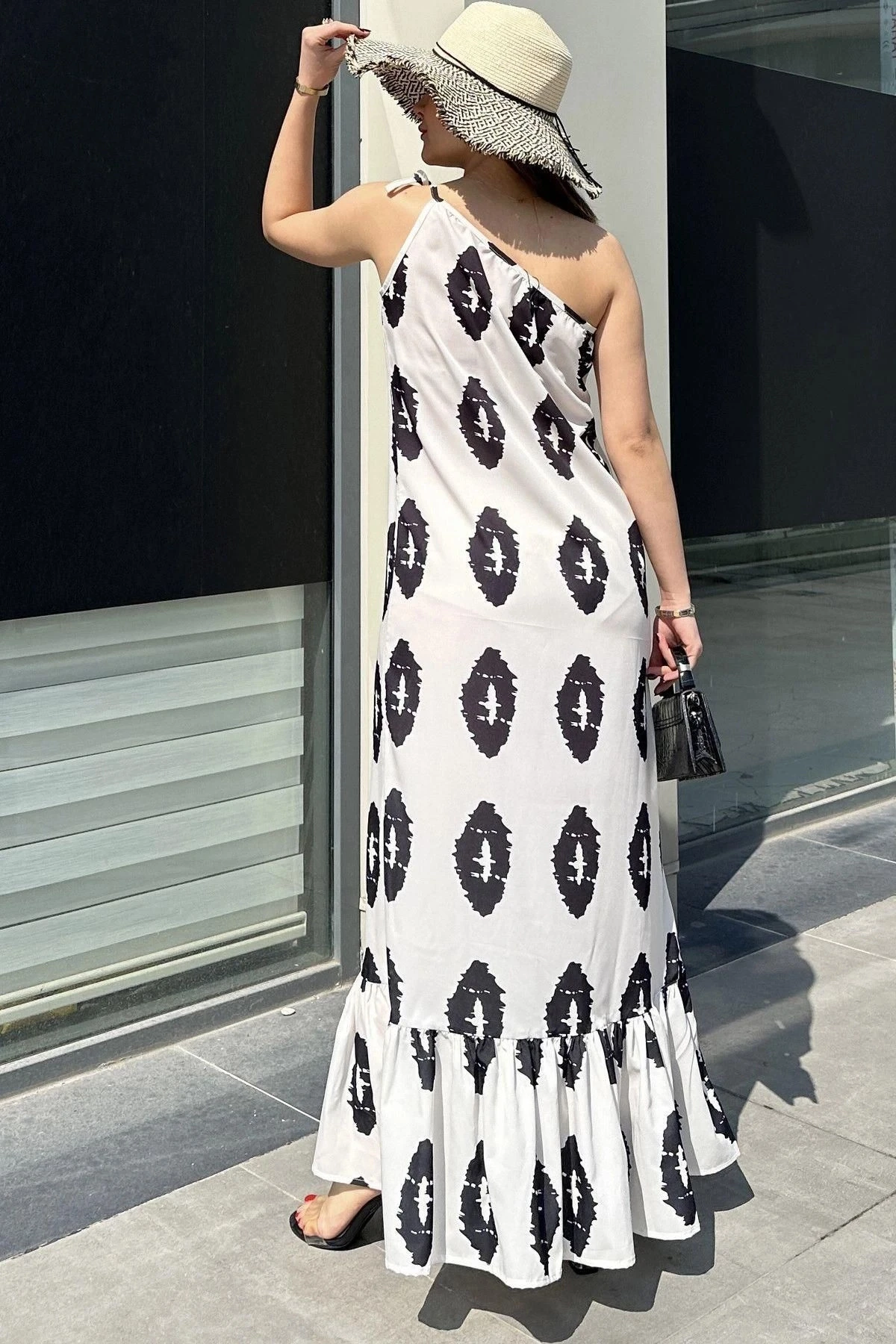 Kadın Ekru Tek Omuz İnce Askılı, Vucuda Oturan Kesim, Eteği Fırfırlı Uzun Mos Krep Elbise