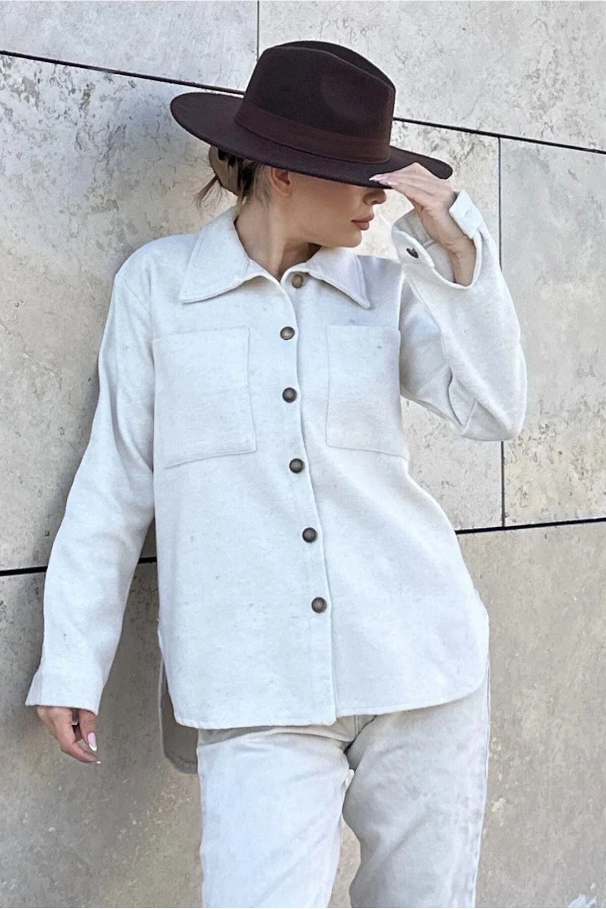 Kadın Ekru Uzun Kol, Çift Cepli, Eteği Oval Kesim, Kaşe Gömlek Ceket