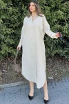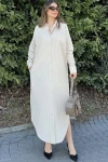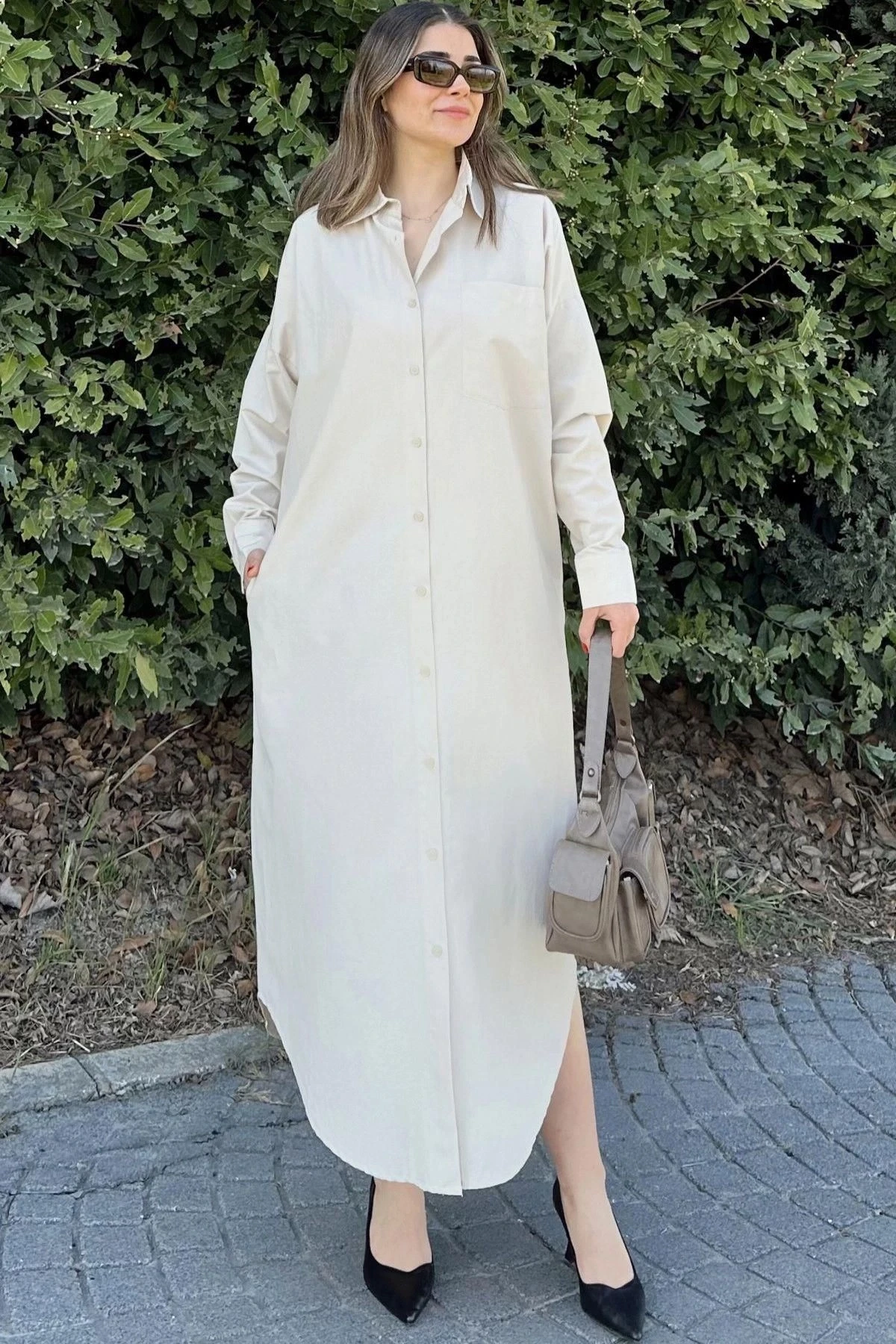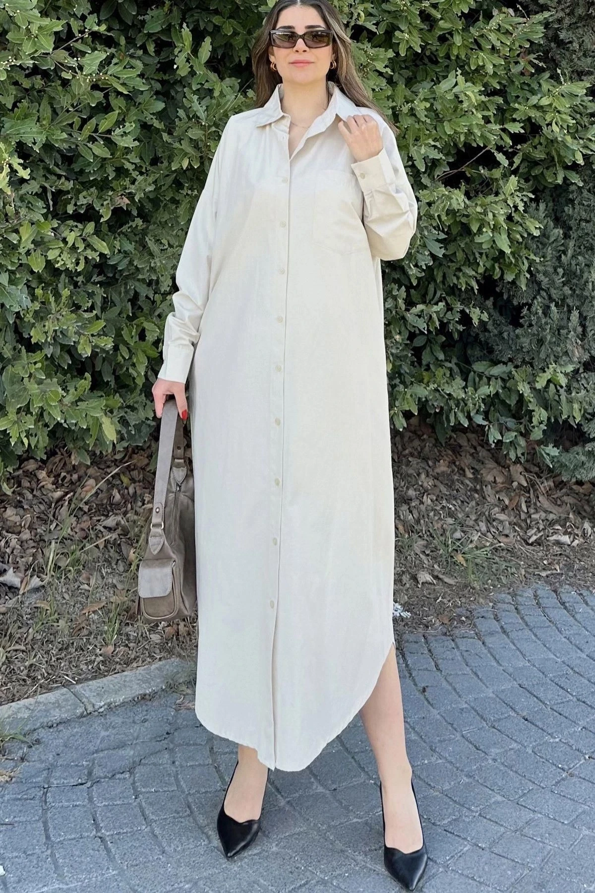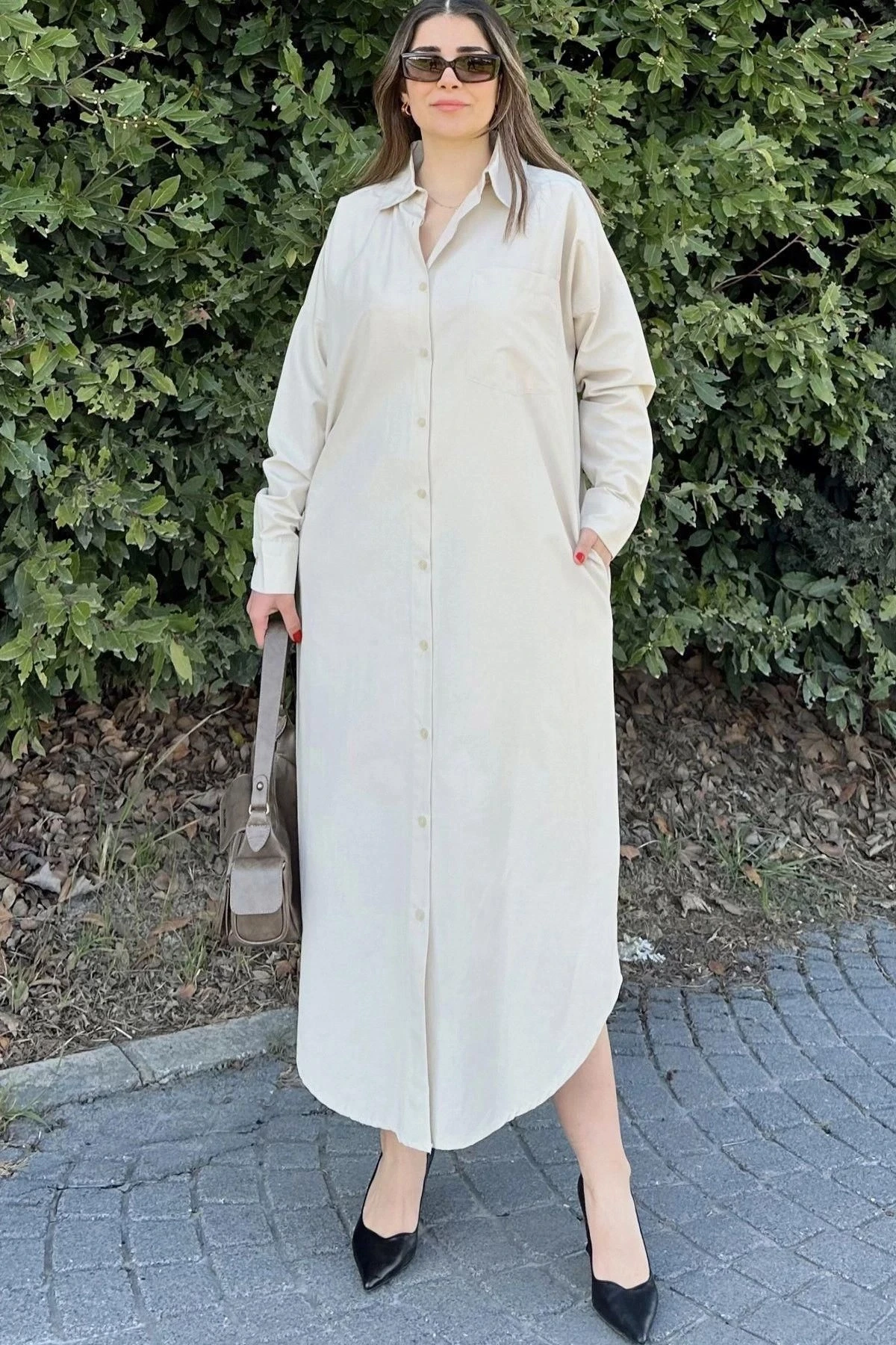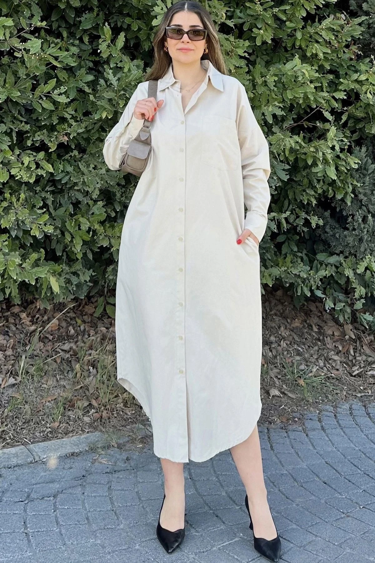Kadın Ekru Uzun Kol, Eteği Oval Kesim, Uzun Ve Salaş, Poplin Gömlek Elbise