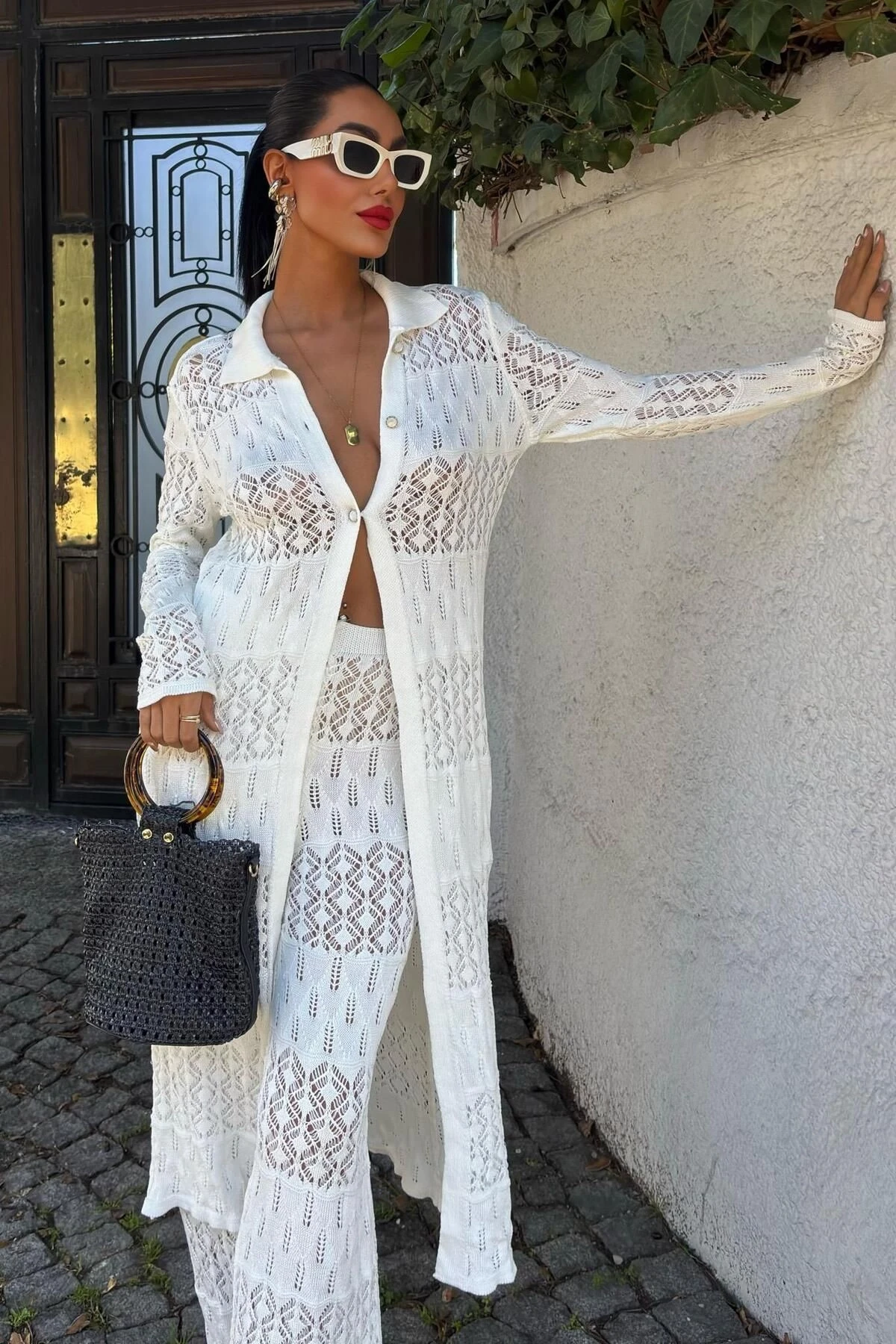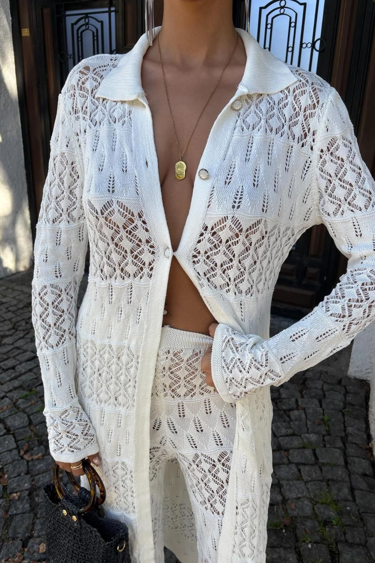 Kadın Ekru Uzun Vortex Viscon Hırka Takım