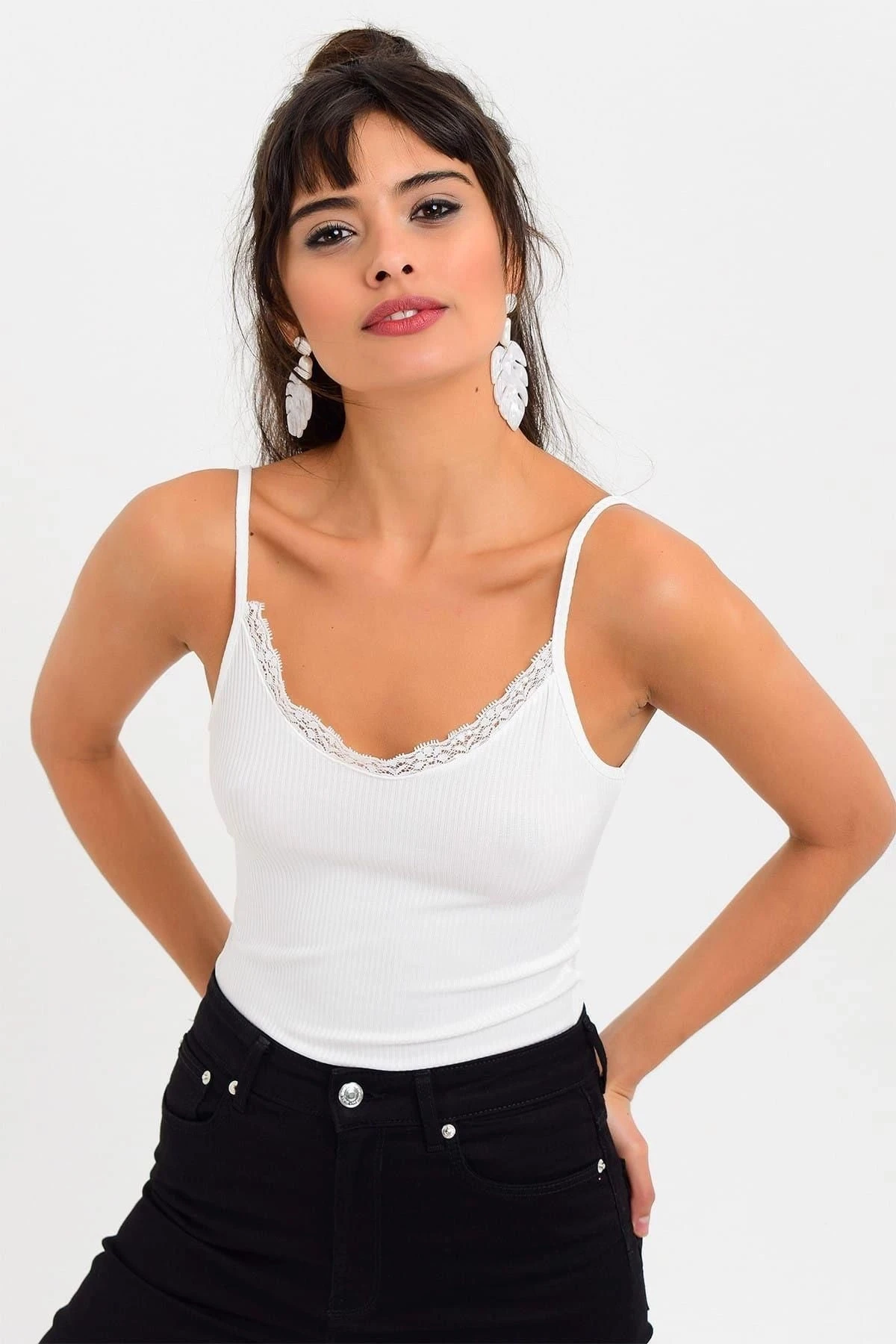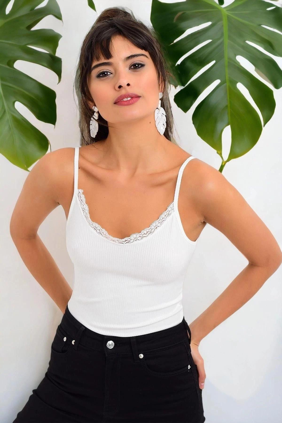 Kadın Ekru V Yaka Askılı Dantel Detaylı Regular Kesim Standart Boy T-shirt
