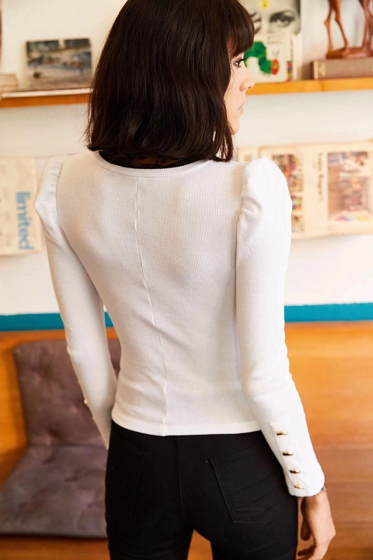 Kadın Ekru V Yaka Uzun Kol Dantel Detaylı Düğmeli Regular Kesim Standart Boy Bluz