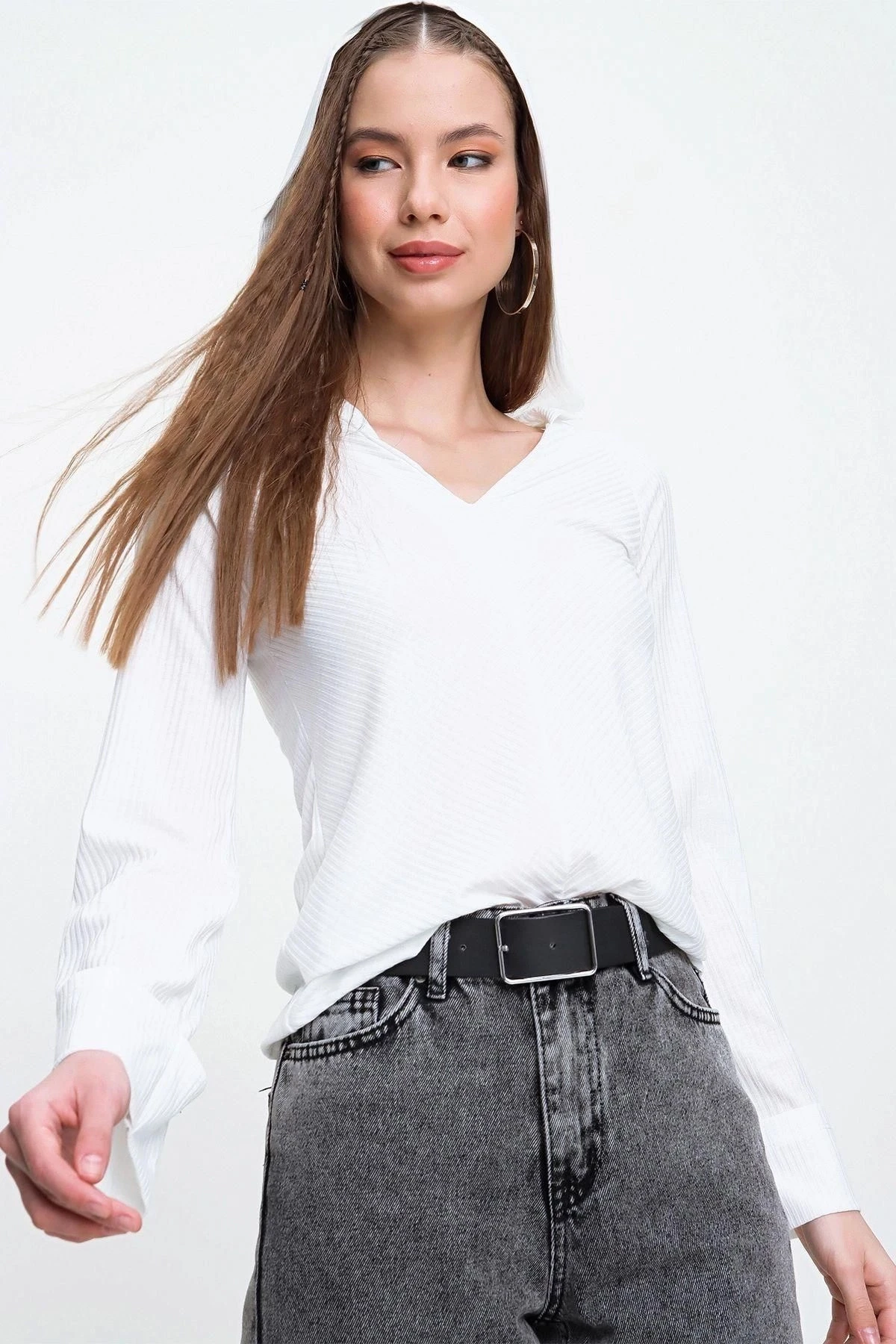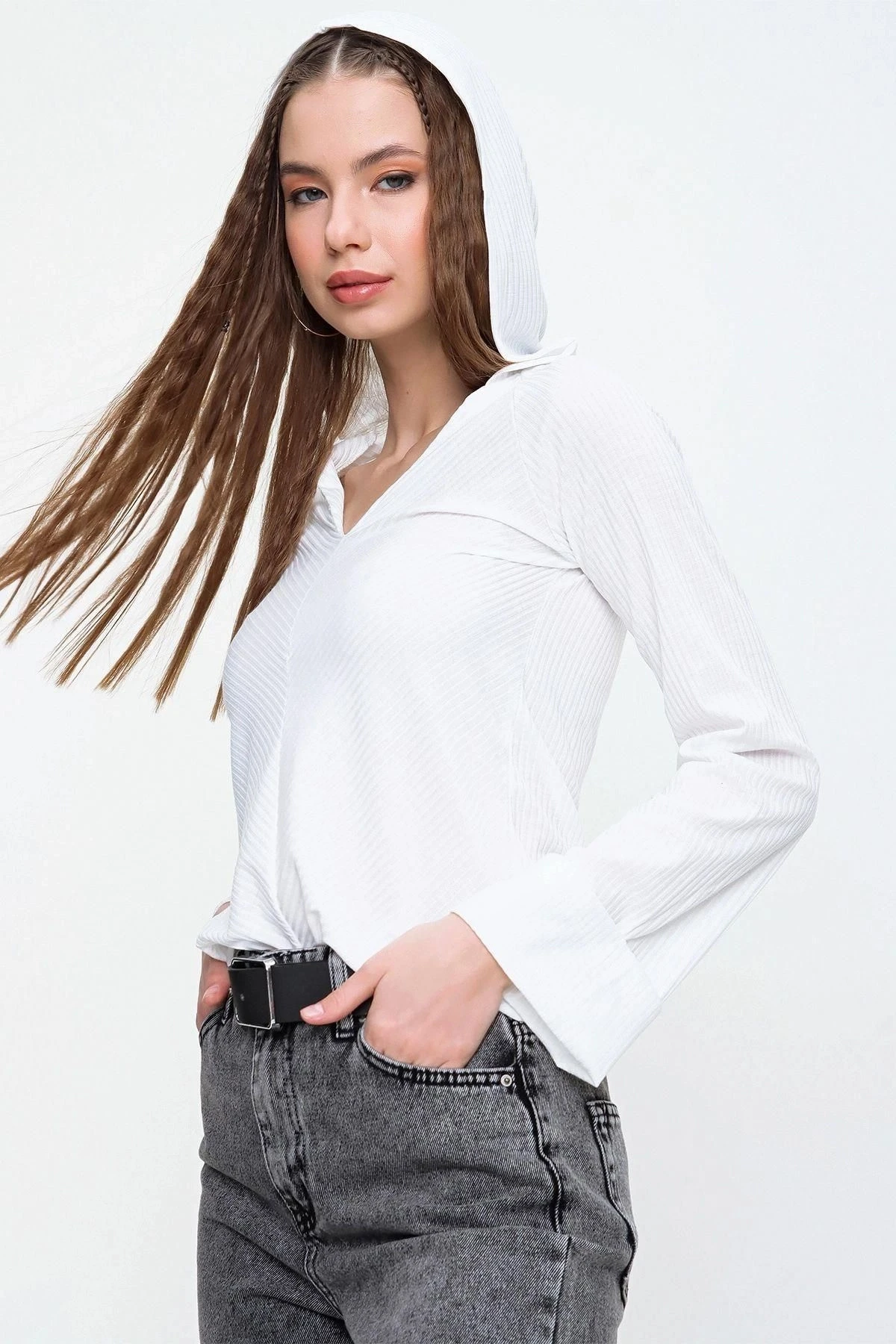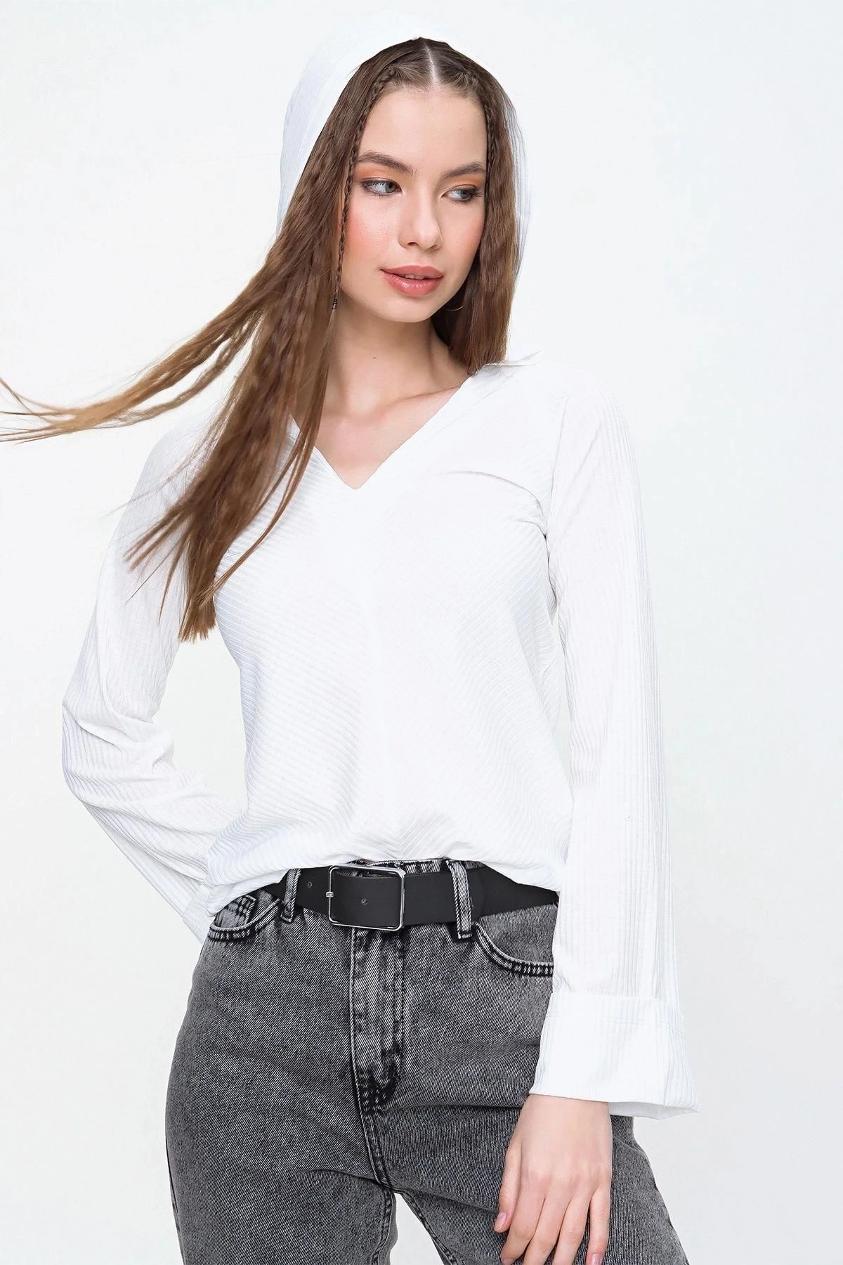 Kadın Ekru V Yaka, Uzun Kol, Kapüşonlu, , Düz Kesim ve Standart Boy Bluz Sweatshirt