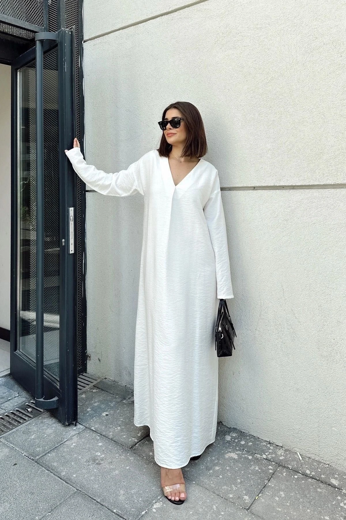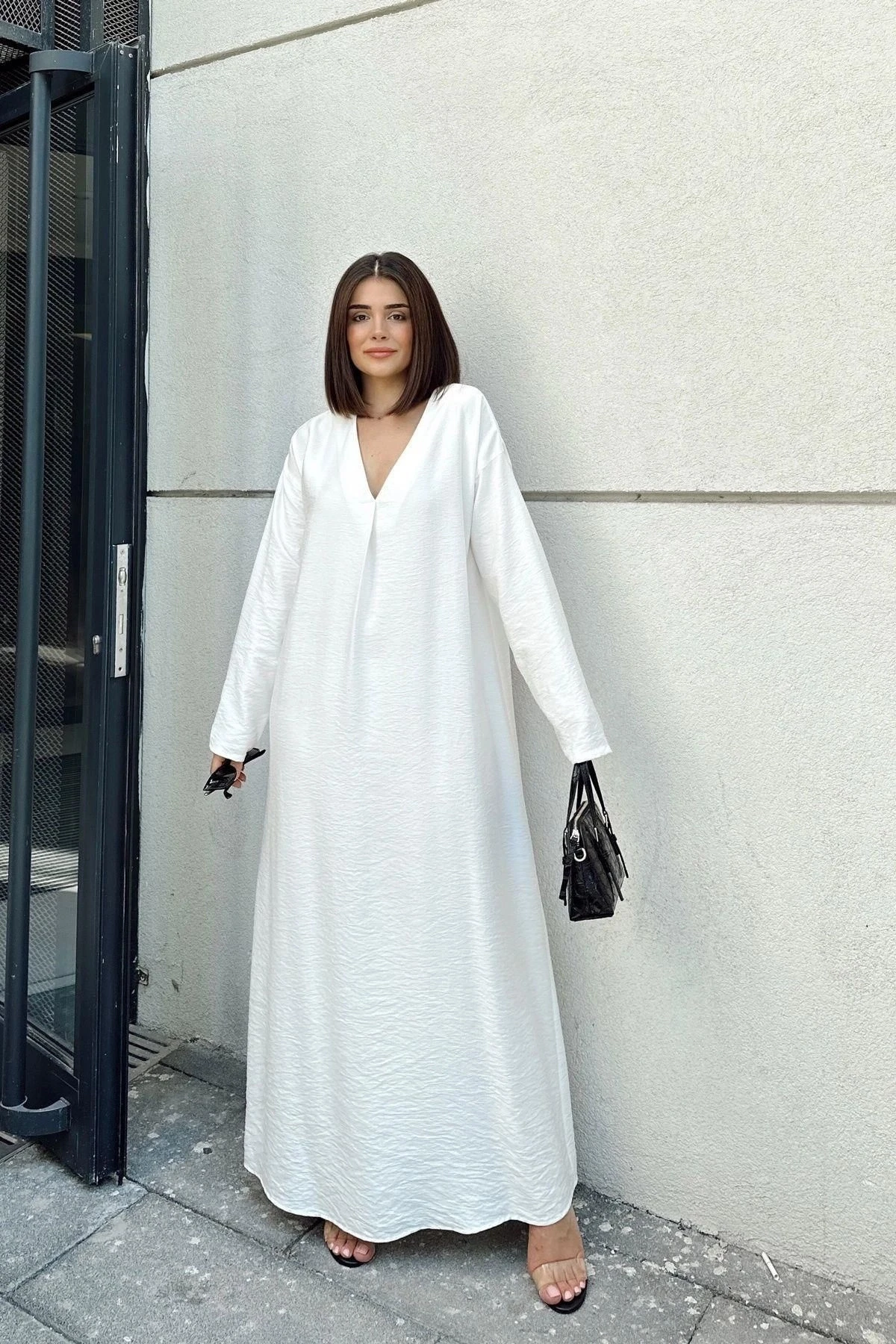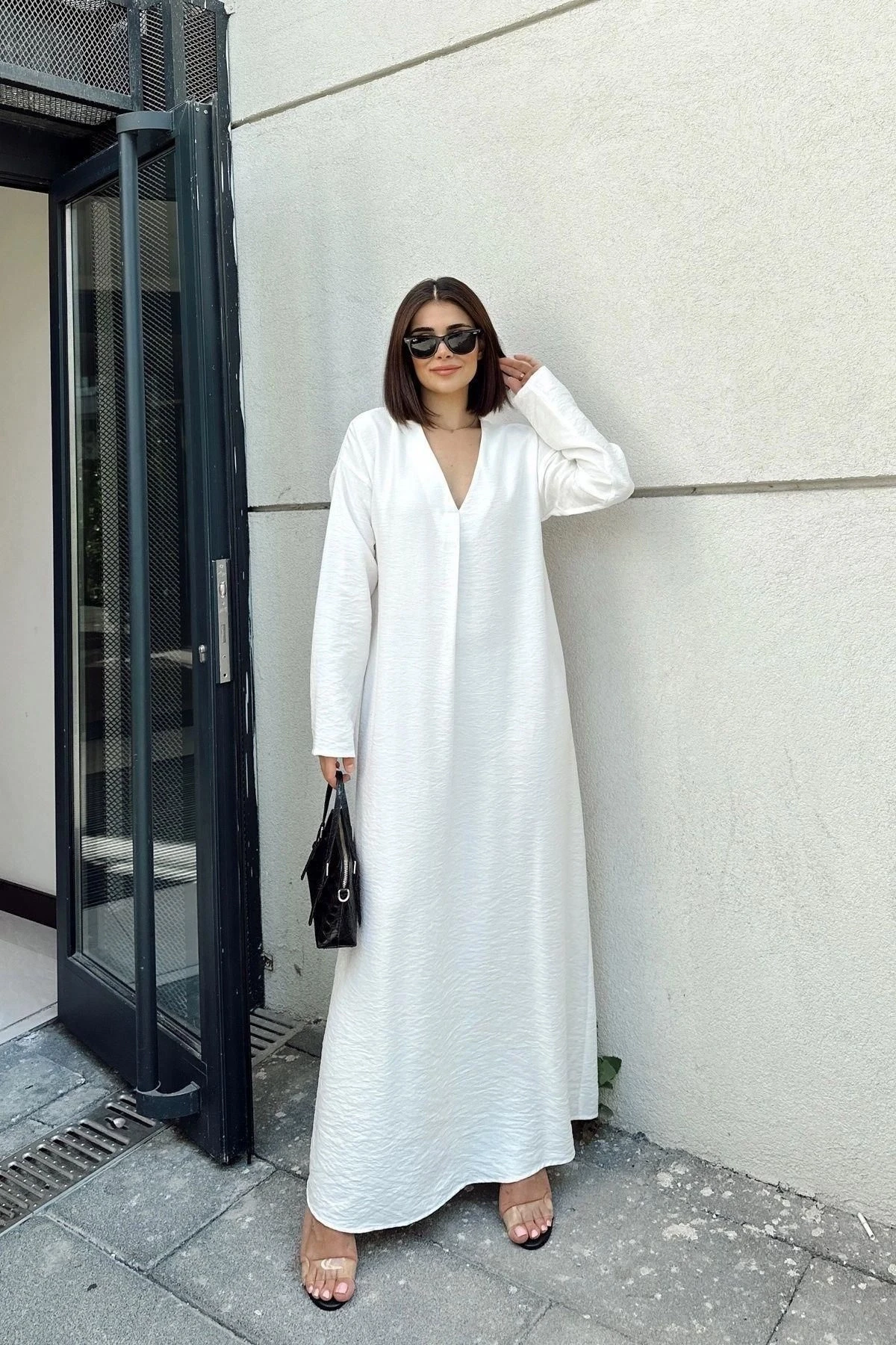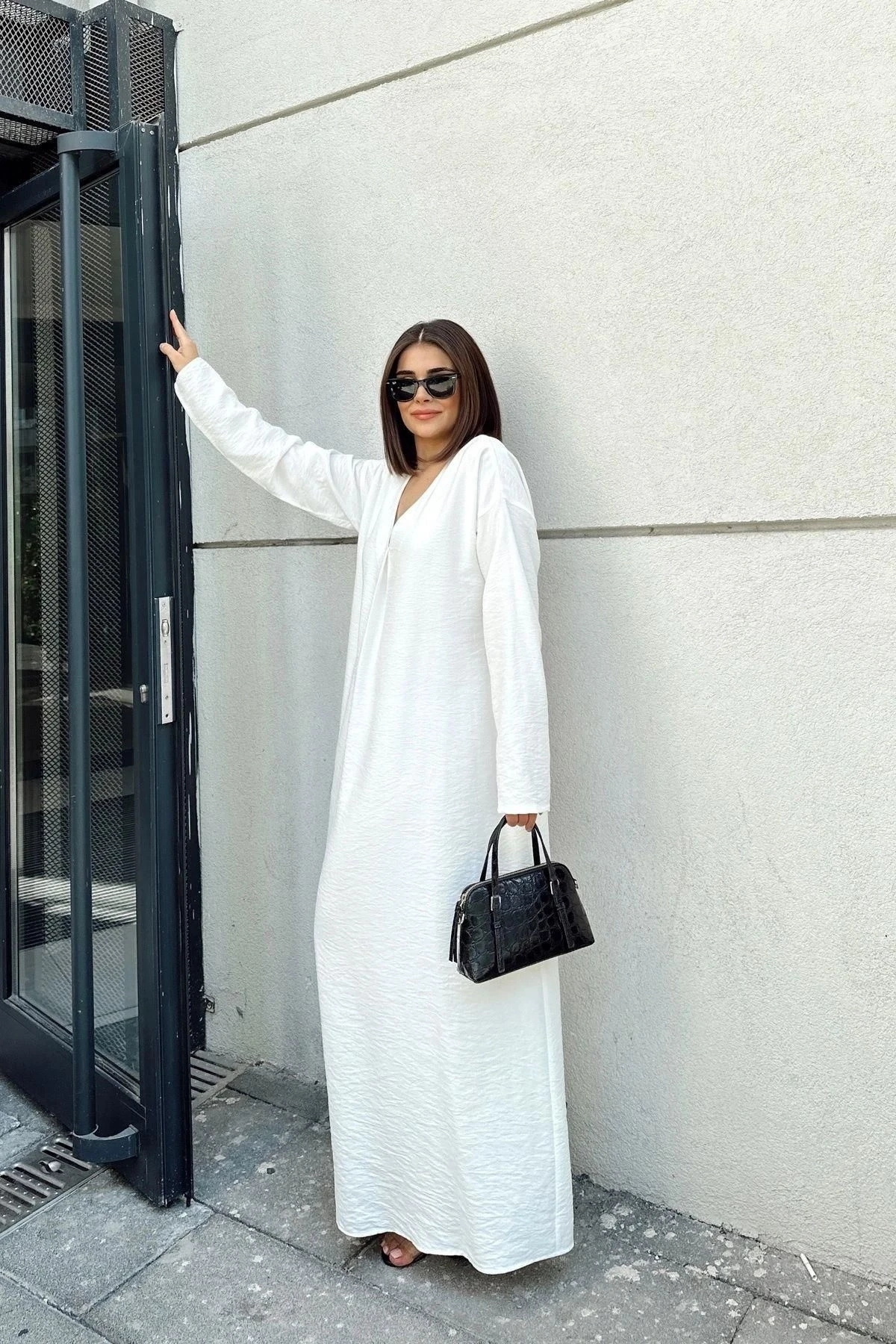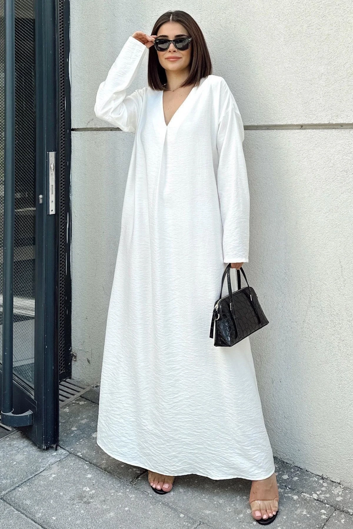 Kadın Ekru V Yaka, Uzun Kol, Önü Katlama Detay, Basic A Kesim, Oversize Uzun Elbise