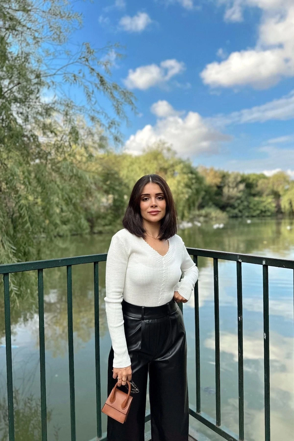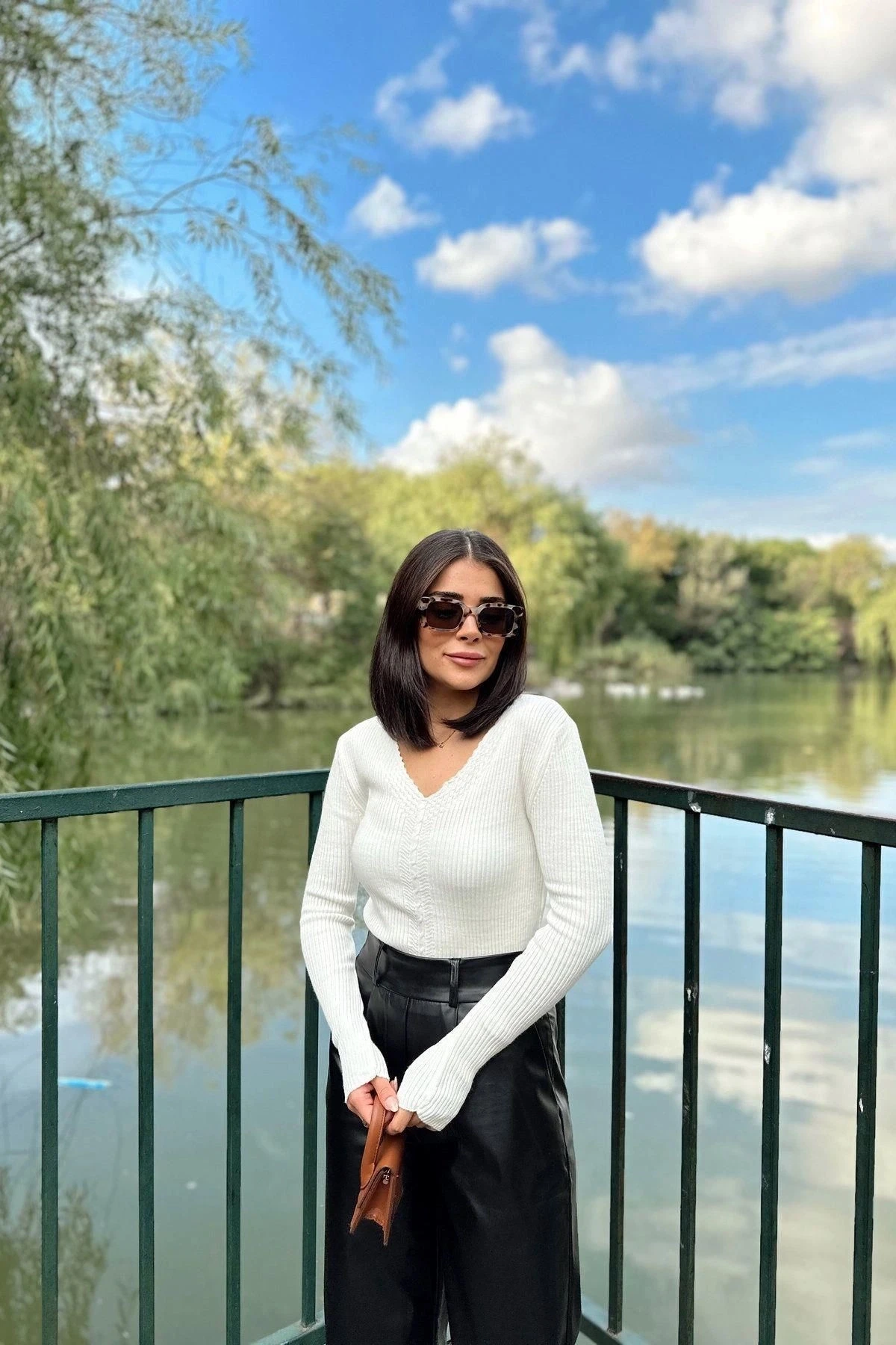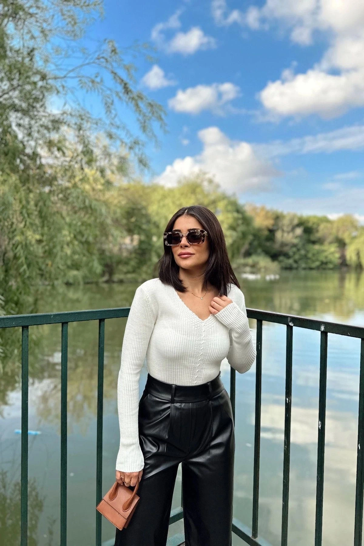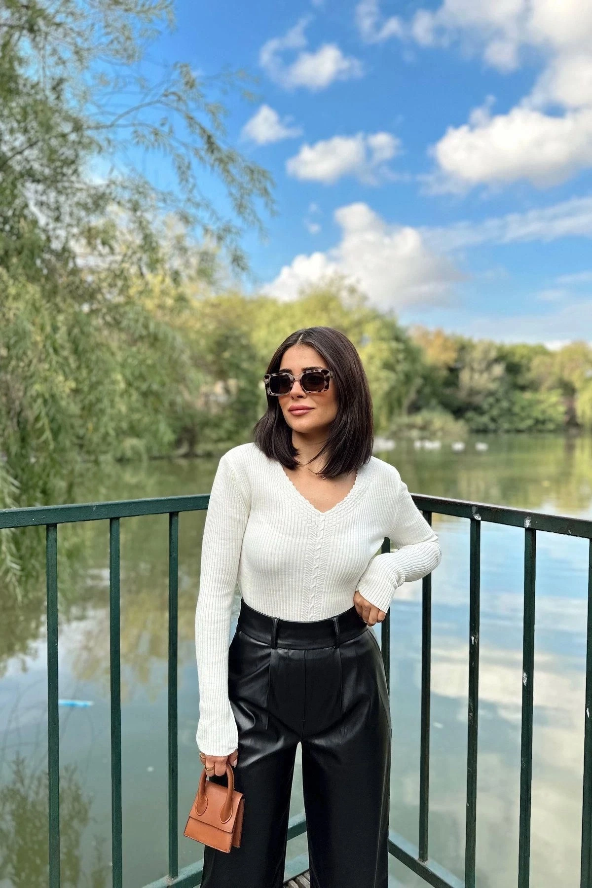 Kadın Ekru V Yaka, Uzun Kol, Vucüda Oturan Kalıp, Esnek Kumaş, Örgü Desen Triko Bluz