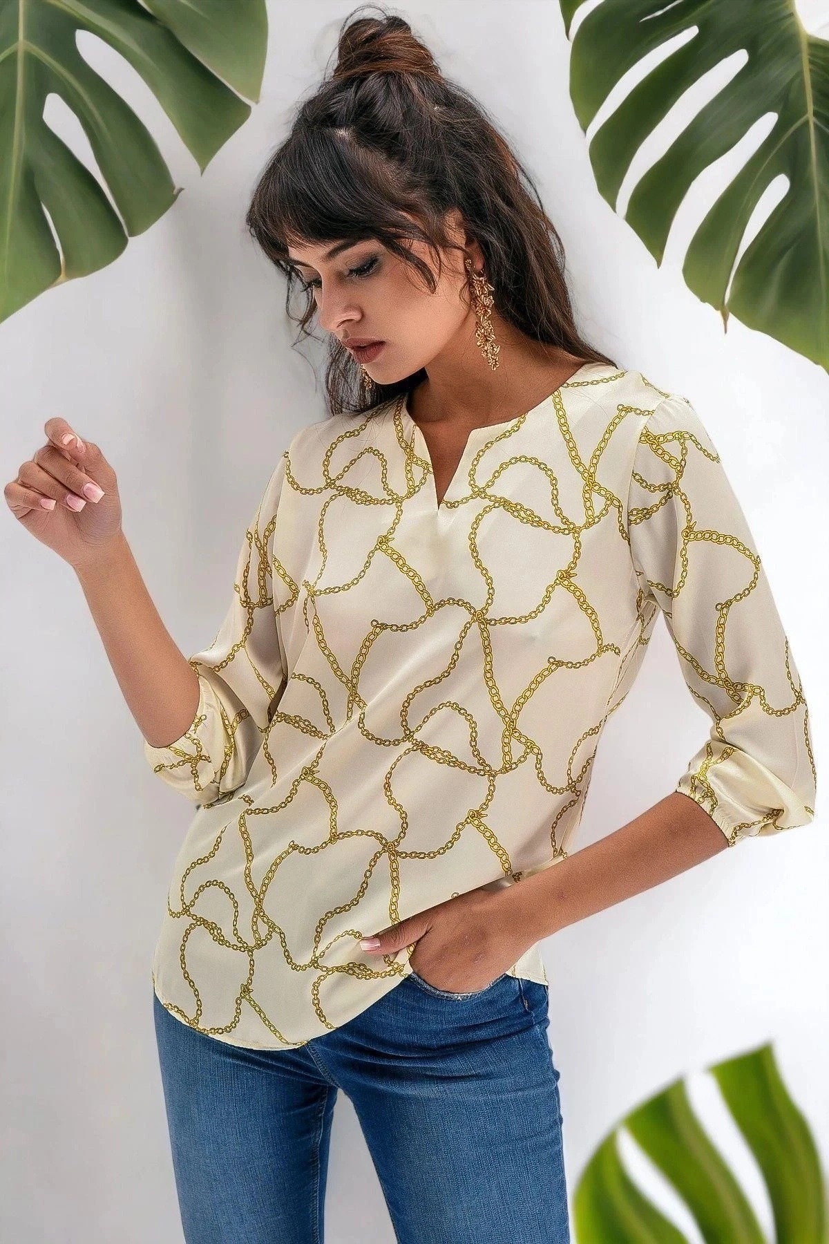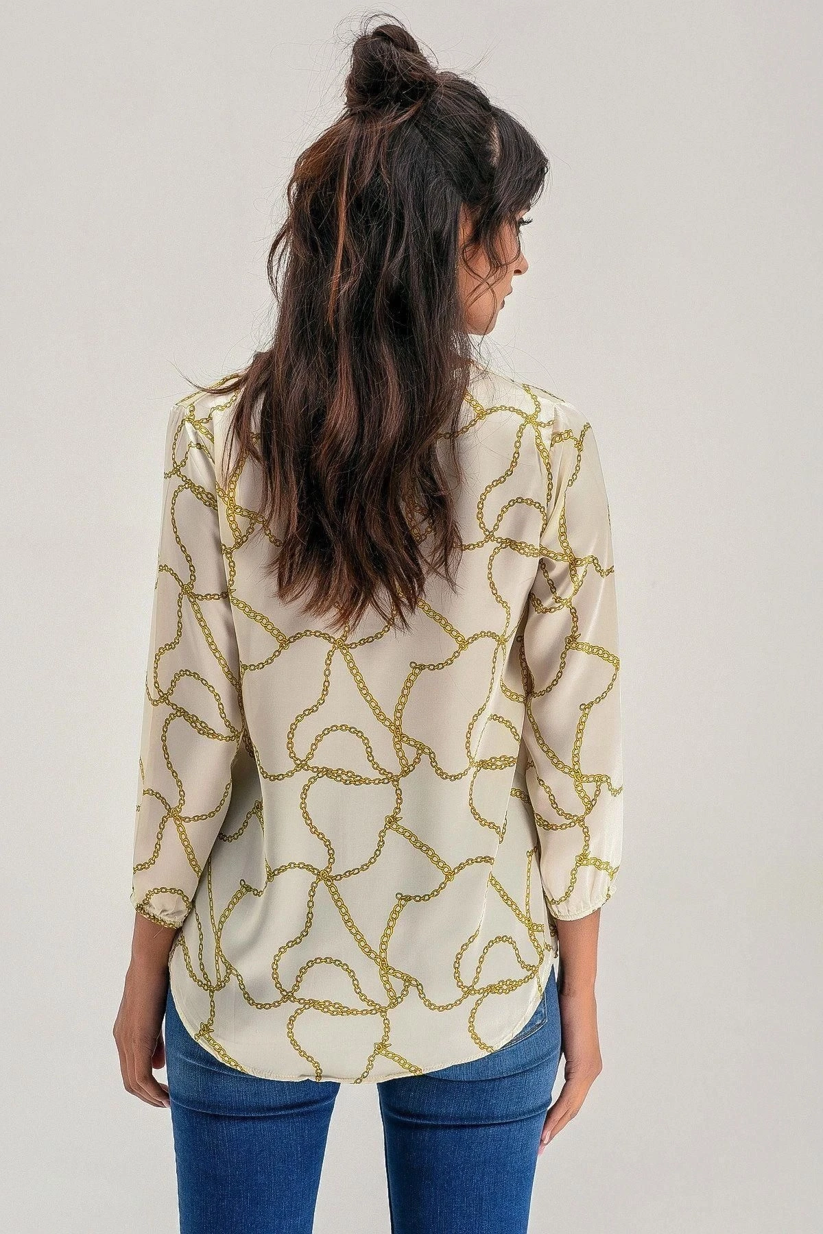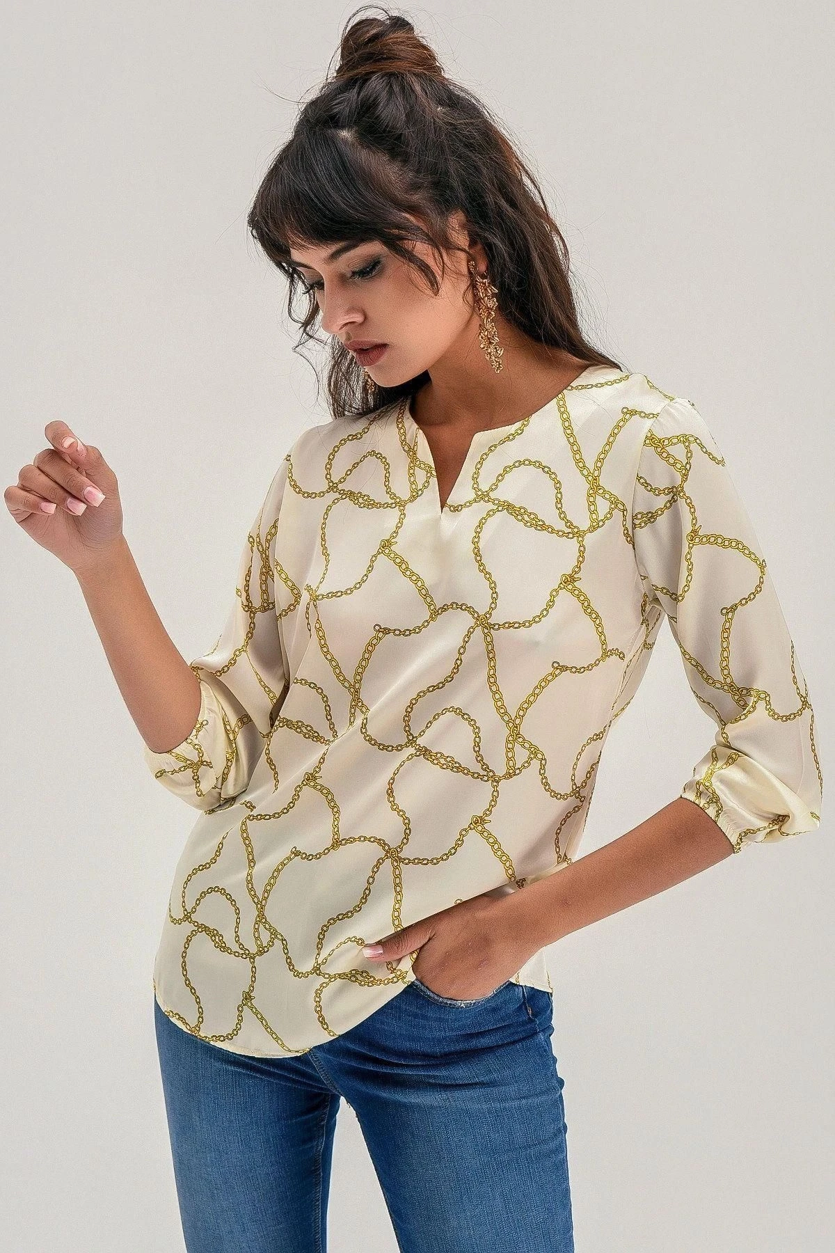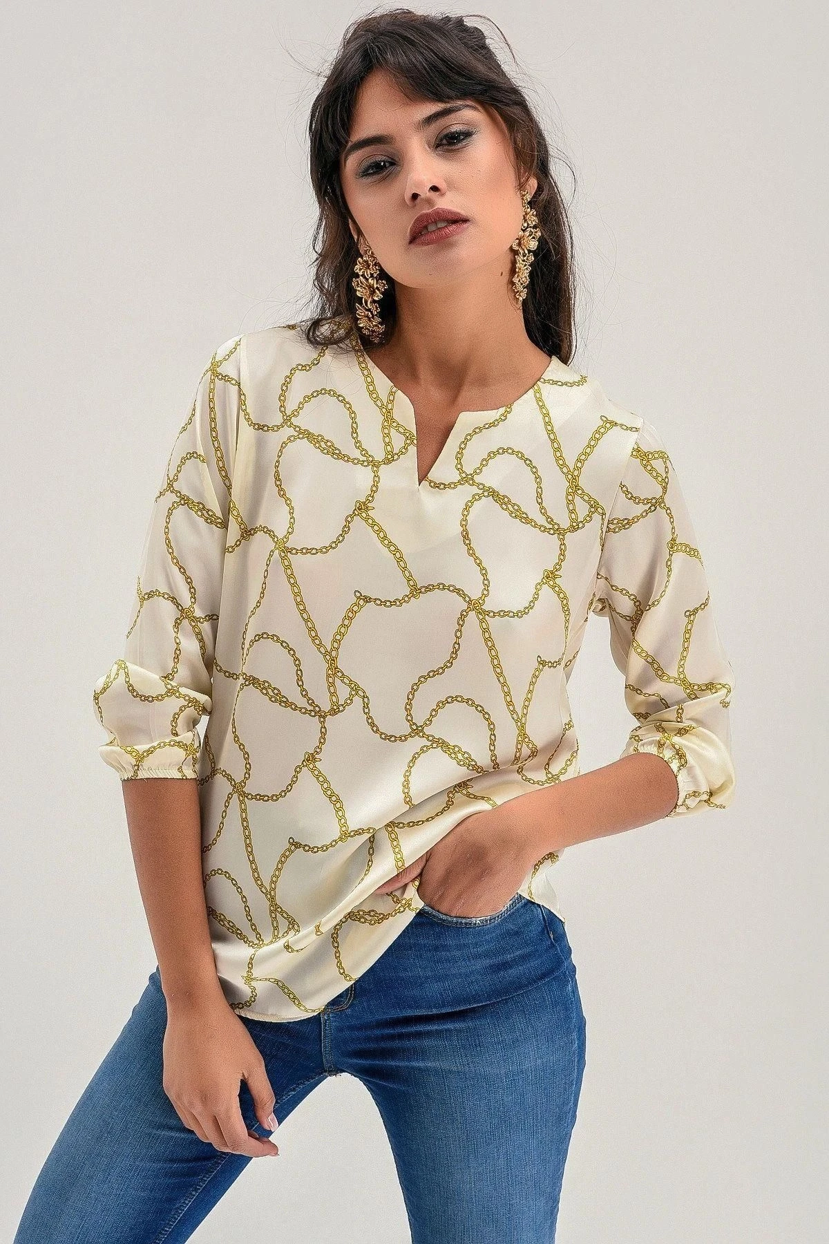 Kadın Ekru V Yaka Zincir Desenli Bluz, Truvakar Kol, Regular Kesim, Standart Boy