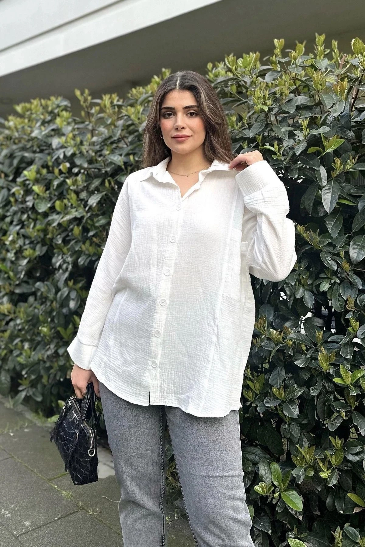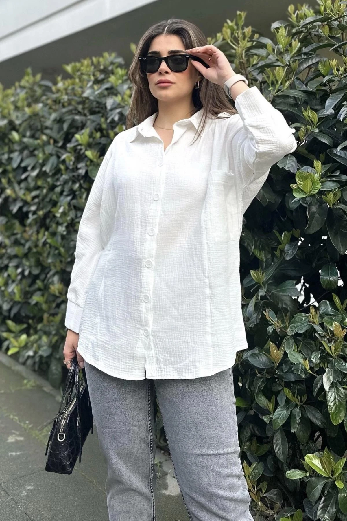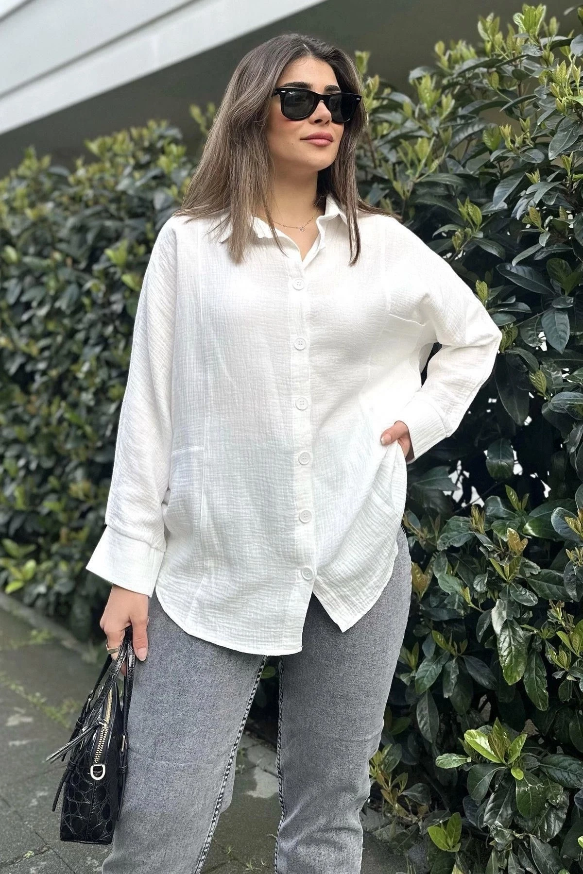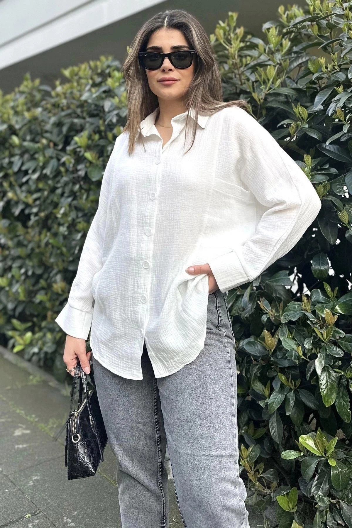Kadın ekru Yarasa Kol, Cep Detaylı, Salaş Müslin Gömlek
