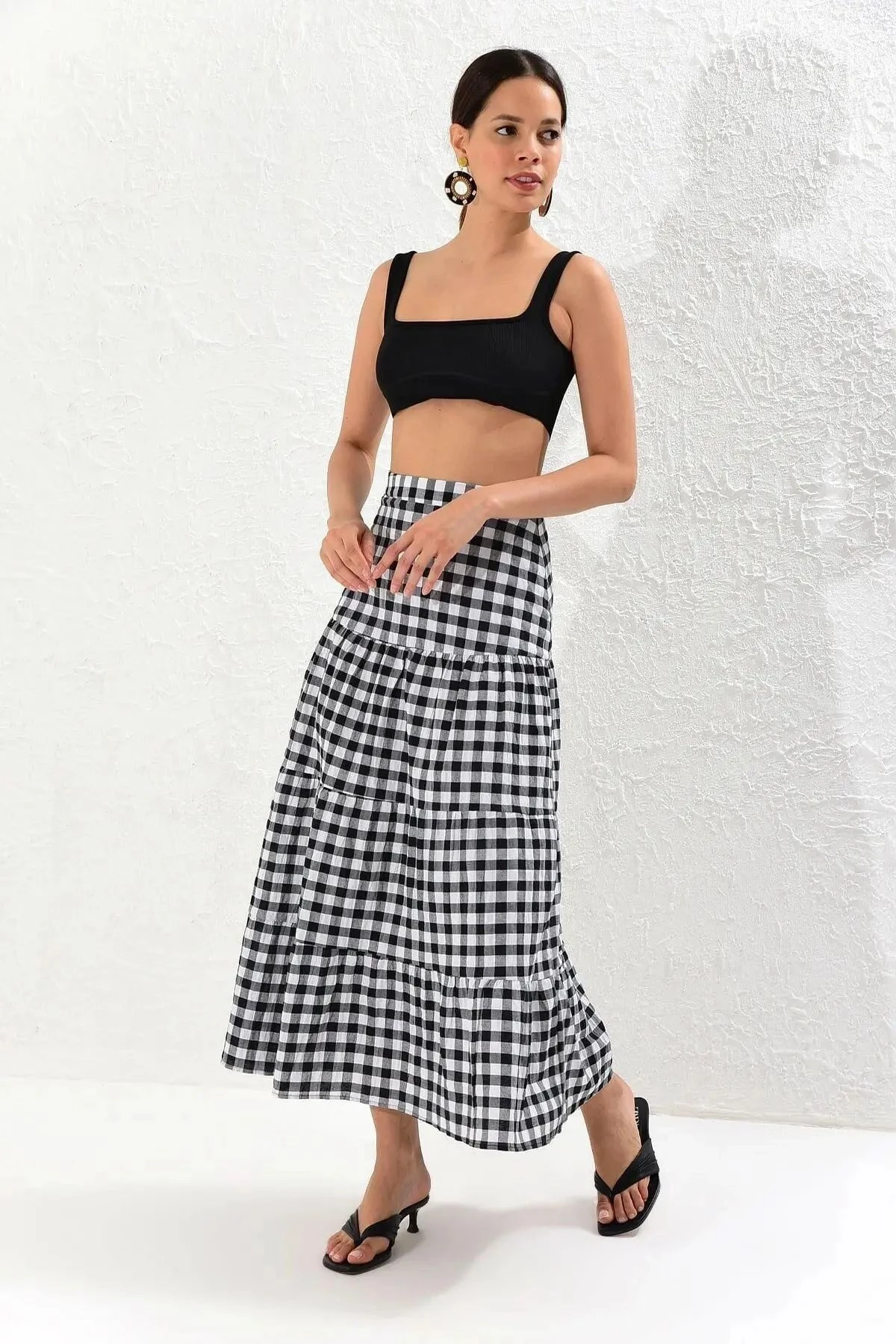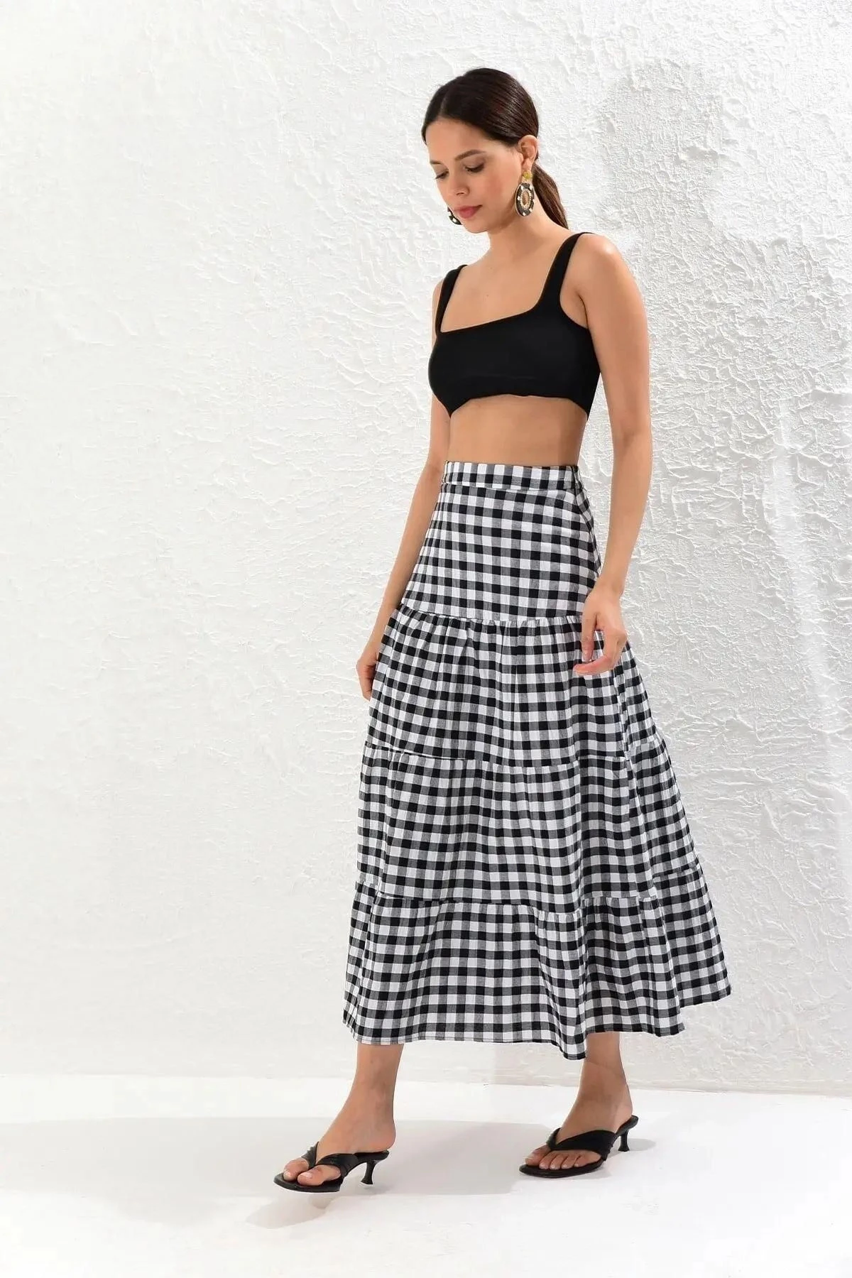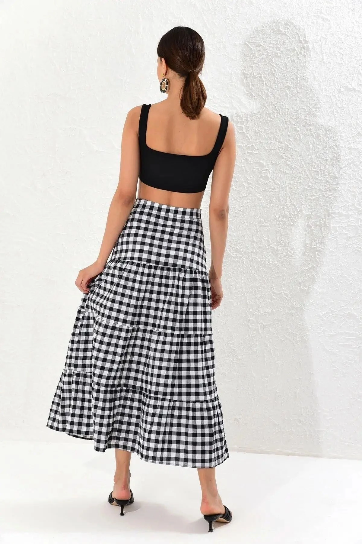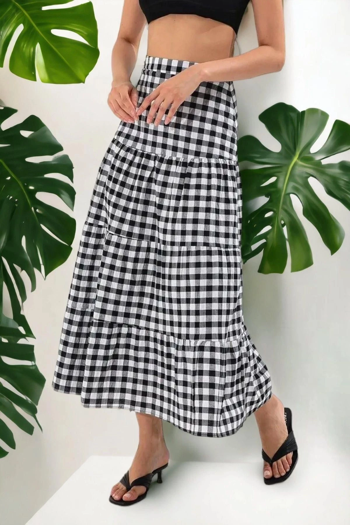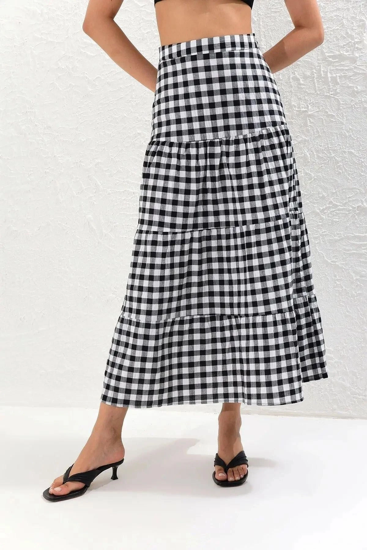 Kadın Ekru Yeni Moda Kat Detaylı Ekose Kaliteli Kumaş Maksi Boy Etek.