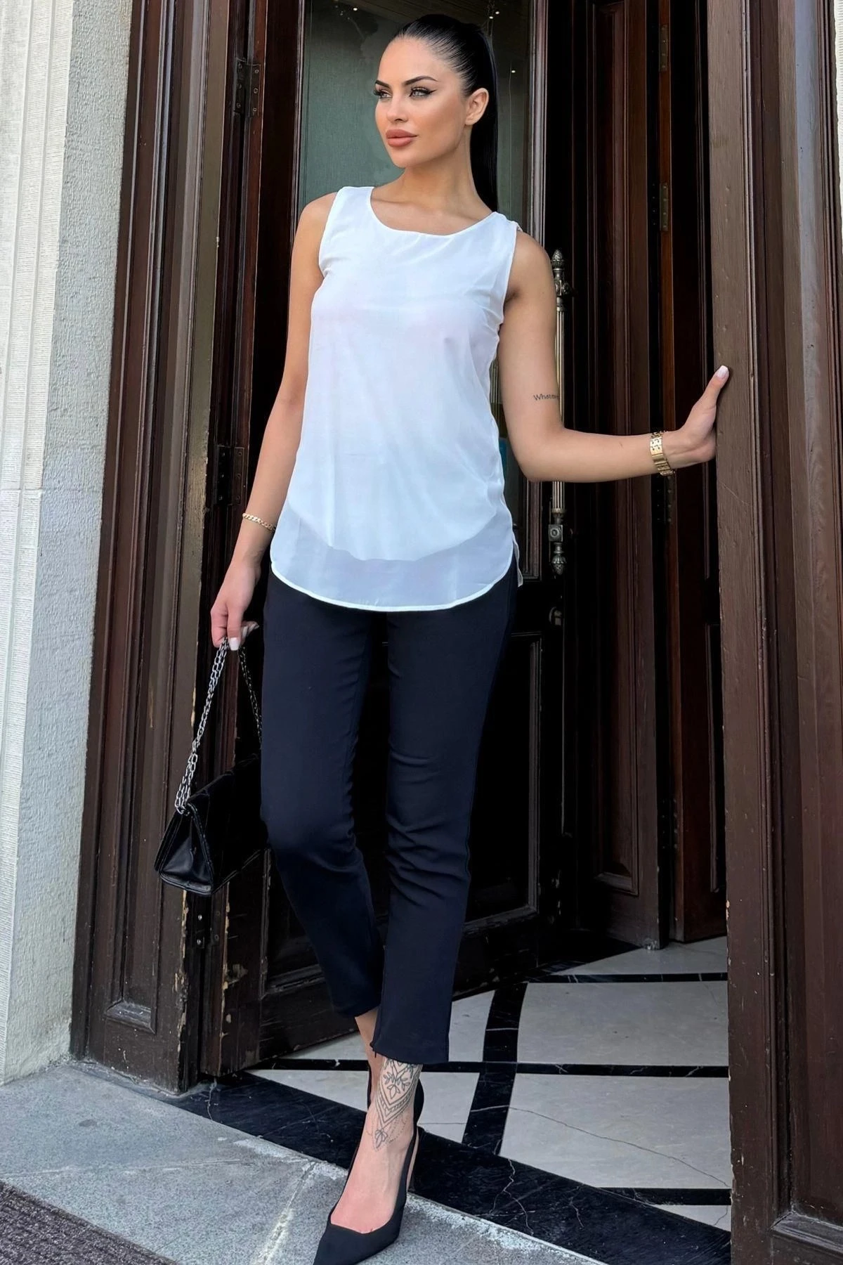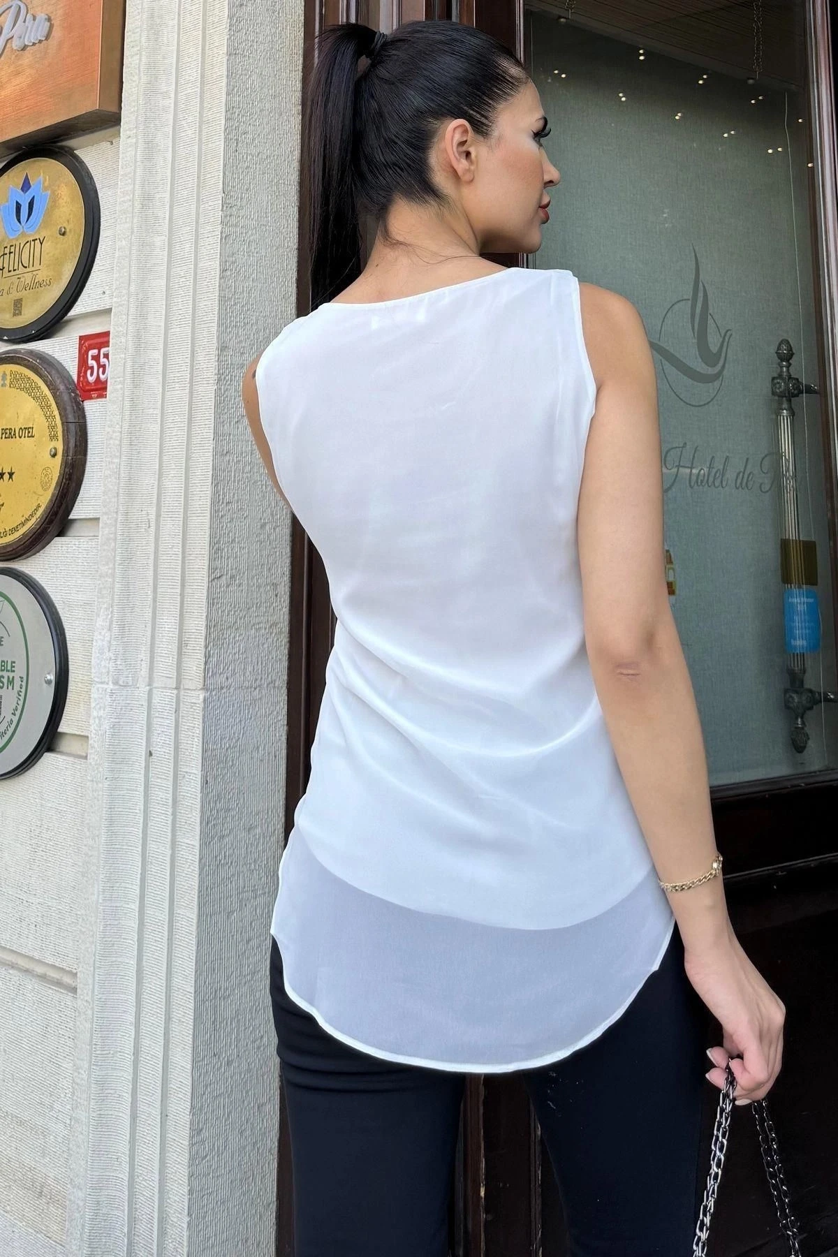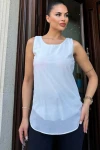 Kadın Ekru Yuvarlak Yaka, Kolsuz, Dökümlü Uzun Arka Kesim, Salaş Şifon Bluz