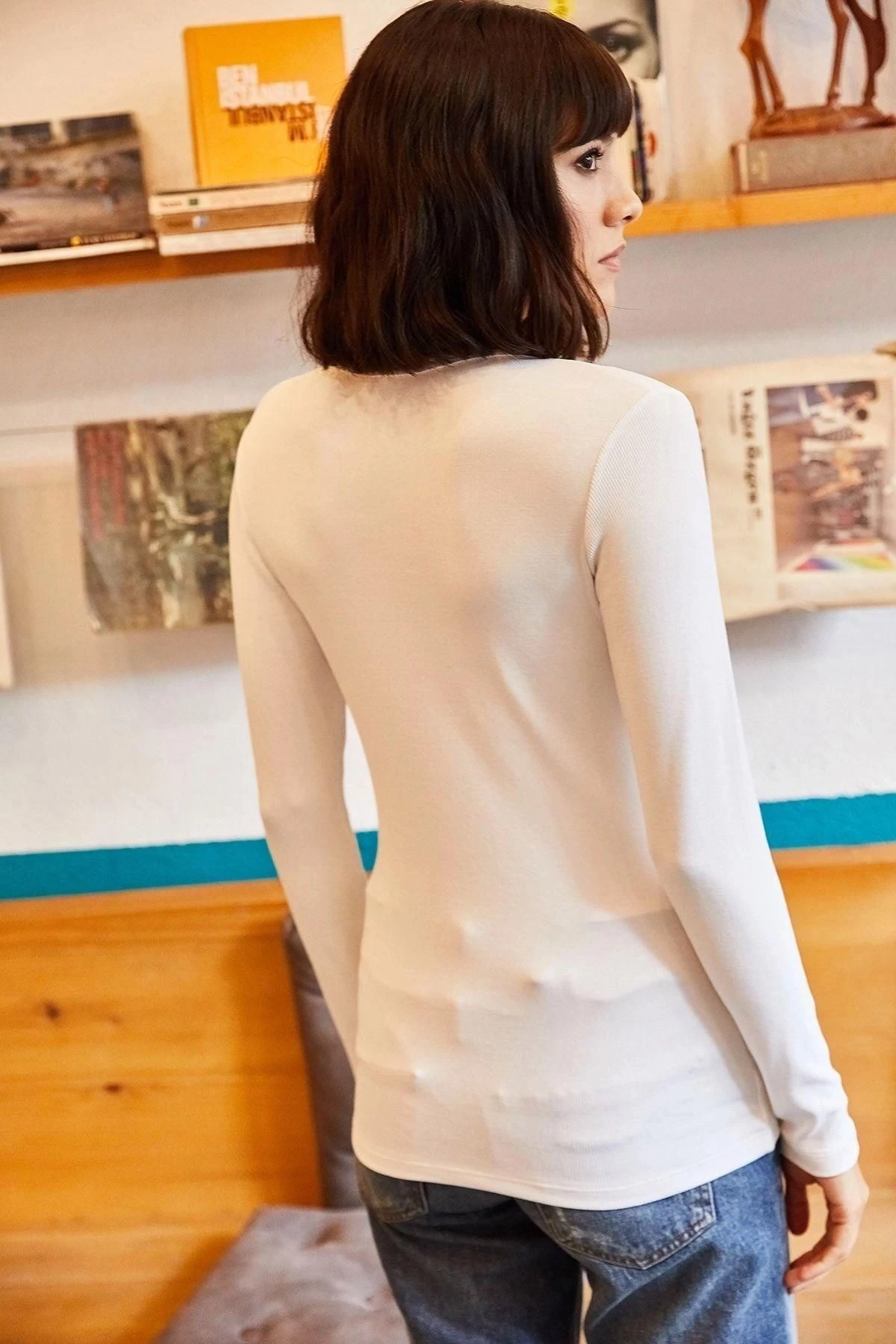 Kadın Ekru Yuvarlak Yaka Uzun Kol Düğme Detaylı Regular Kesim Standart Boy Bluz