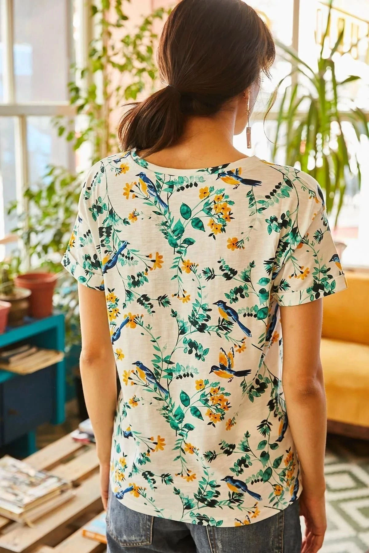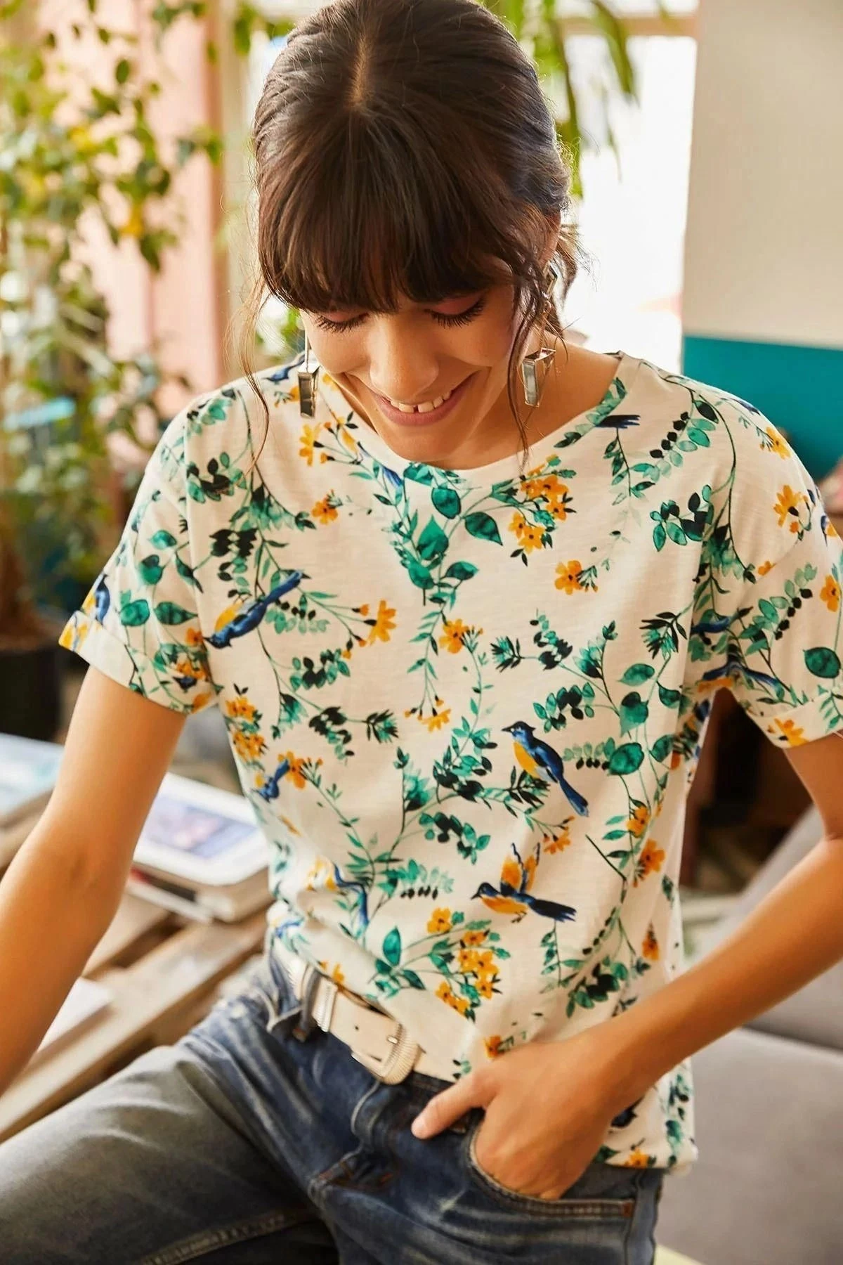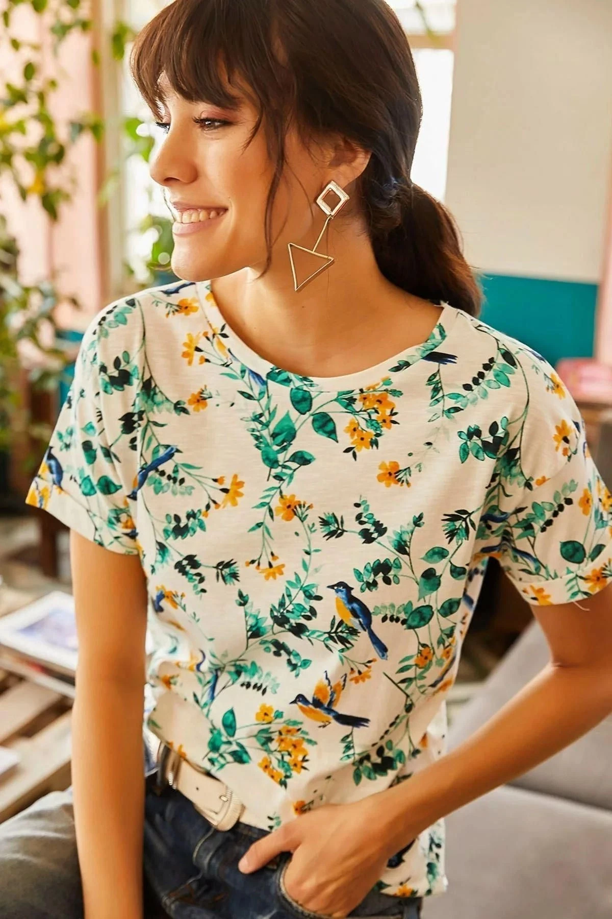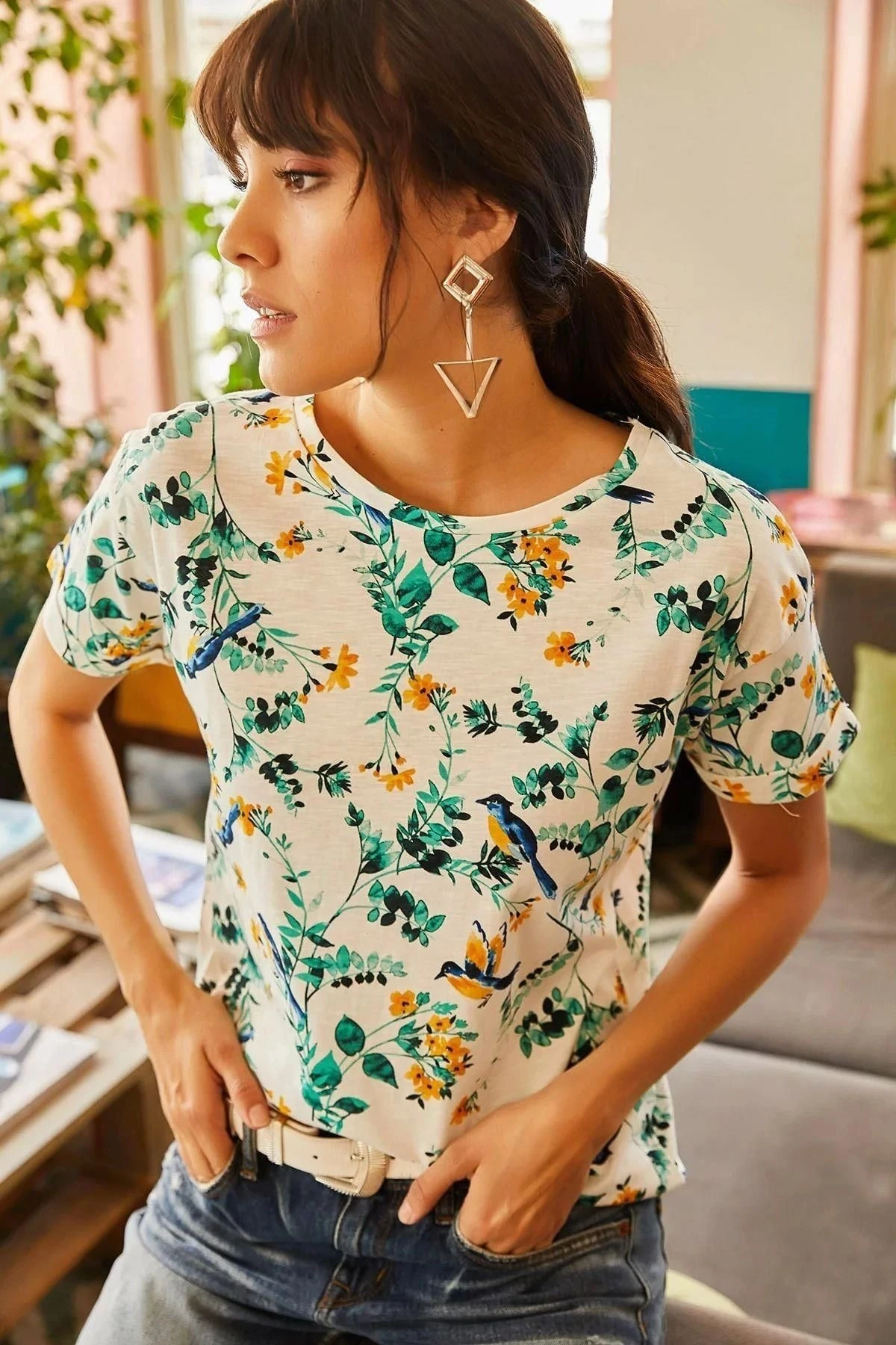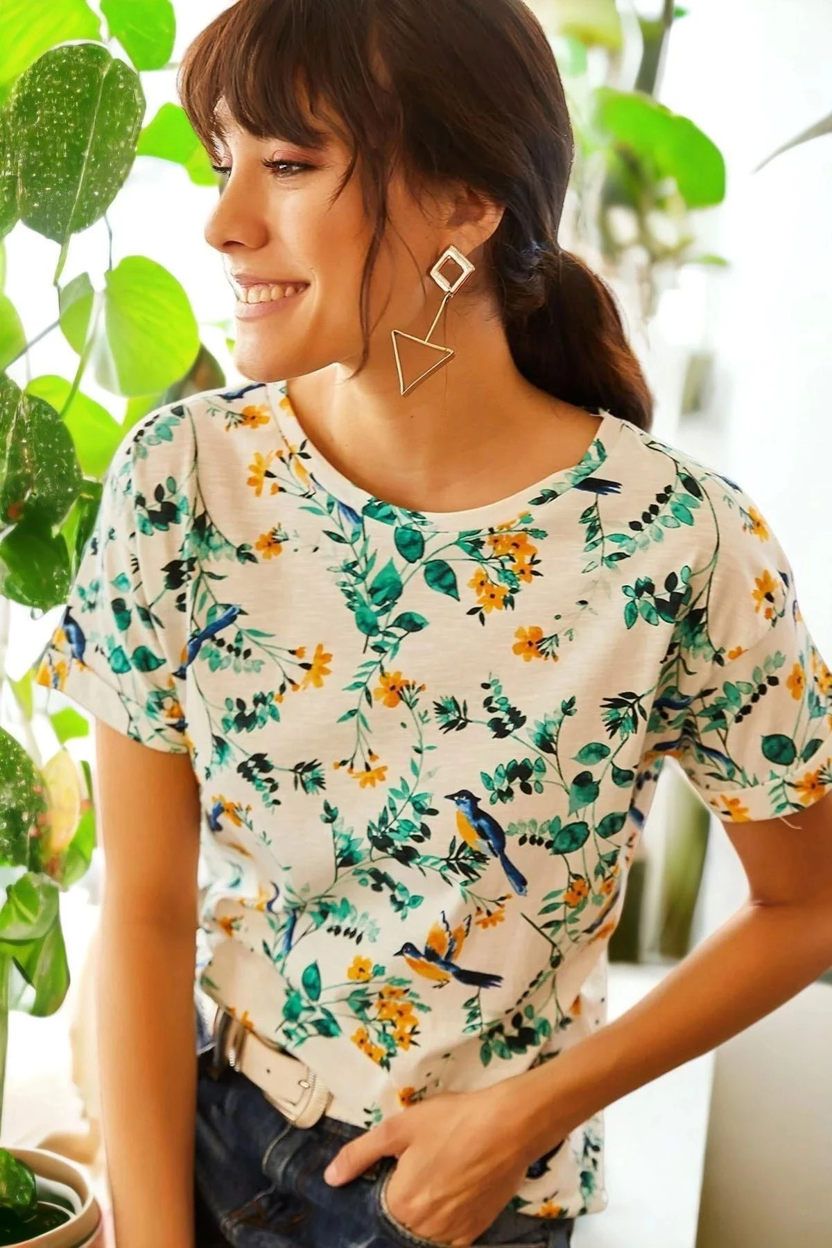 Kadın Ekru Yuvarlak Yaka Yarım Kol Çiçek Desenli Regular Kesim Standart Boy Bluz