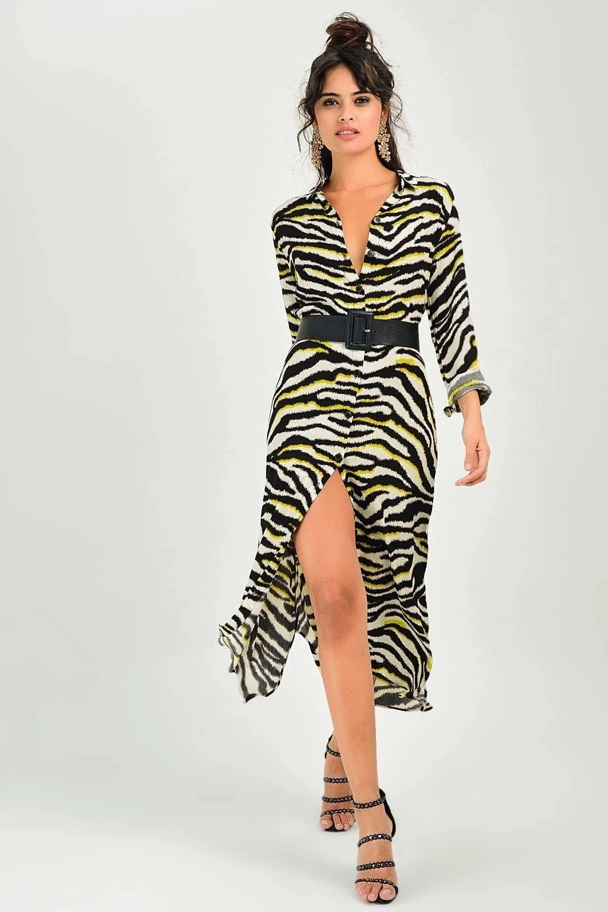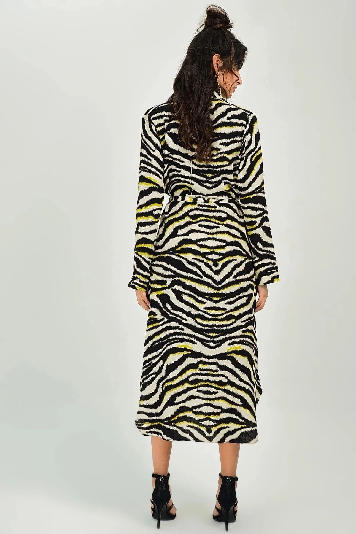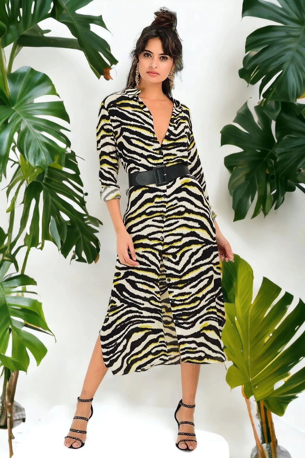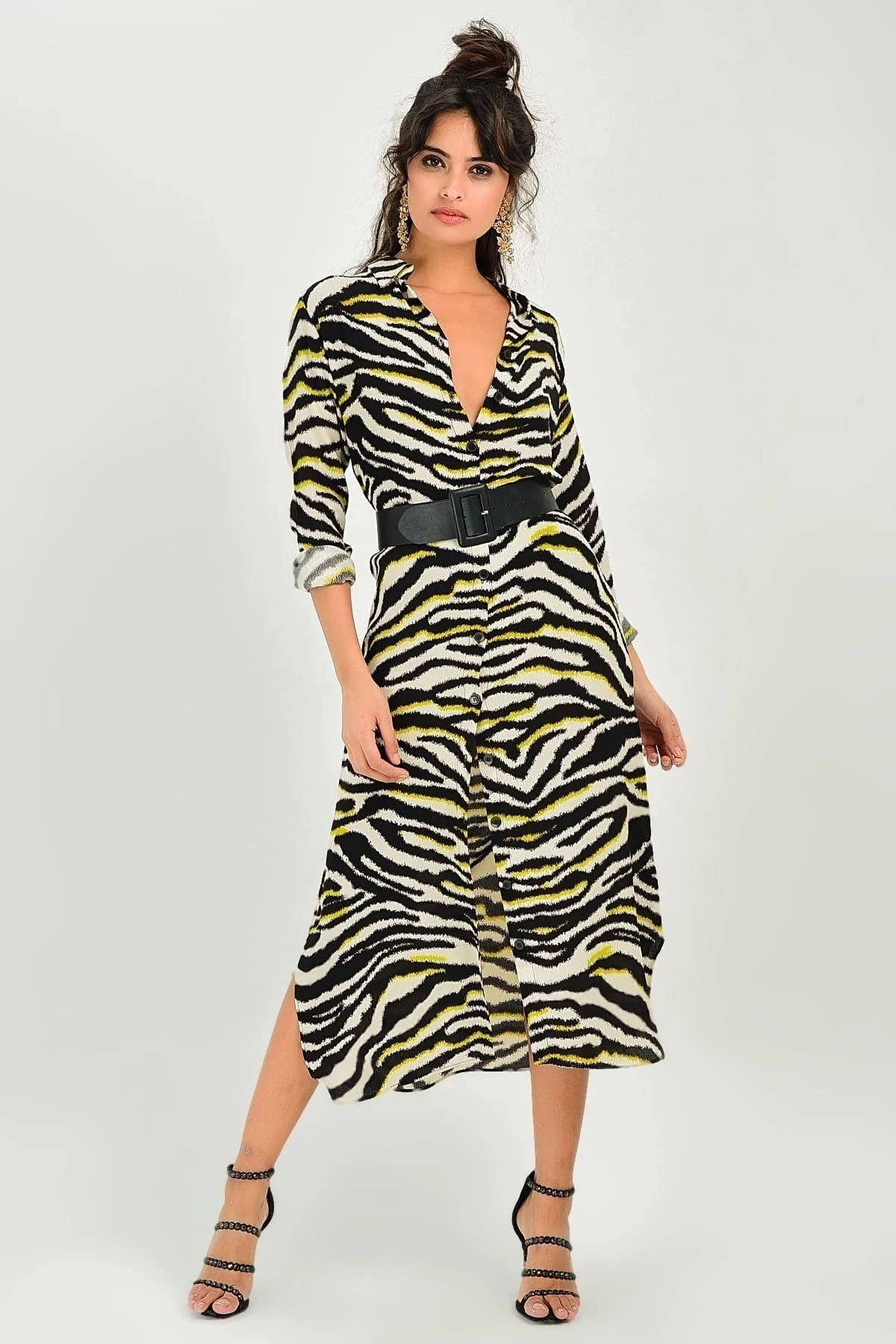 Kadın Ekru Zebra Desenli Klasik Yaka Gömlek Elbise Uzun Kol Yırtmaç Detaylı Uzun Rahat Ve Günlük