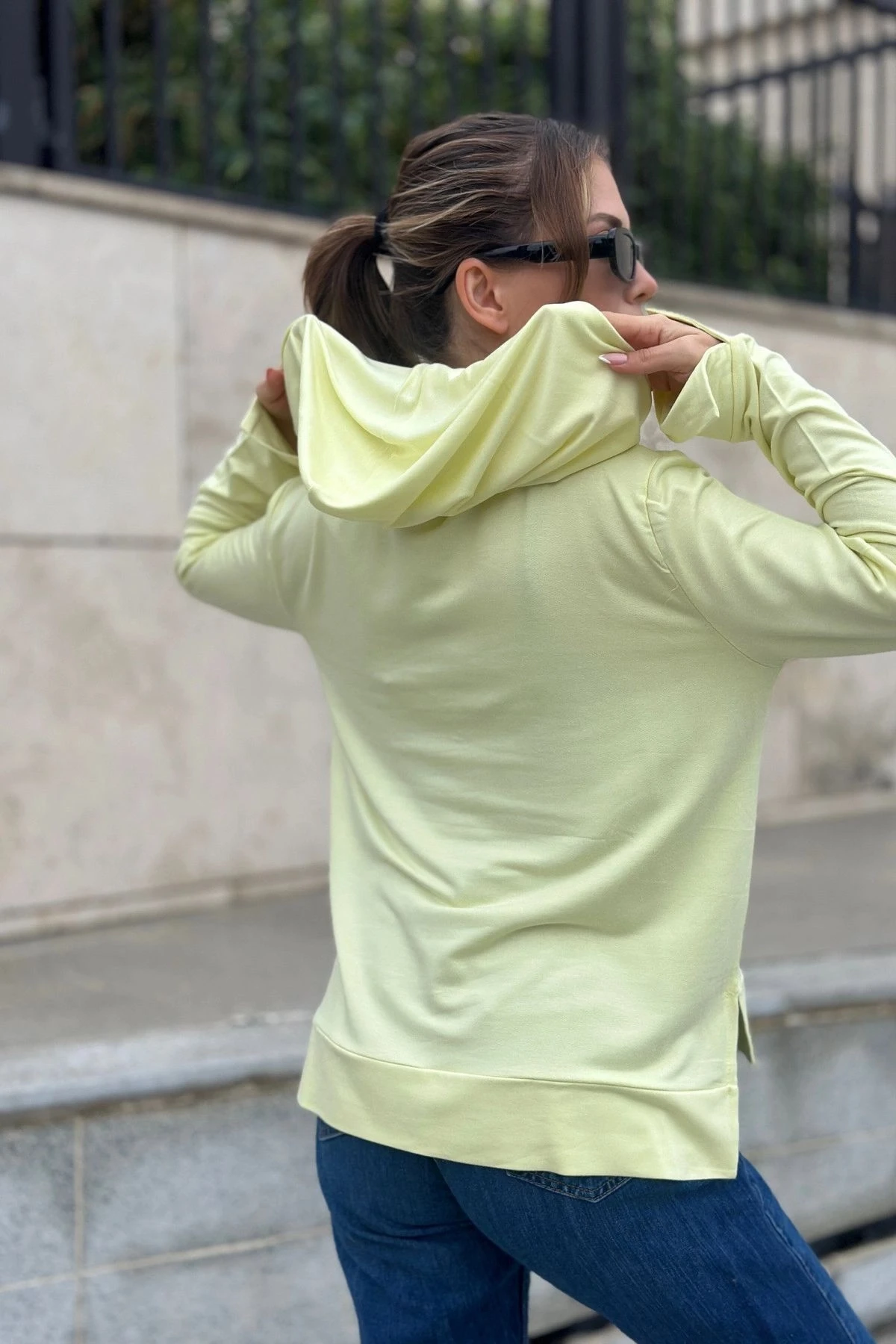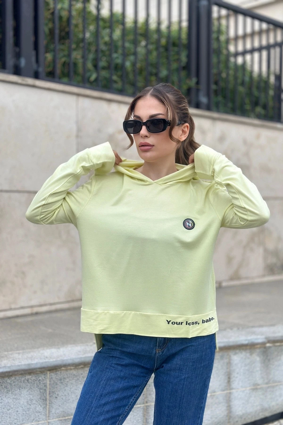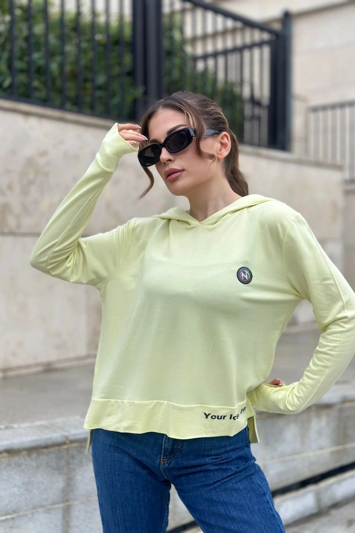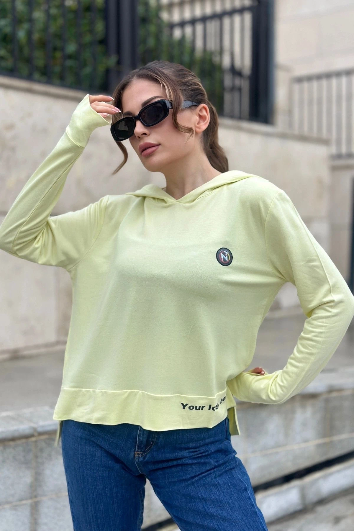 Kadın Fıstık Yeşil Uzun Kol, Yırtmaç Detaylı, Arma Ve Yazı Detaylı, Kapüşonlu Sweatshirt Bluz