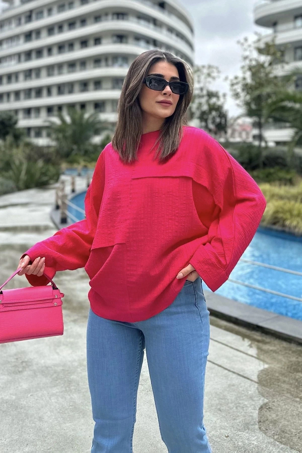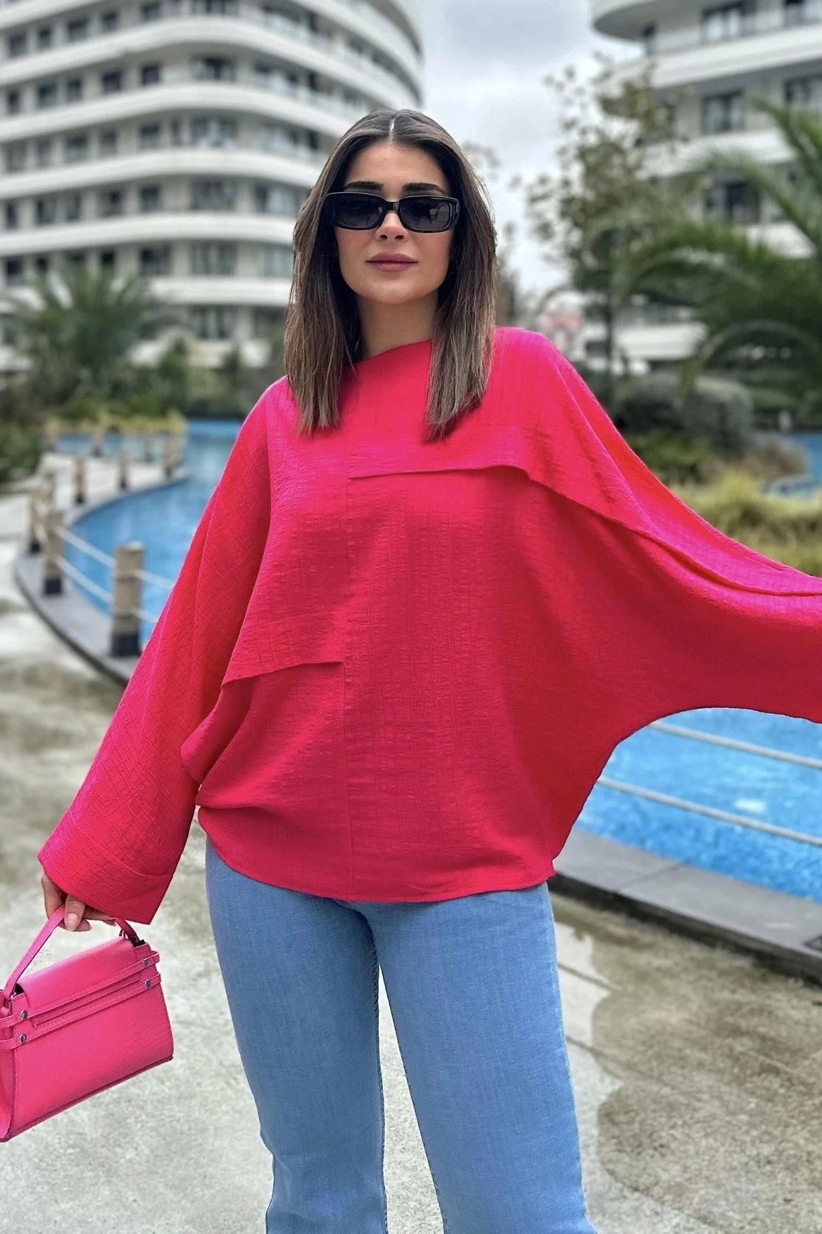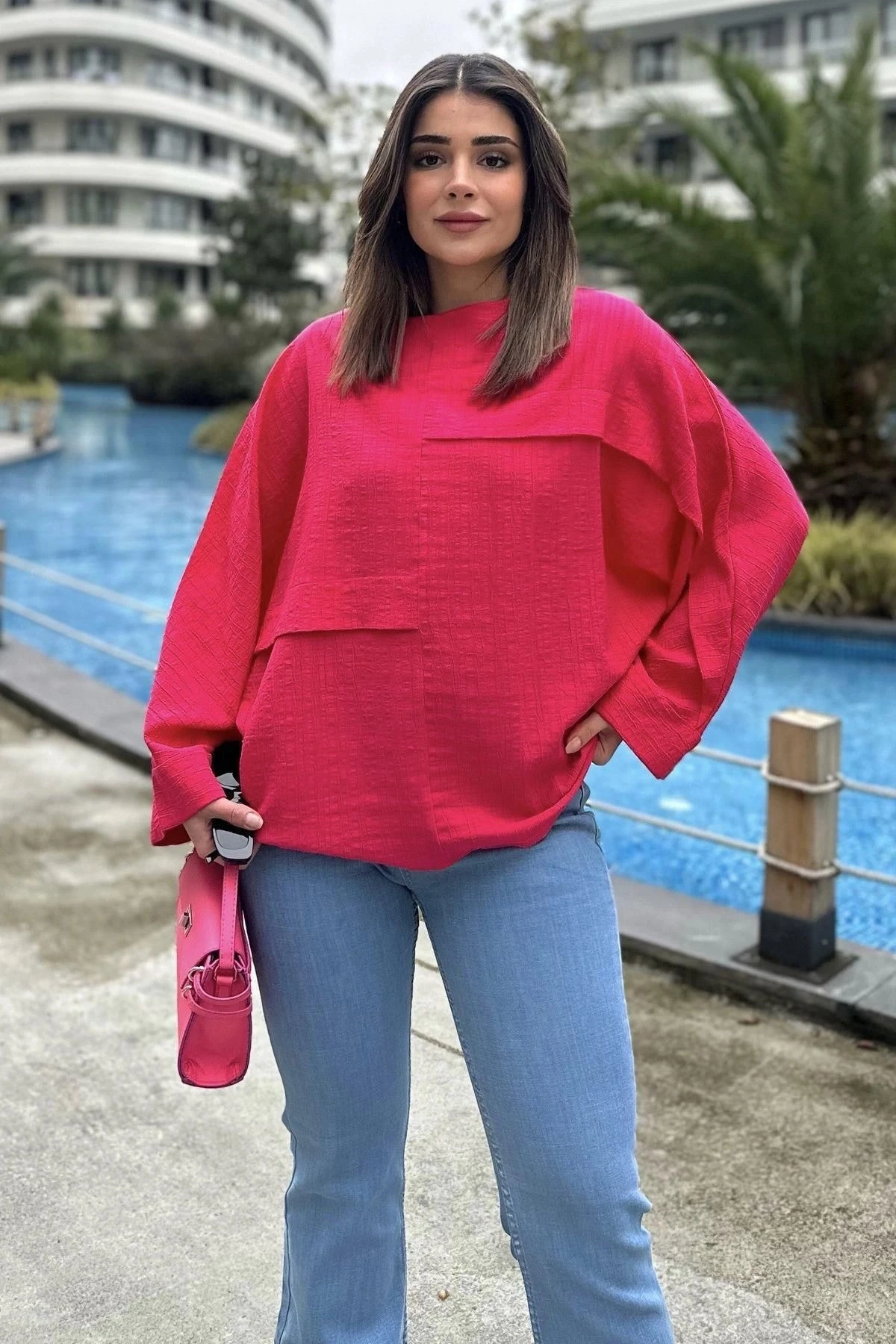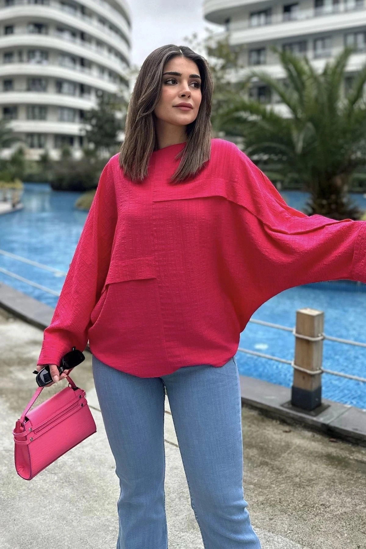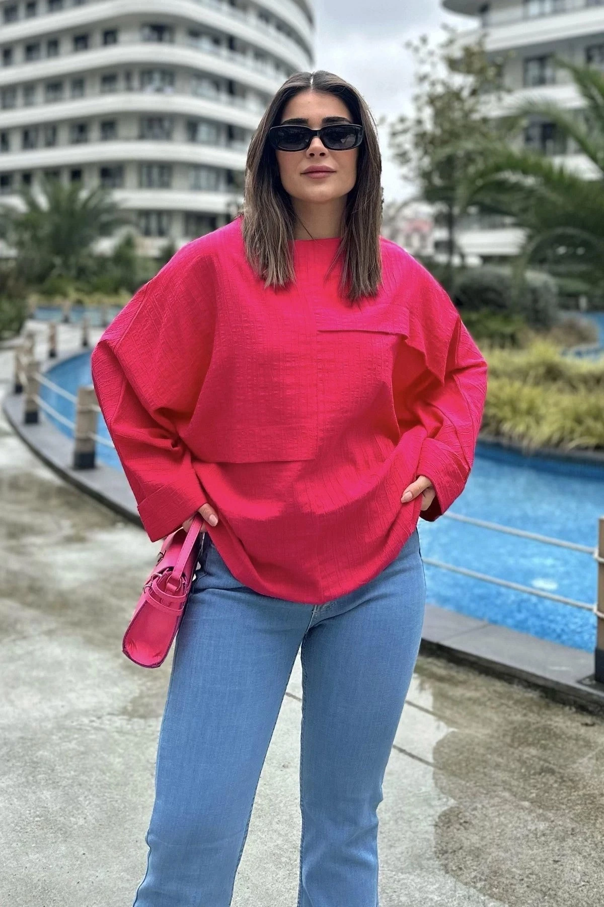 Kadın fuşya Duble Geniş Manşet, Yarasa Kol, Süs Cep Detaylı, Salaş Bluz
