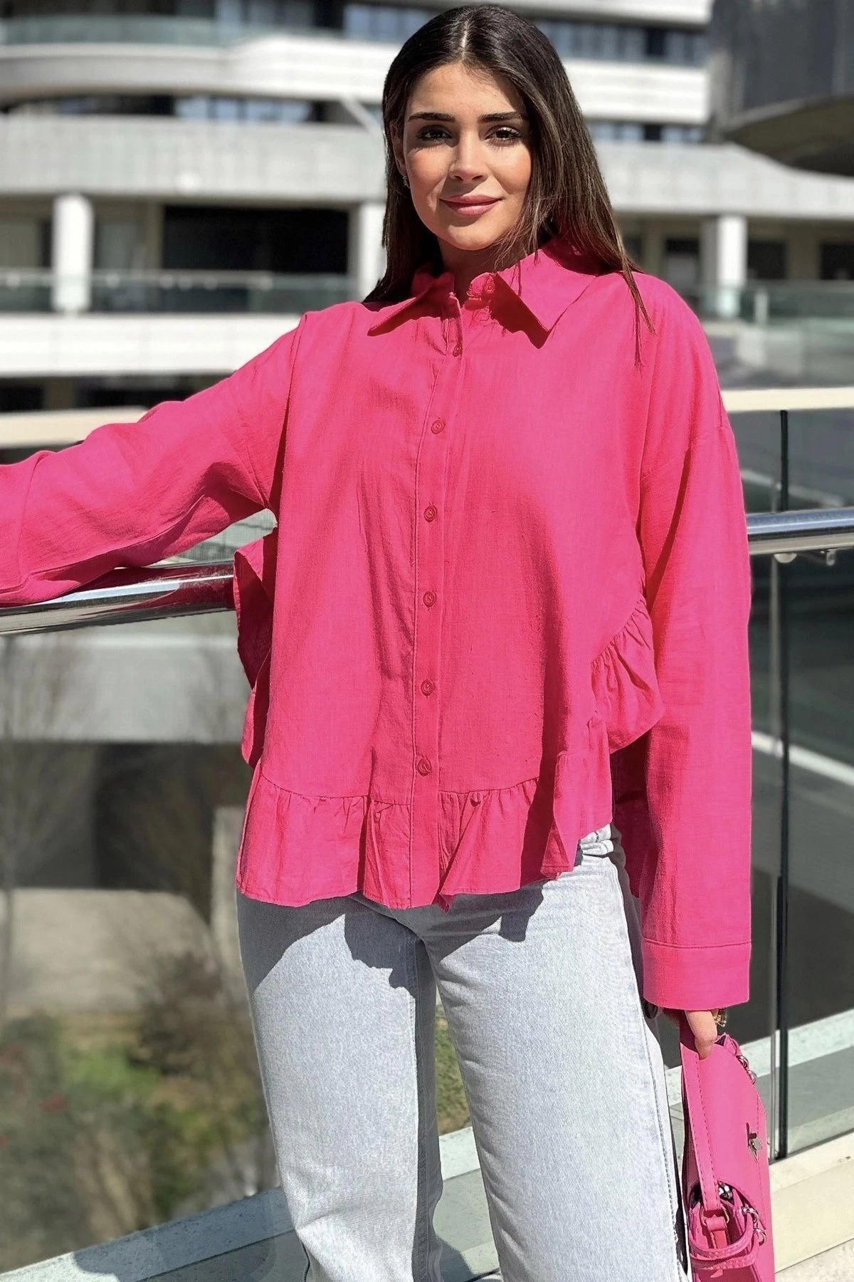 Kadın Fuşya Eteği Fırfır Ve Yırtmaç Detaylı, Terletmez Rahat Kumaş, Salaş Gömlek ( Pamuklu Keten)