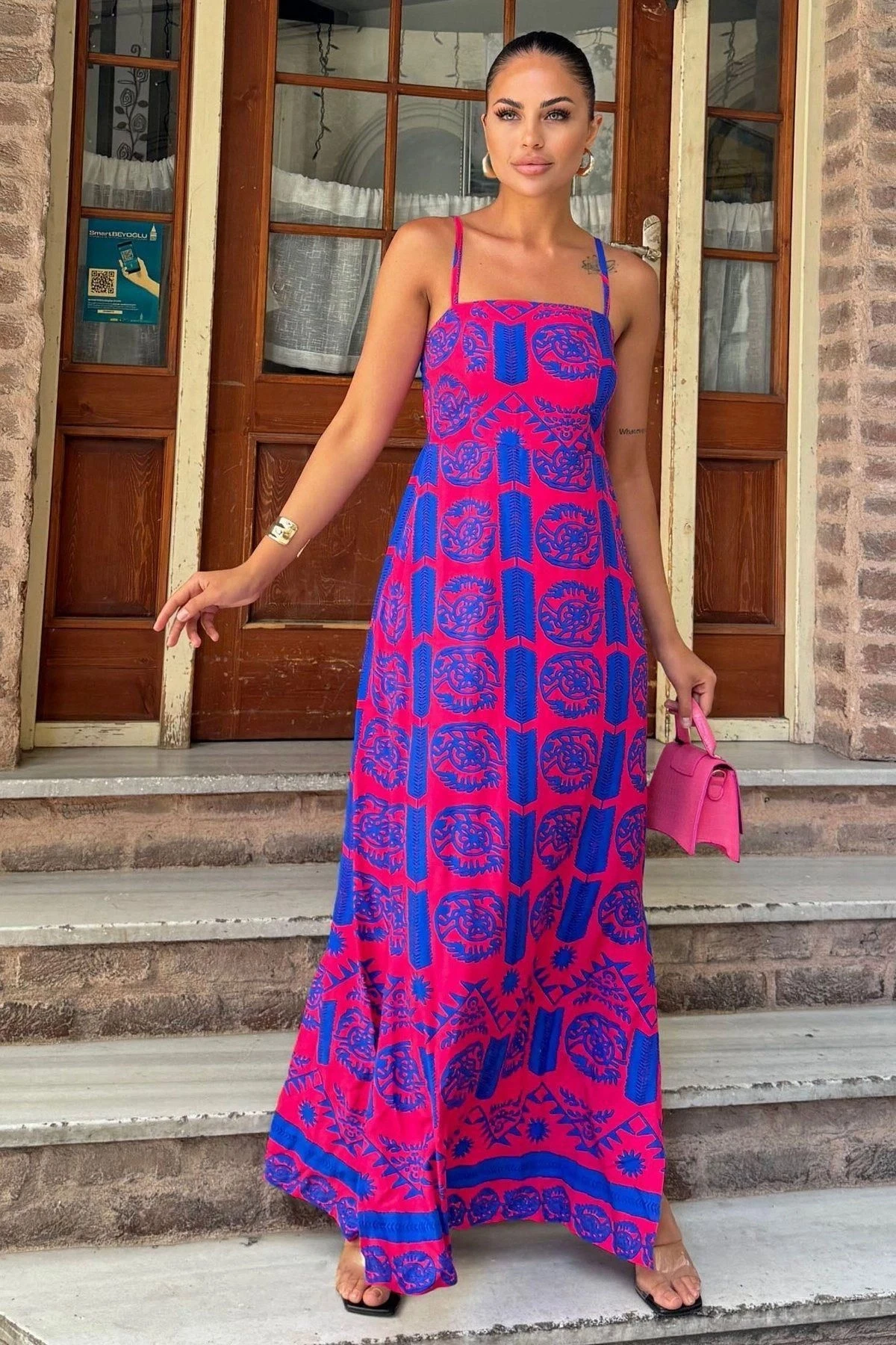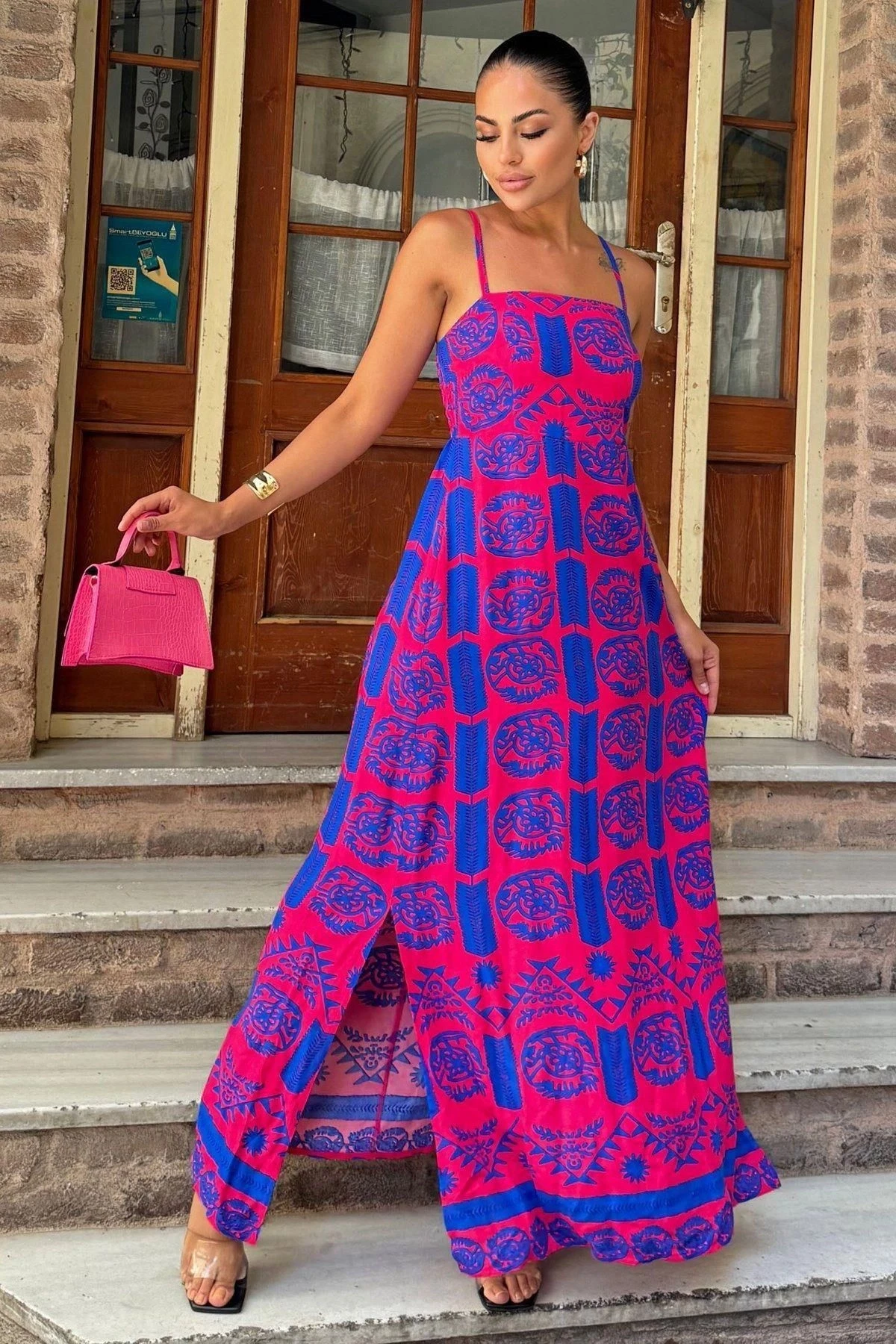Kadın Fuşya İp Askılı, Straplez Yaka, Yırtmaçlı, Rahat A Kesim, Uzun Elbise