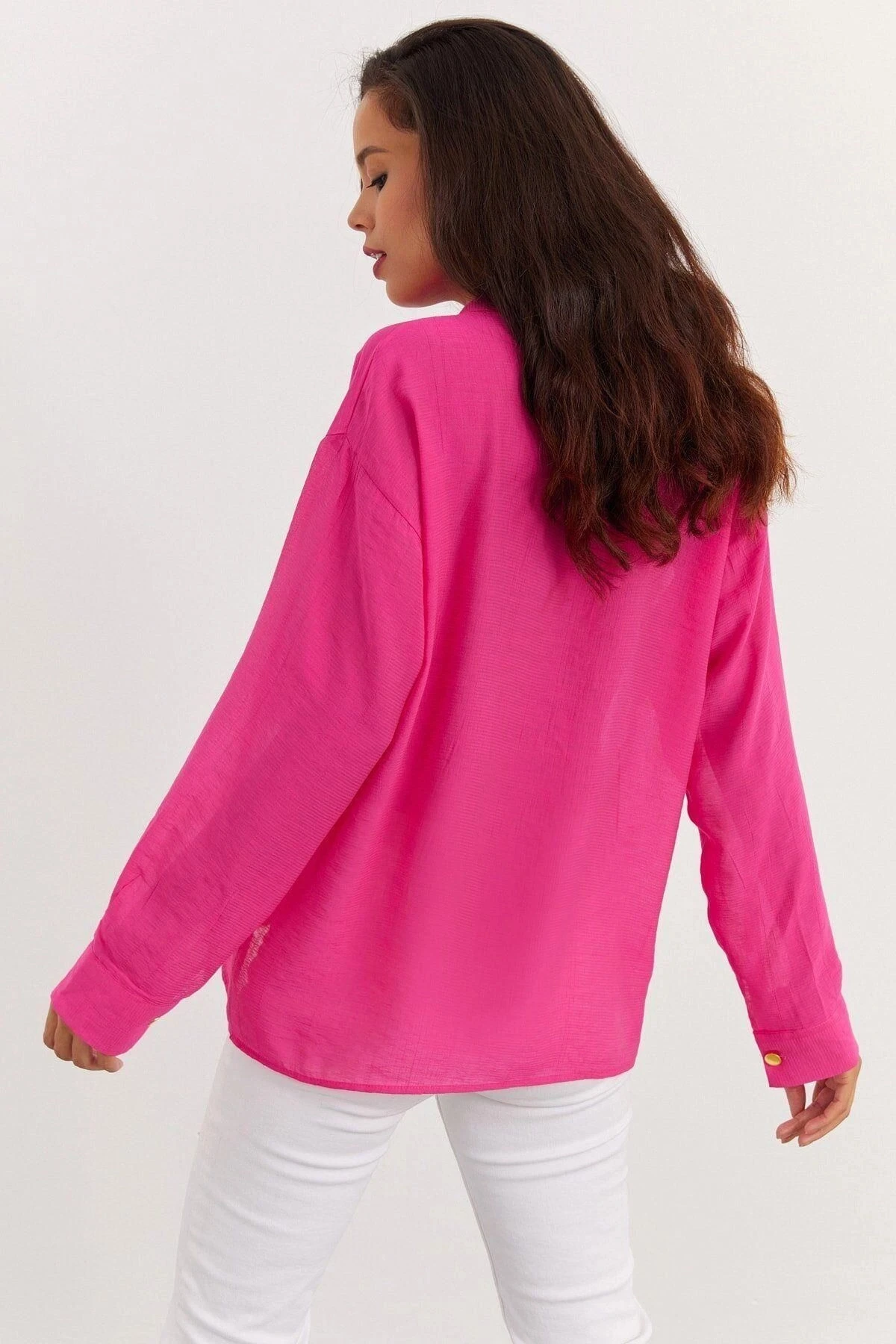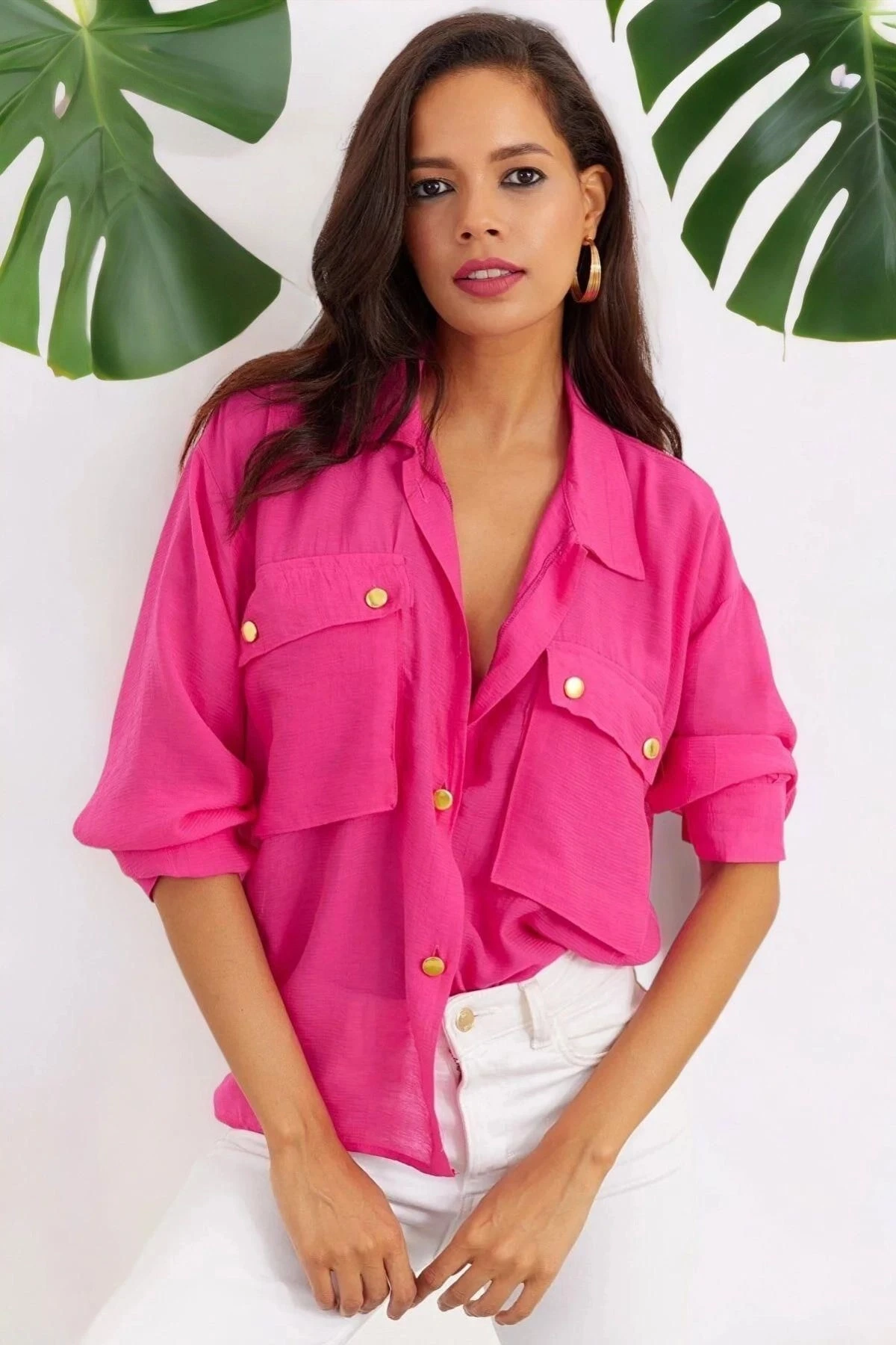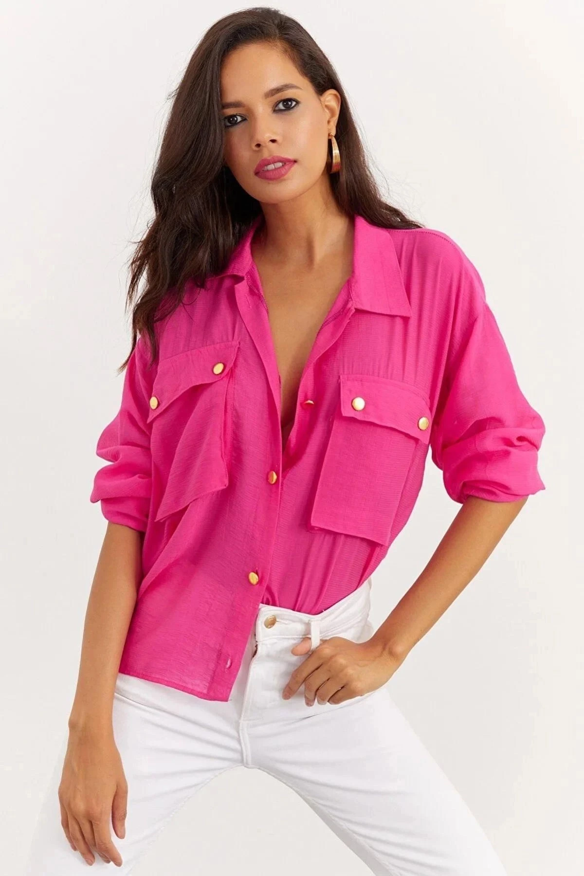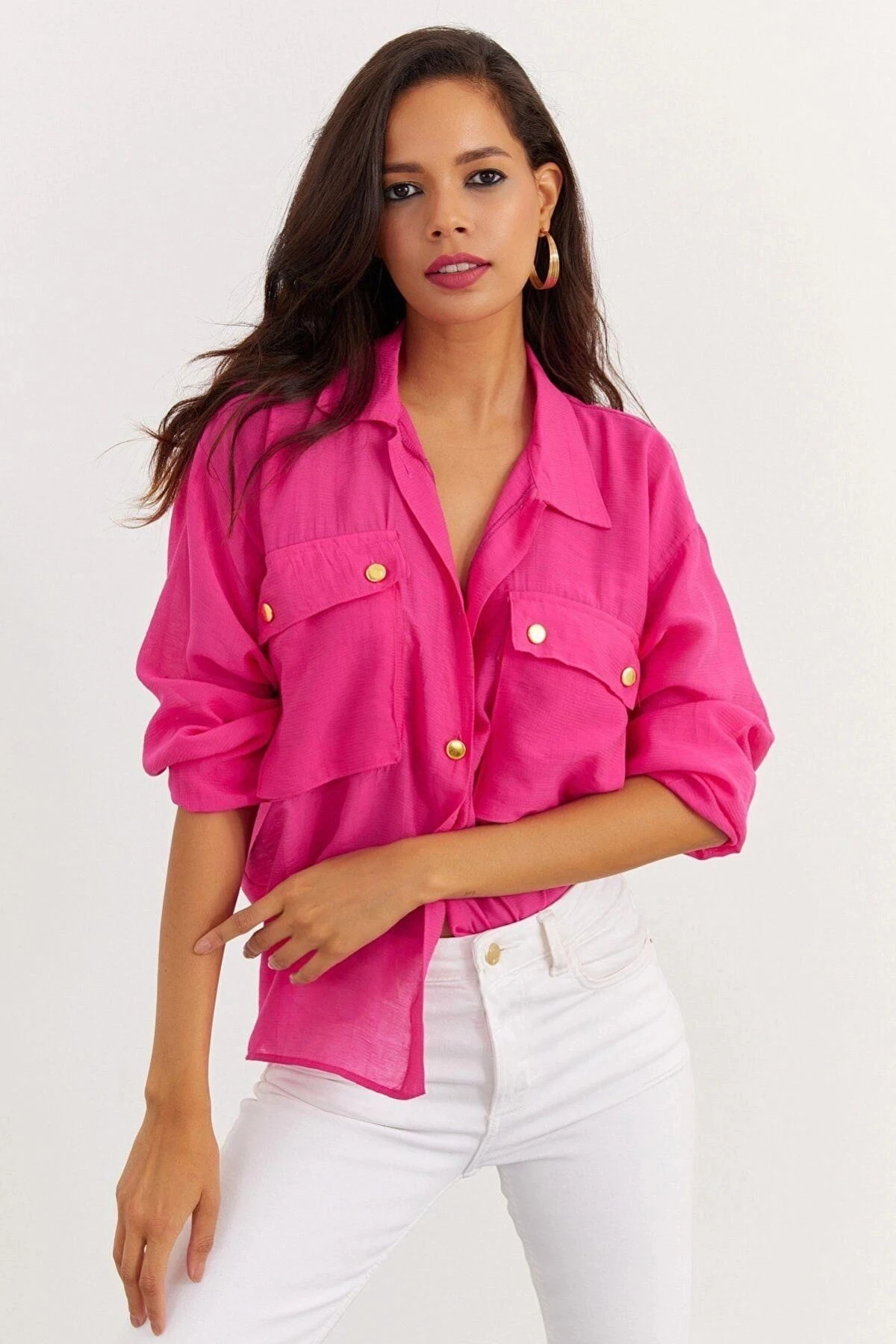 Kadın Fuşya Klasik Yaka, Uzun Kol, Cep Detaylı, Regular Kesim, Standart Boy Gömlek