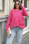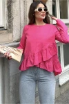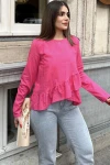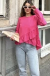 Kadın Fuşya Önü Fırfırlı, Yuvarlak Yaka, Arkası Uzun Pamuklu Salaş Bluz