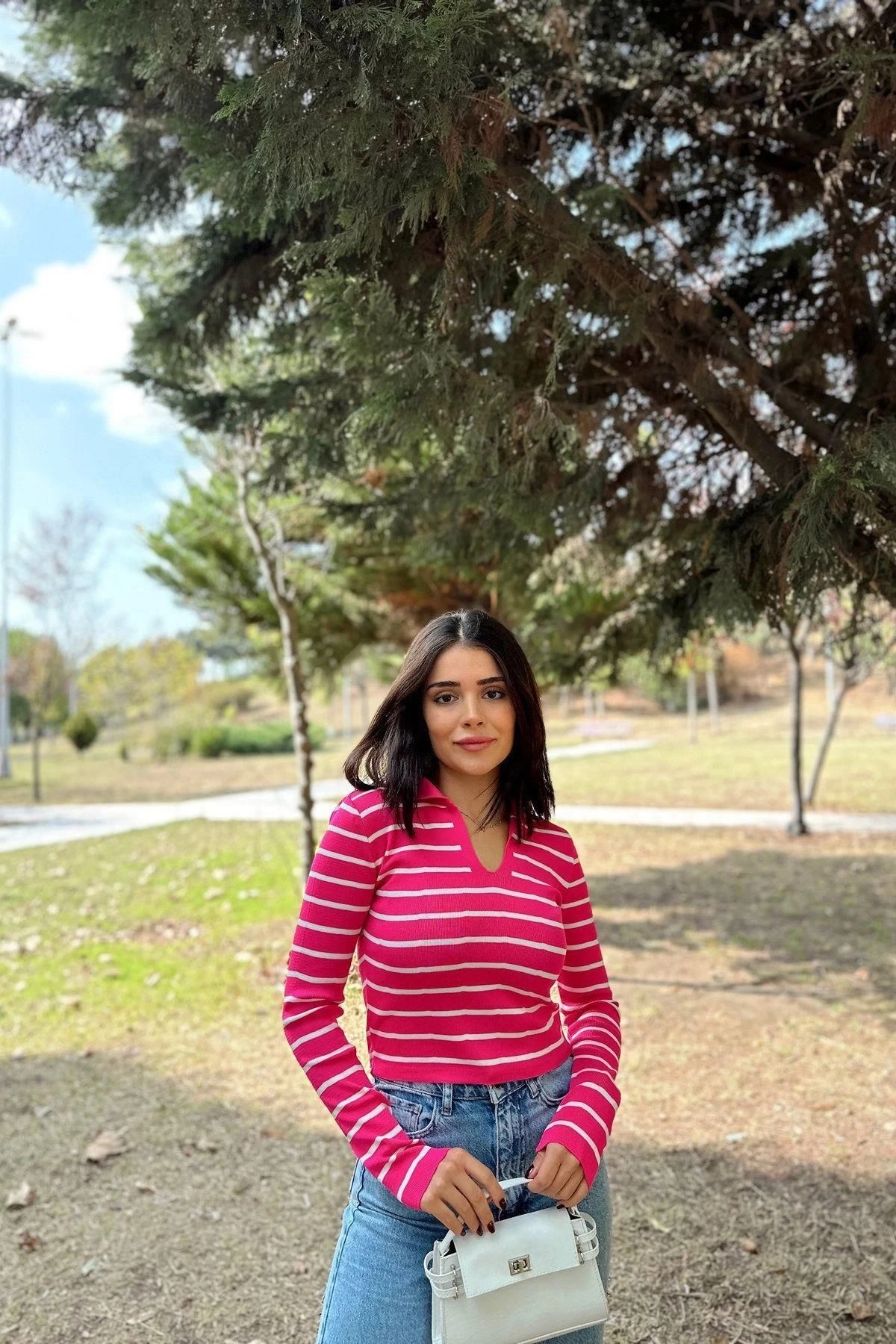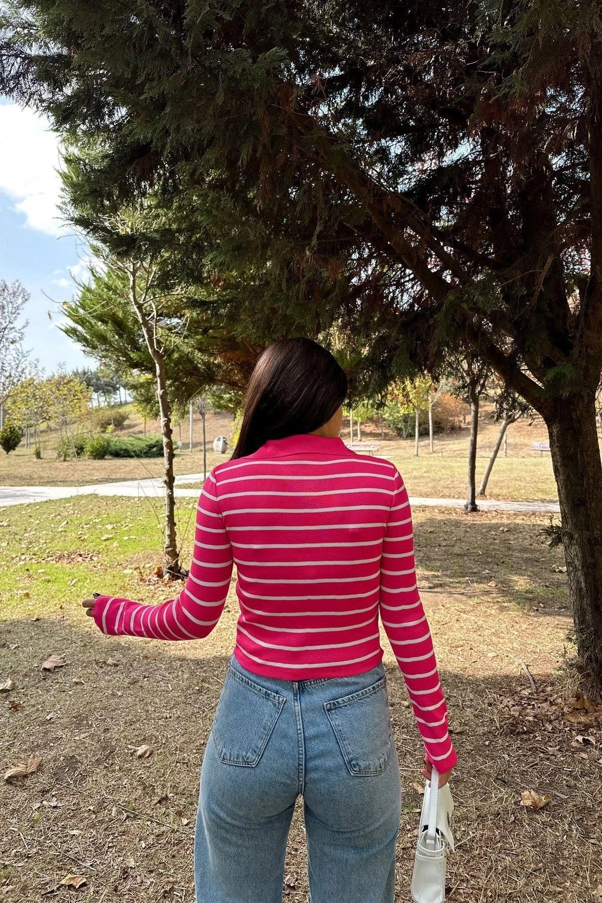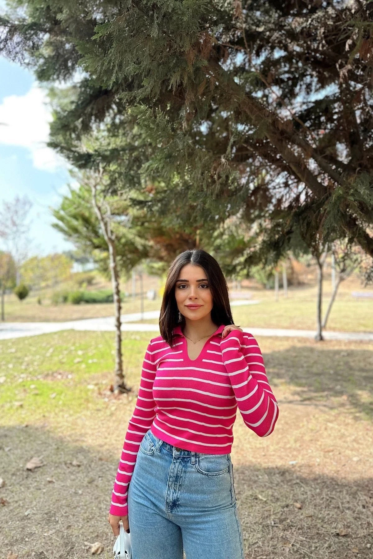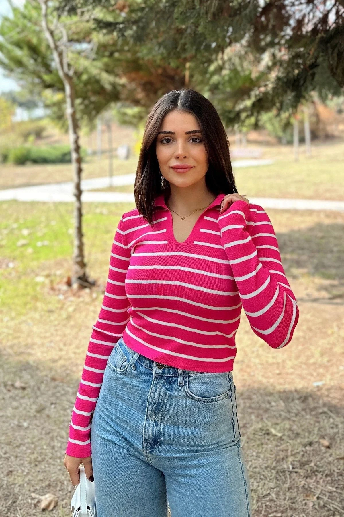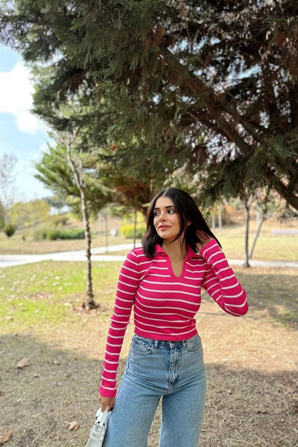 Kadın Fuşya Polo Yaka, Uzun Kol, Vucüda Oturan Kalıp, Esnek Kumaş, Çizglili Desen, Triko Bluz