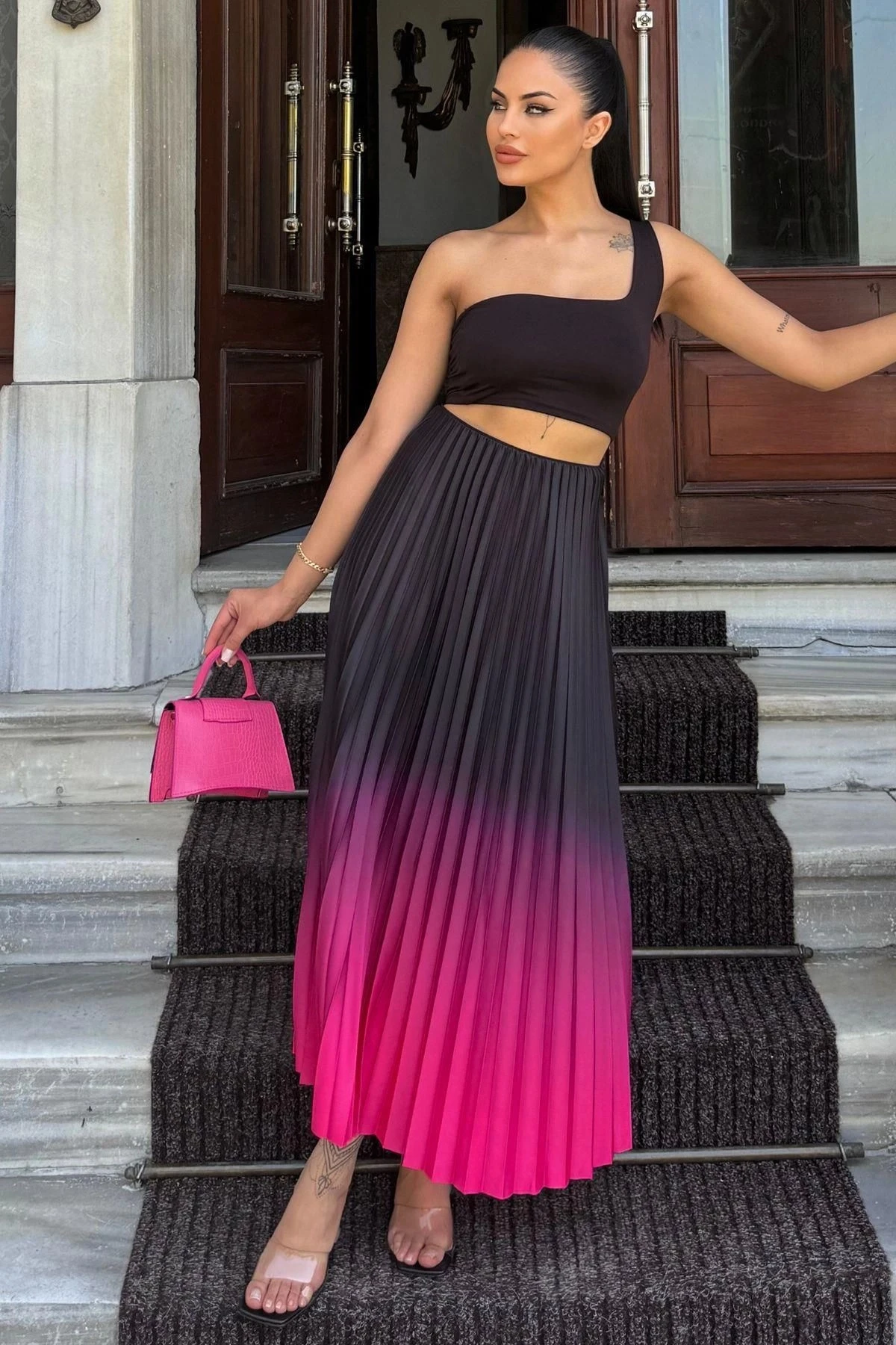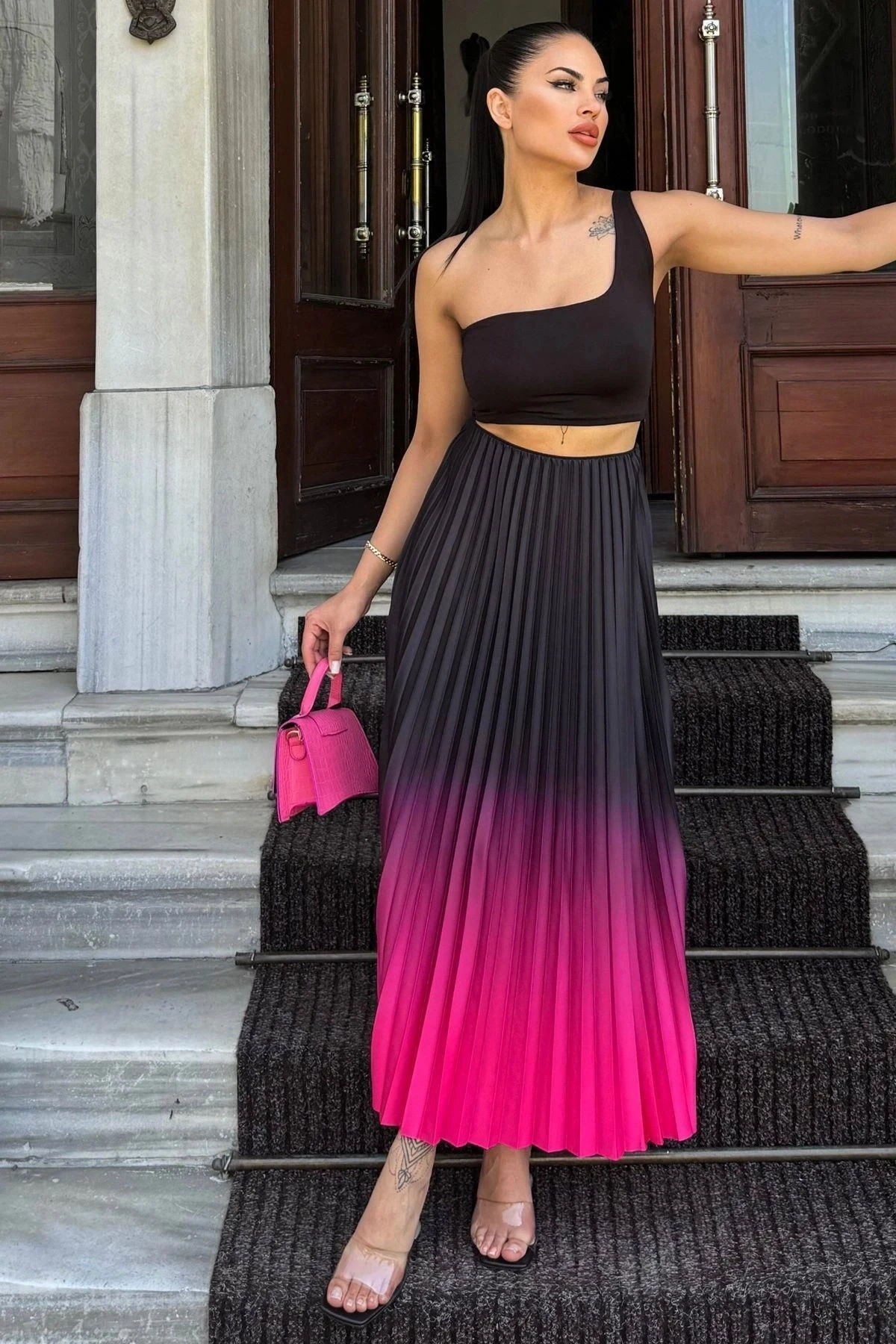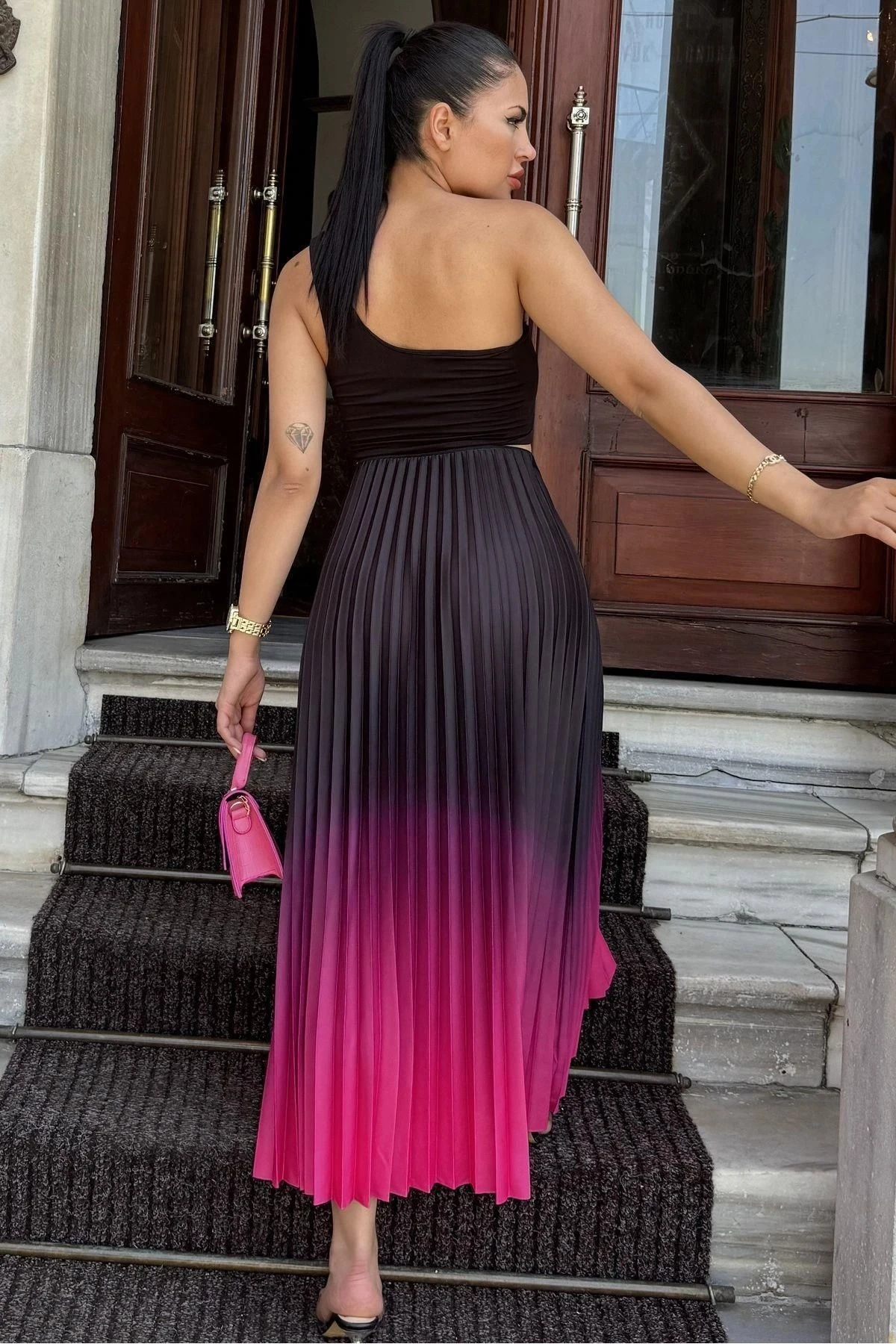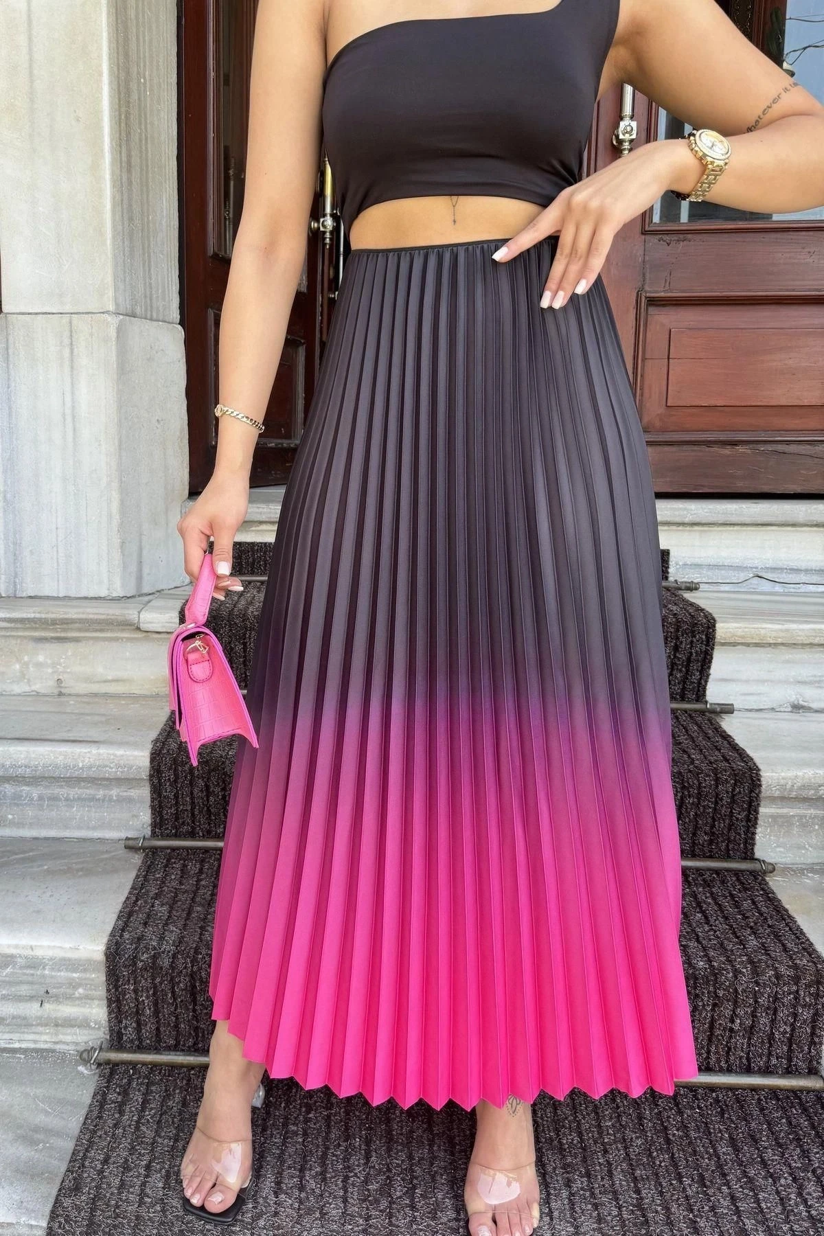 Kadın Fuşya & Siyah Ombre Desen, Pilili Maxi Etek