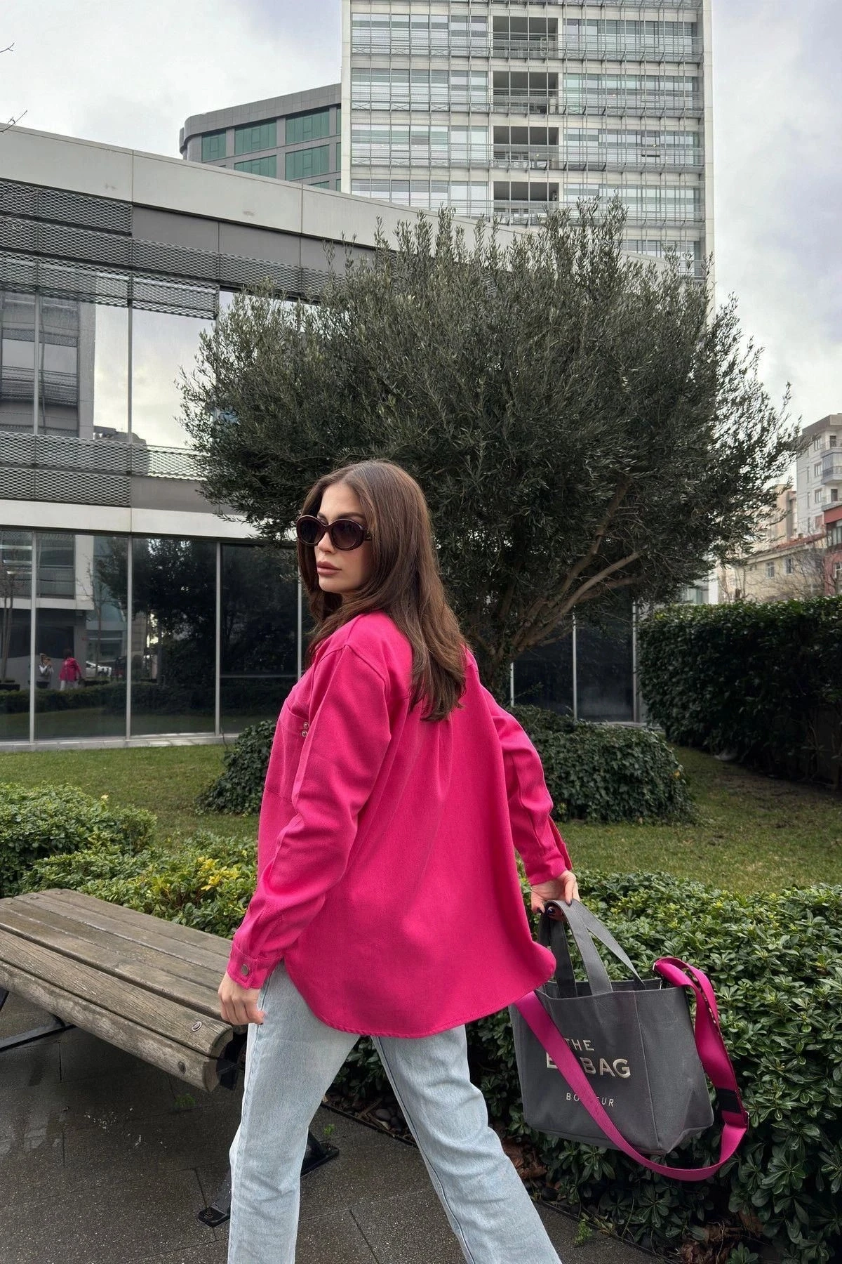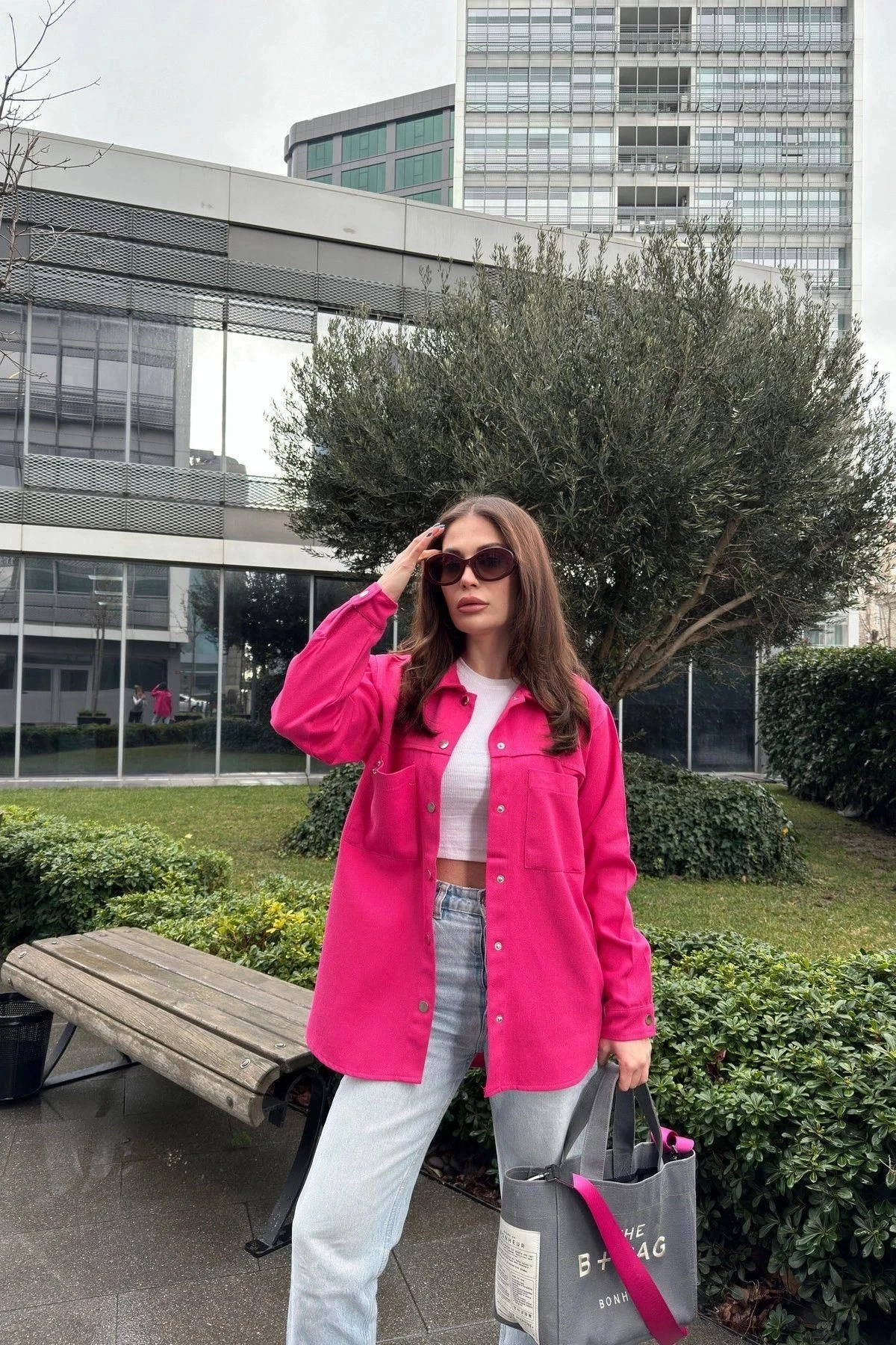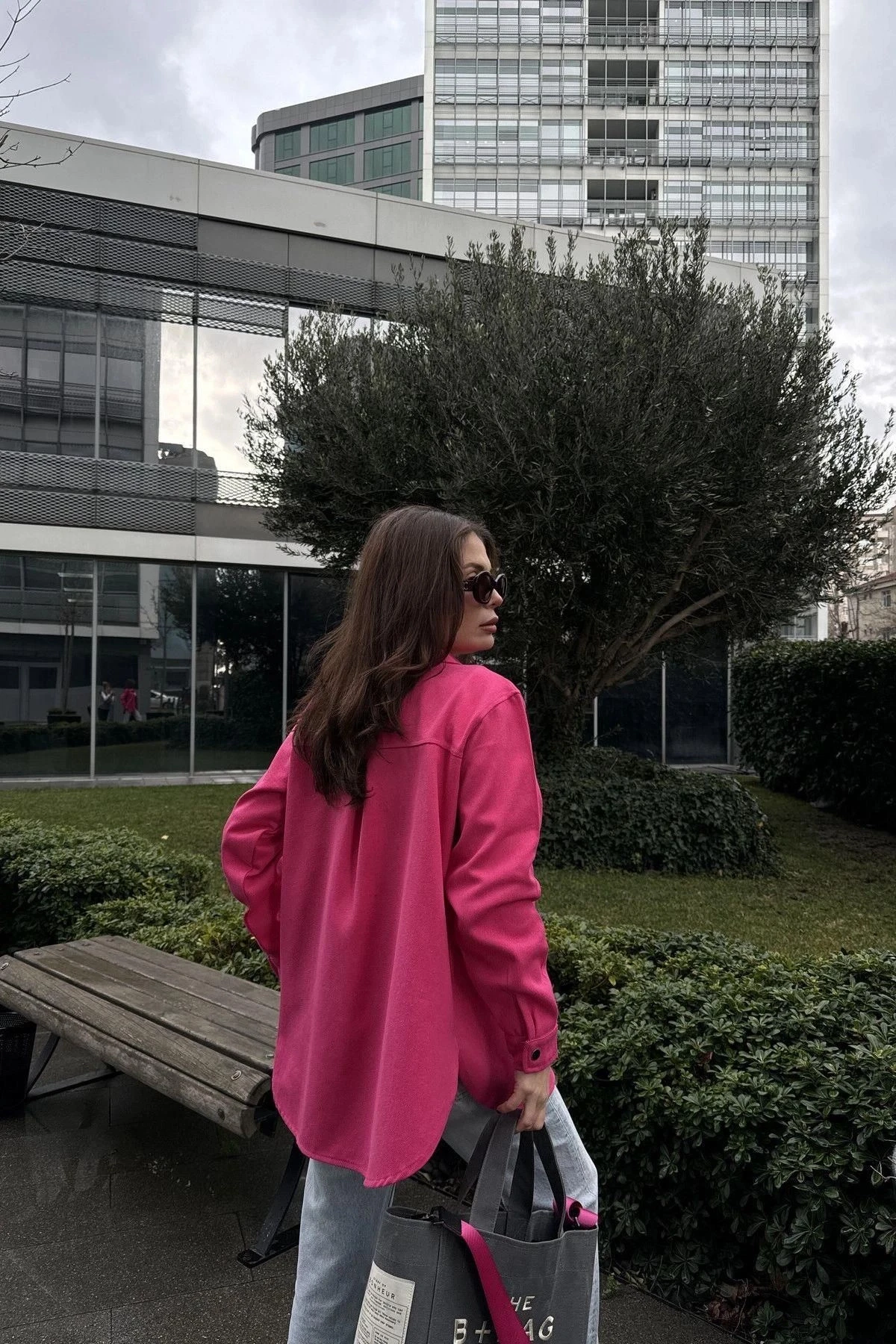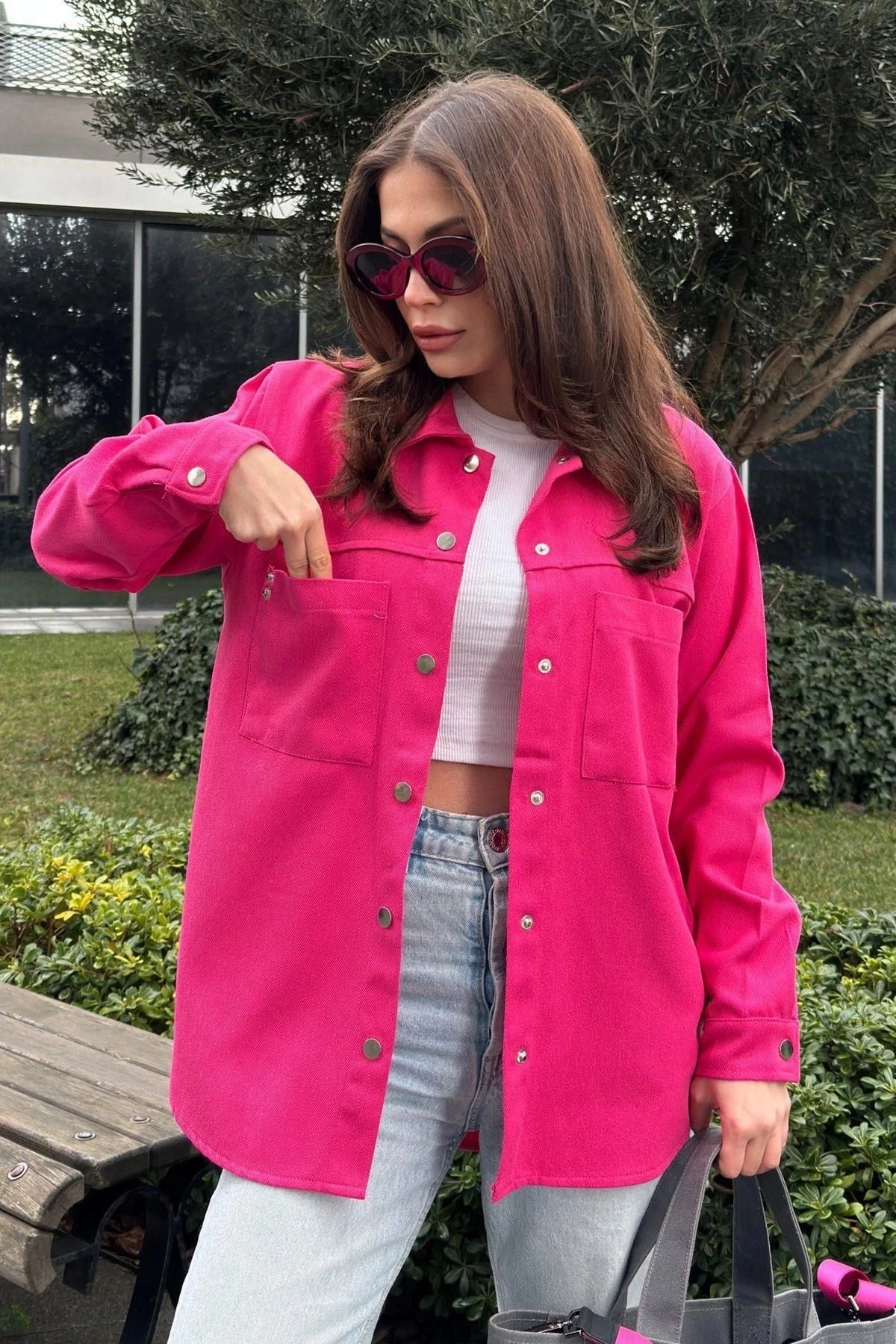 Kadın Fuşya Uzun Kol, Çift Cep, Arkası Pliseli, Eteği Oval Kesim, Yırtmaçlı, Gabardin Gömlek Ceket