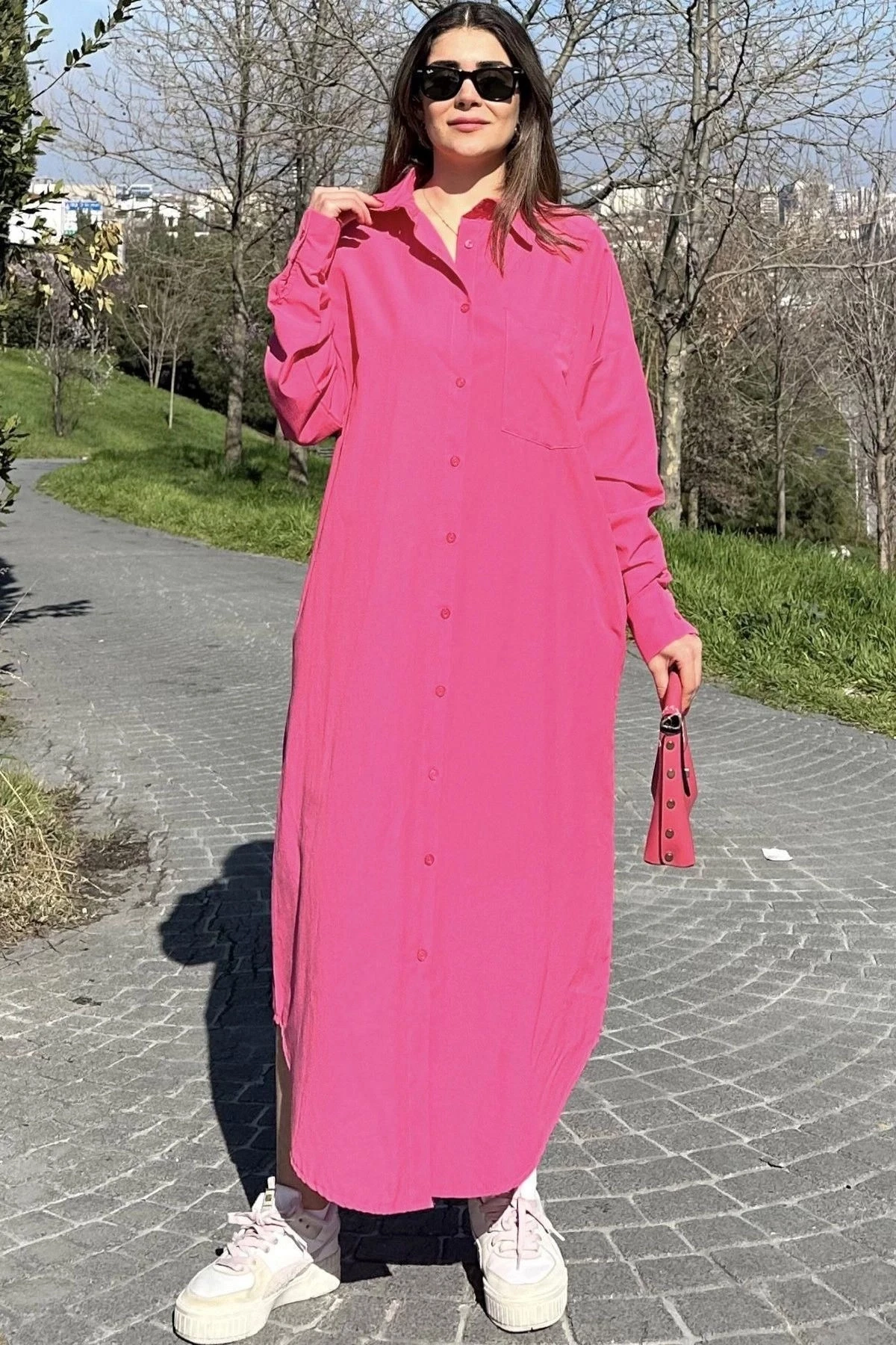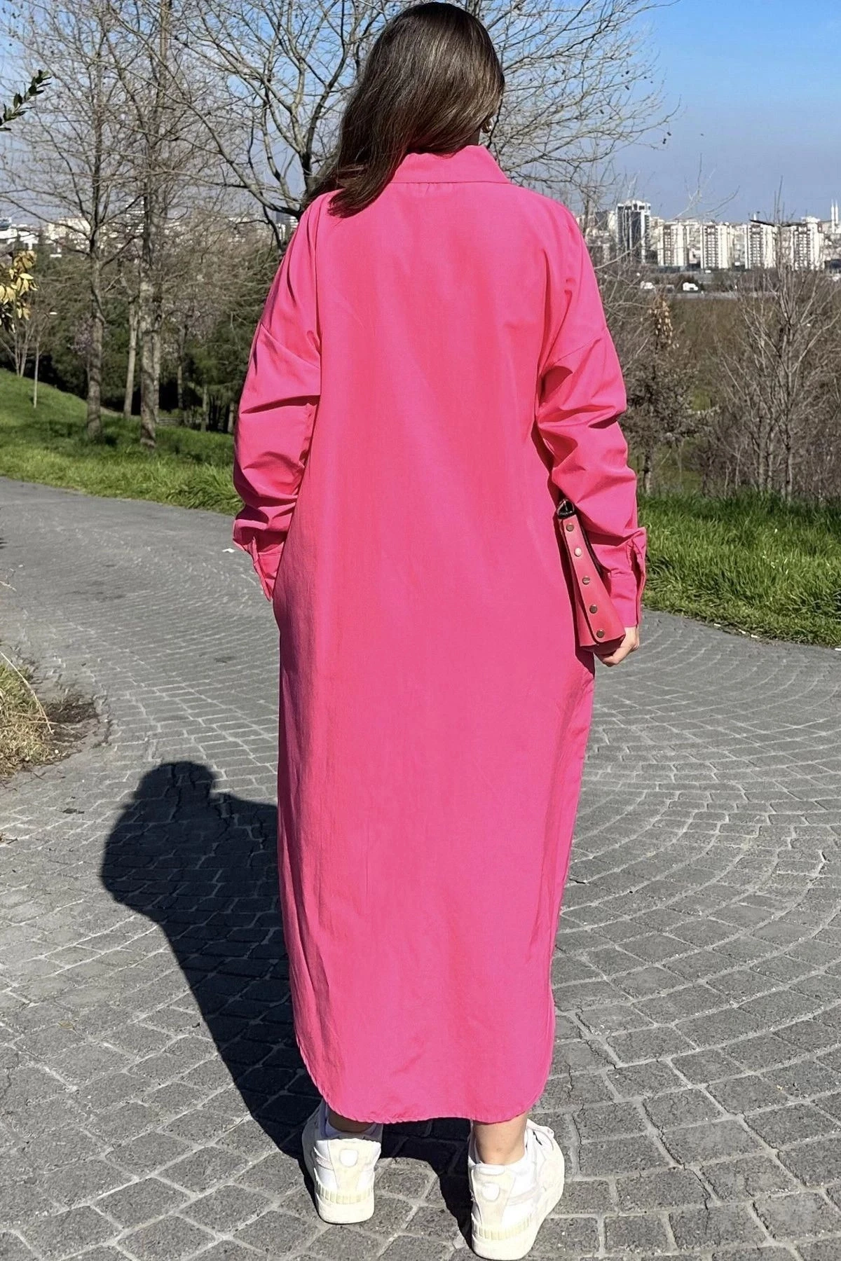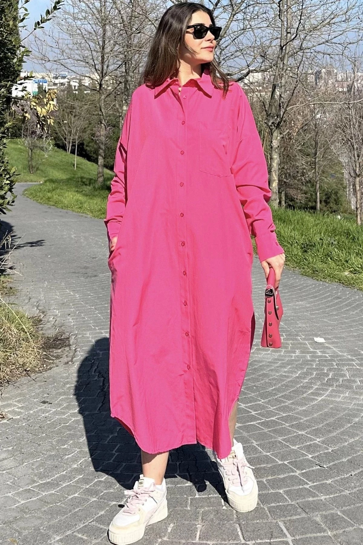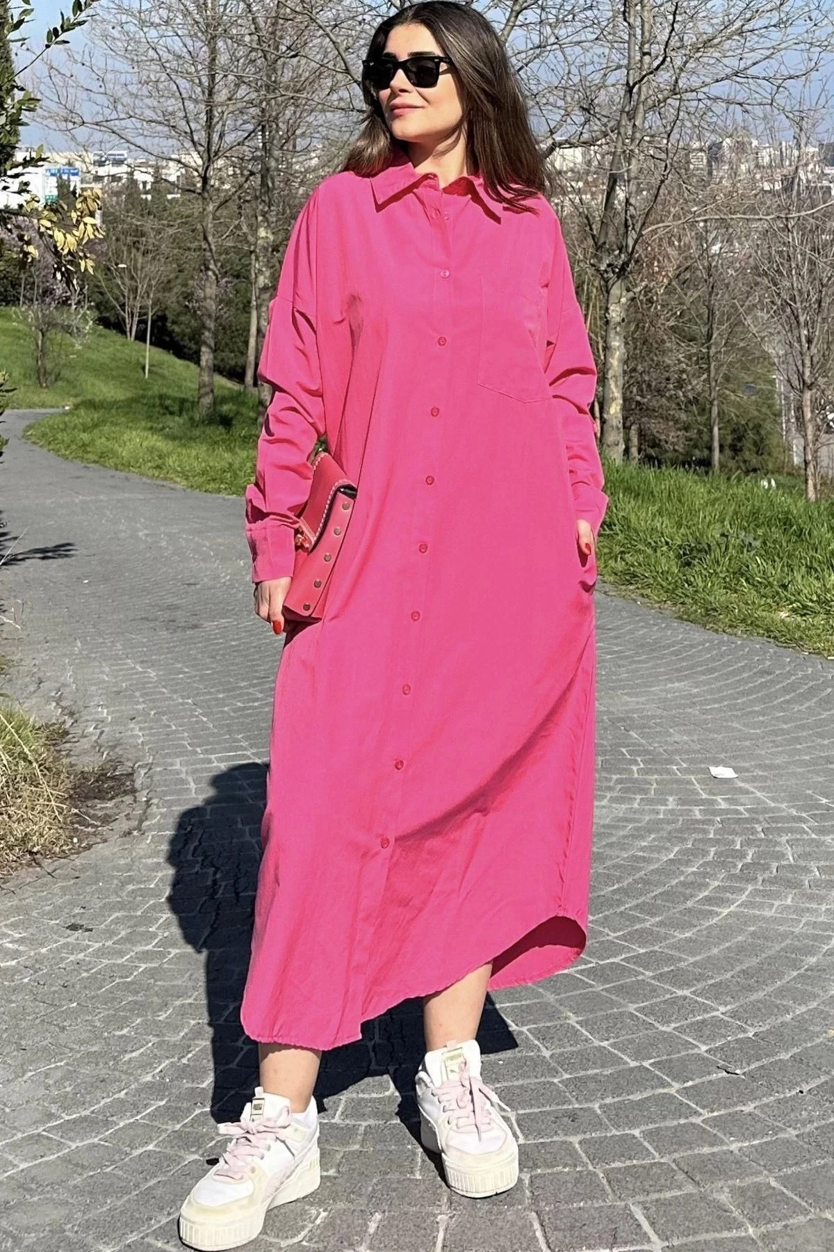 Kadın Fuşya Uzun Kol, Eteği Oval Kesim, Uzun Ve Salaş, Poplin Gömlek Elbise