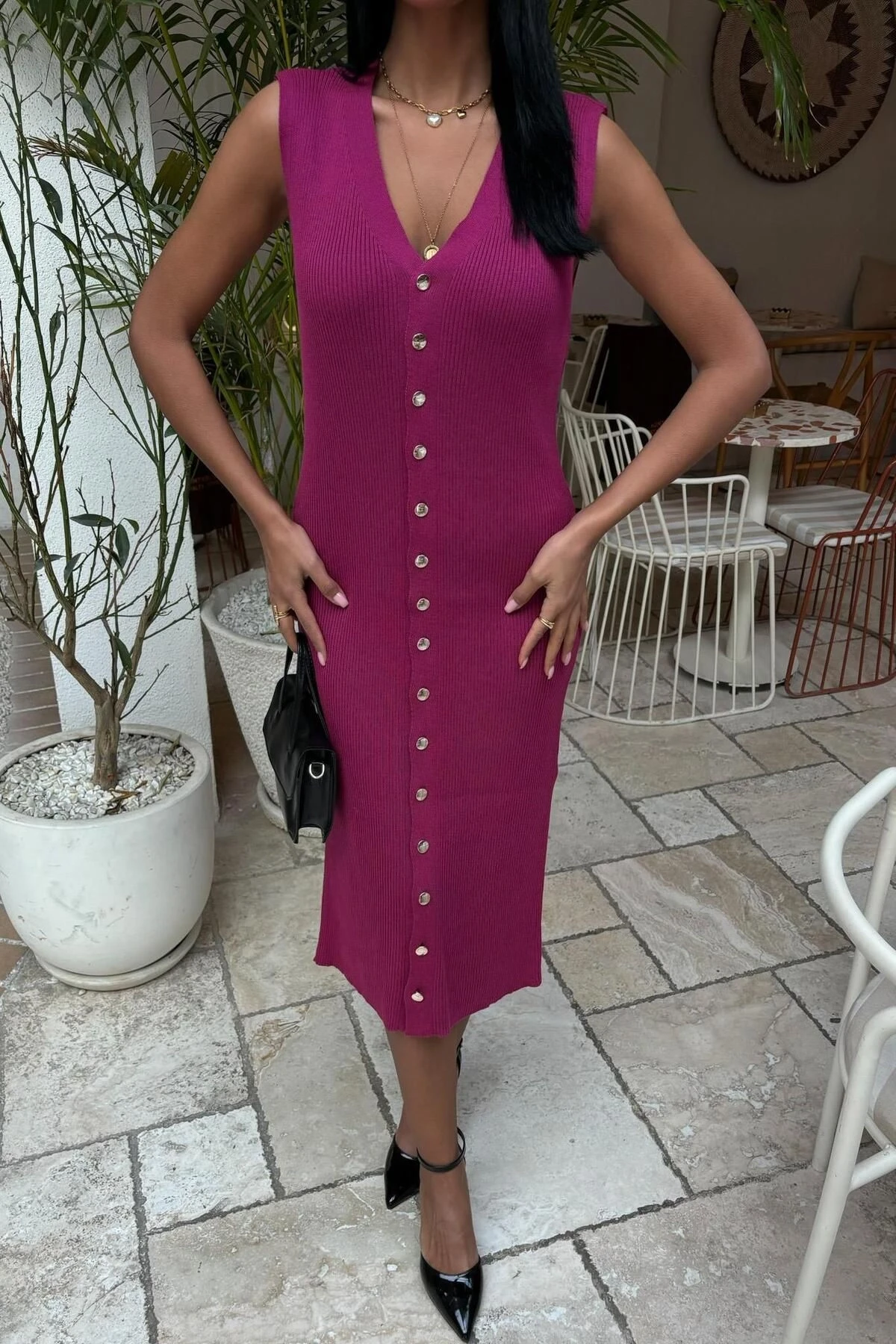 Kadın Fuşya V Yaka Fitilli Kolsuz Uzun Elbise