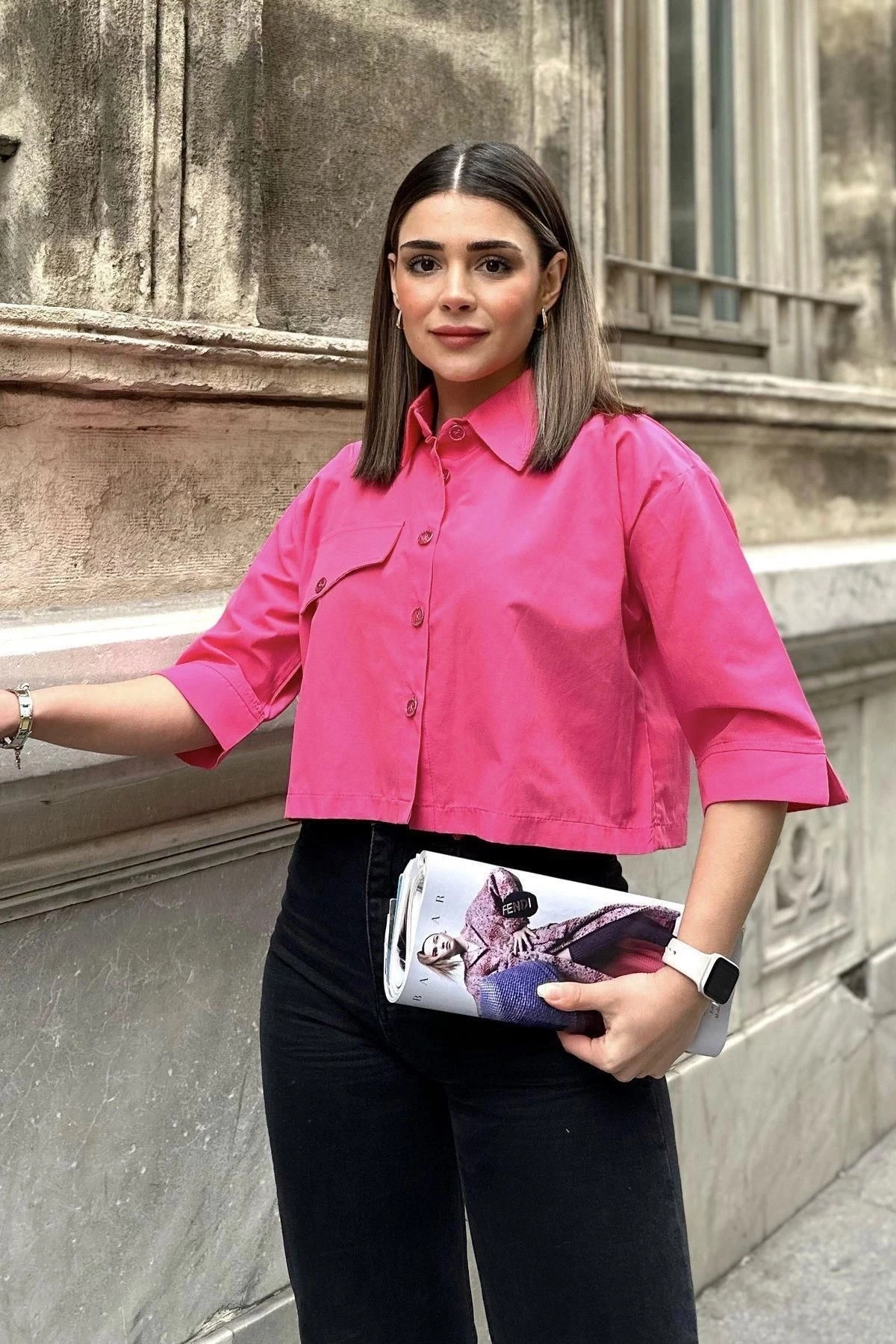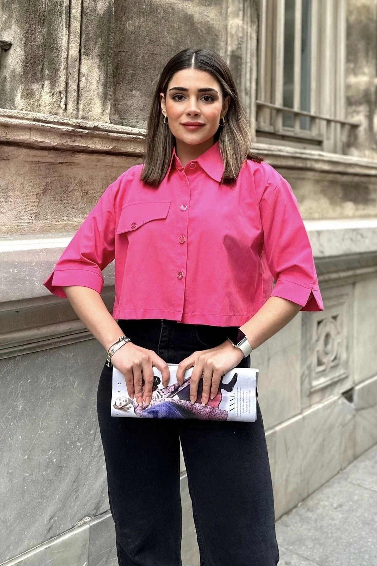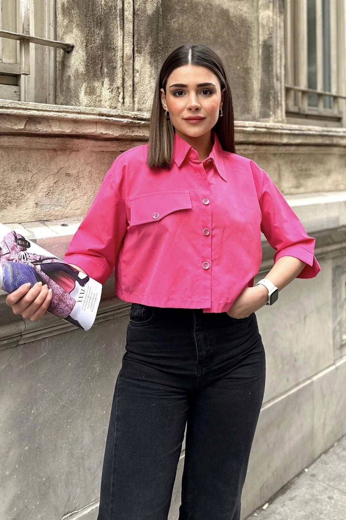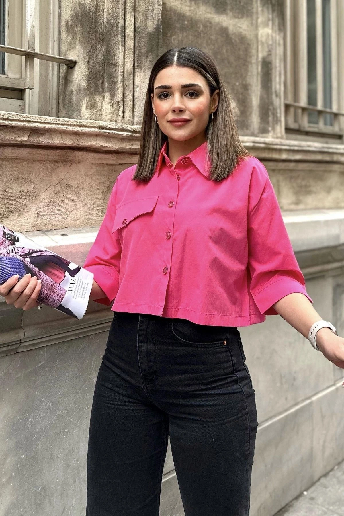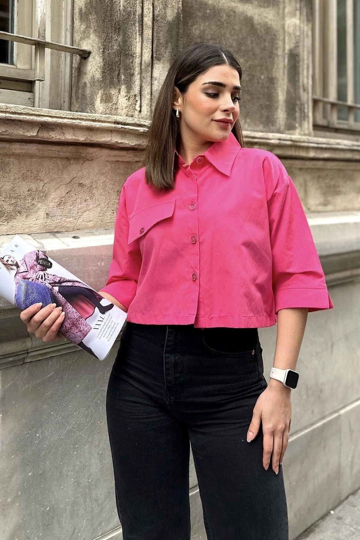 Kadın fuşya Yarım Kol, Cep Ve Kol Detaylı, Terikoton Kumaş, Crop Gömlek