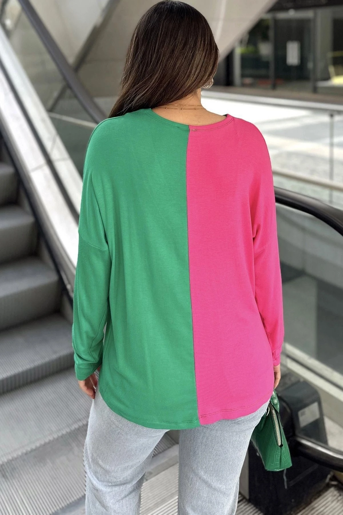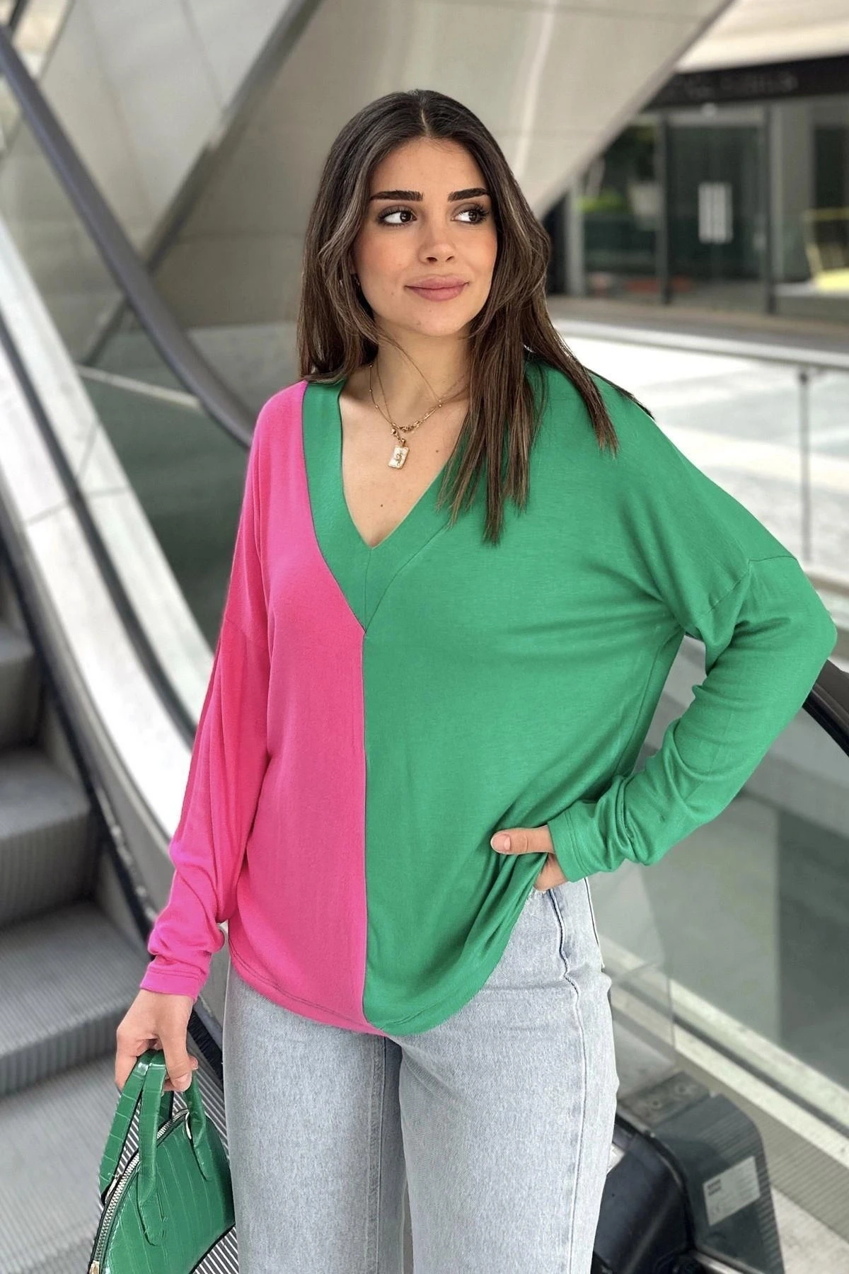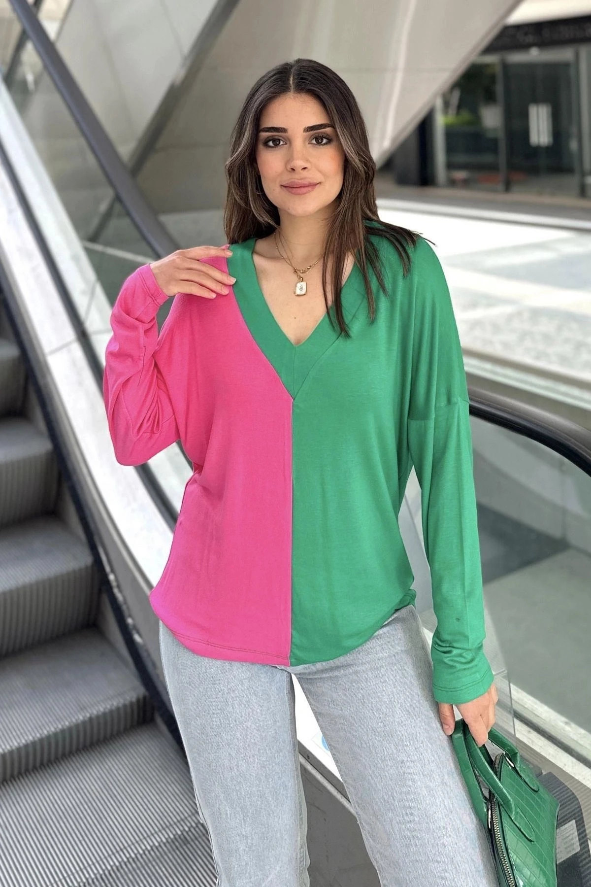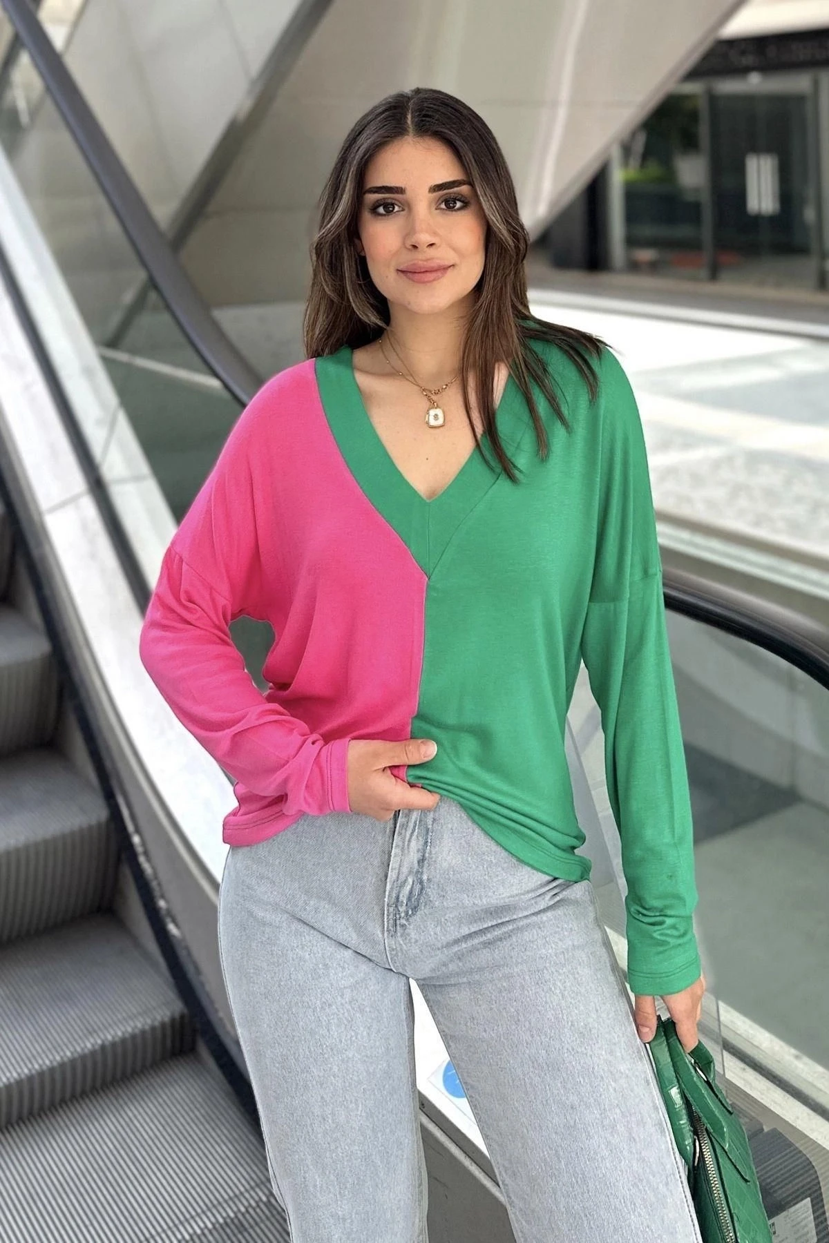 Kadın Fuşya & Yeşil Blok Renkli, V Yaka, Uzun Kollu, Pamuklu Salaş Bluz