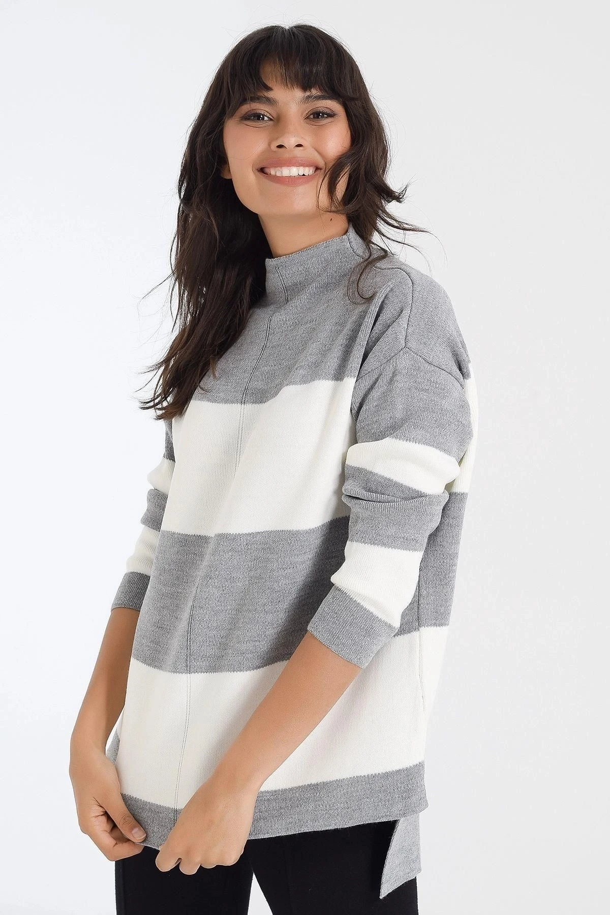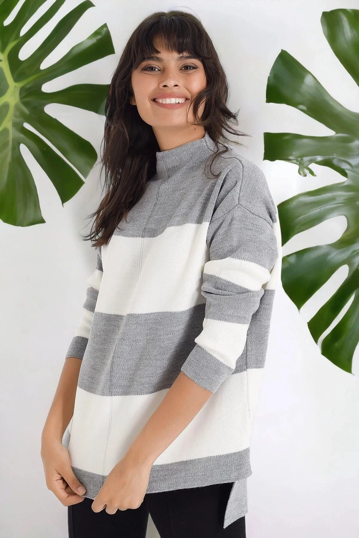 Bu özelliklere sahip Gri Renk Balıkçı Yaka Uzun Kol İki Renkli Çizgili Oversize Triko, Standart Boy, modanın en son trendlerini yansıtan bir seçenektir.; Bu trikonun kumaşı %100 Akrilik'ten üretilmiştir, bu da dayanıklı ve rahat bir giyim deneyimi sunar.; Trikonun tasarımı, modern ve şık bir görünüm sunmak için özenle düşünülmüştür.; Gri renk, zarif ve çok yönlü bir seçimdir, çeşitli kıyafetlerle kolayca kombinlenebilir.; İki renkli çizgiler, trikonun karakteristik özelliklerinden biridir ve dikkat çekici bir detay ekler.; Balıkçı yaka, bu trikonun öne çıkan bir özelliğidir.; Hem şık hem de sıcak tutan bir stil sunarak, soğuk havalarda bile rahatlık sağlar.; Uzun kollar, daha modern bir görünüm ve ekstra koruma sağlar.; Standart boyutuyla, bu triko birçok farklı bedene uyum sağlayacak şekilde tasarlanmıştır.; Oversize kesimi, gevşek ve rahat bir hissun sunar ve her türlü vücut tipine uyum sağlar.; Bu triko, herhangi bir mevsimde giyilebilecek çok yönlü bir parçadır.; İster günlük hayatta ister özel bir etkinlikte olsun, bu triko size stil ve rahatlık sunar.