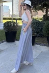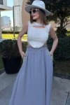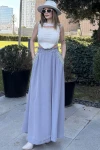Kadın Gri Beli Lastikli, Cepleri Hasır İşlemeli, Rahat Kesim, Uzun Kiloş Etek