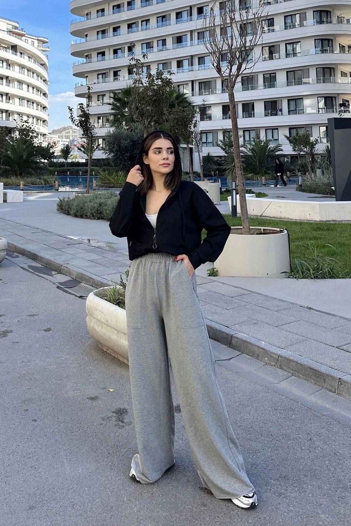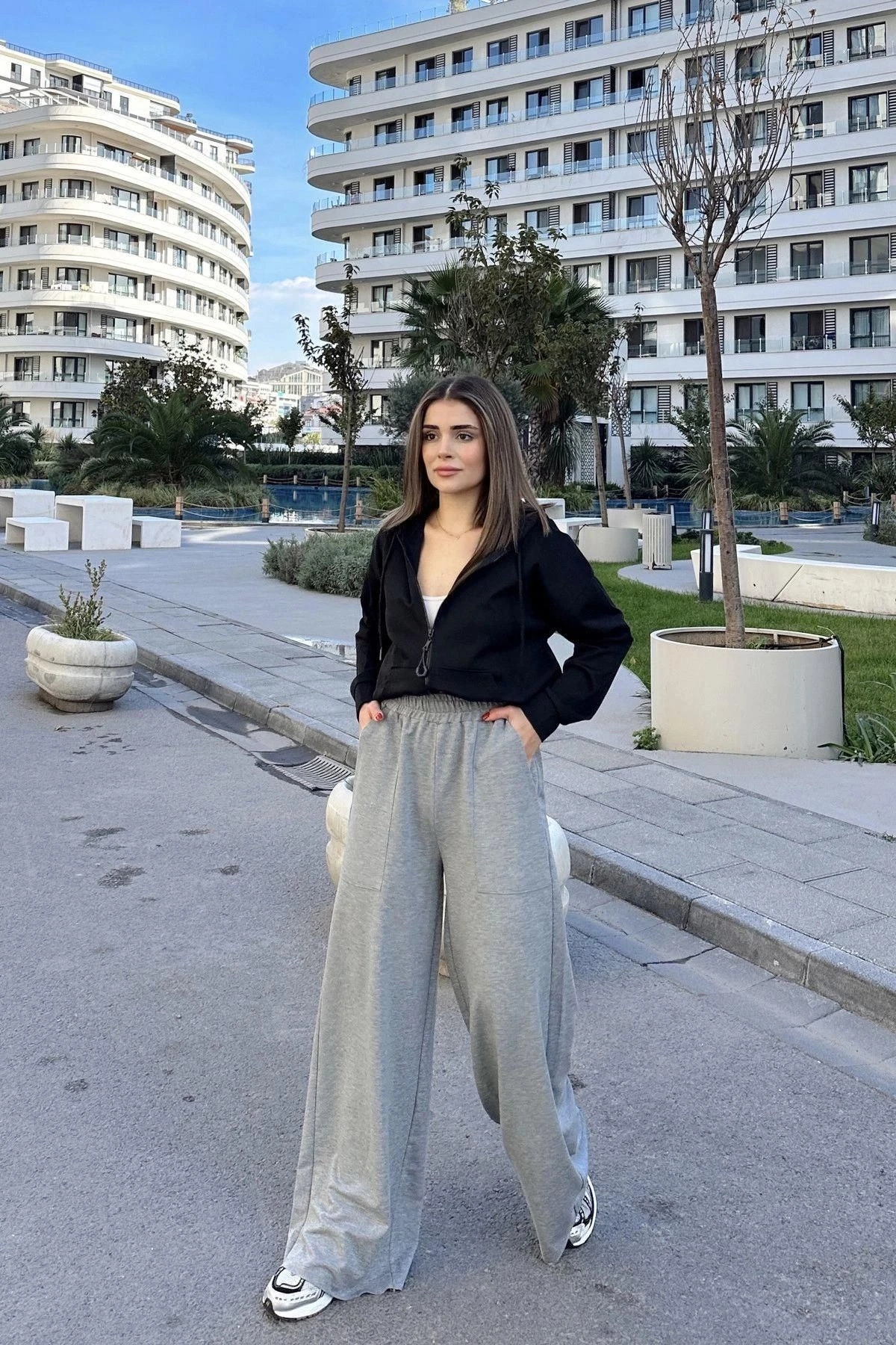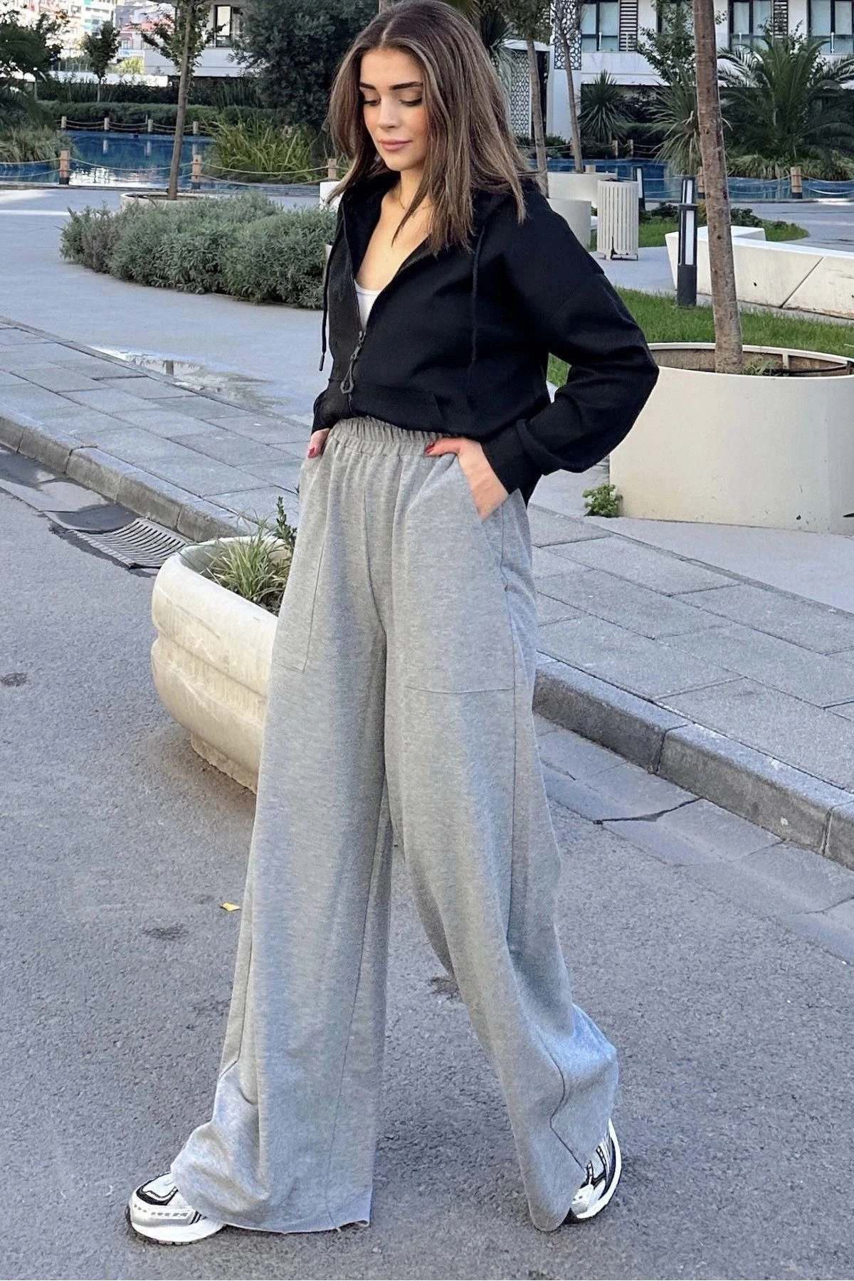 Kadın Gri Beli Lastikli, Cepli, Bol Paça, Salaş Pantolon