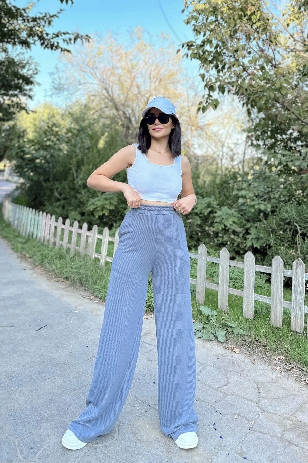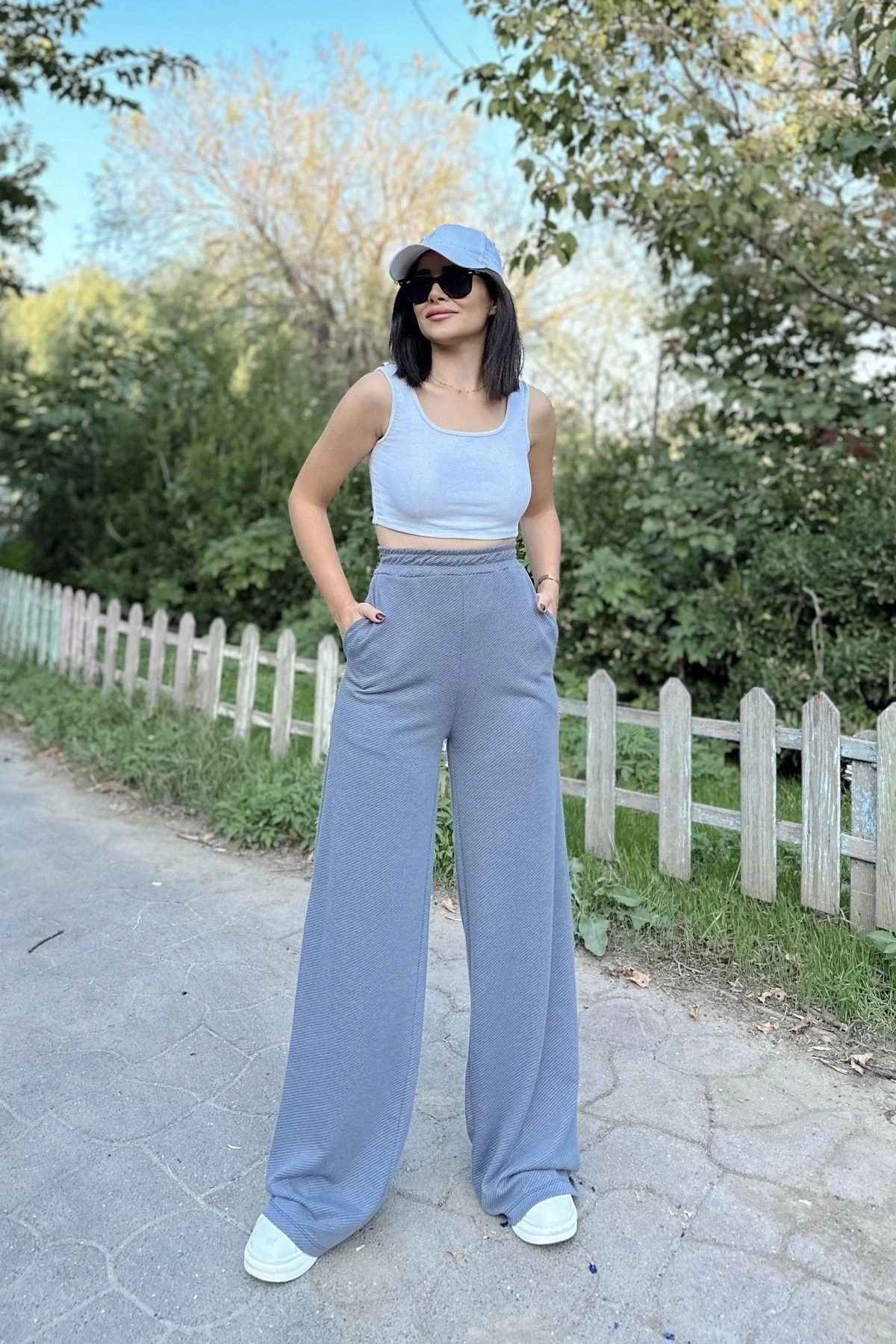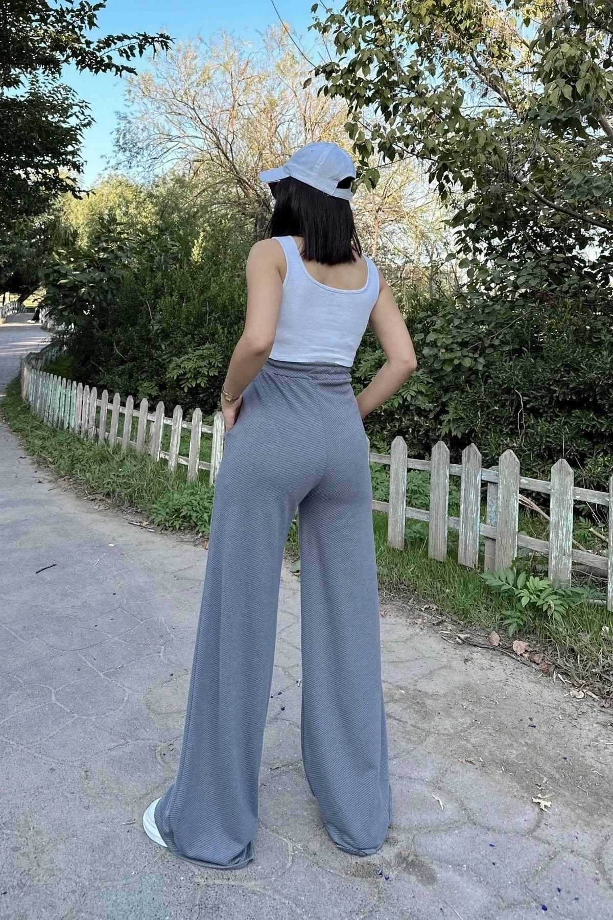 Kadın Gri Beli Lastikli, Cepli Örme Dokuma Kumaş, Bol Paça, Salaş Pantolon
