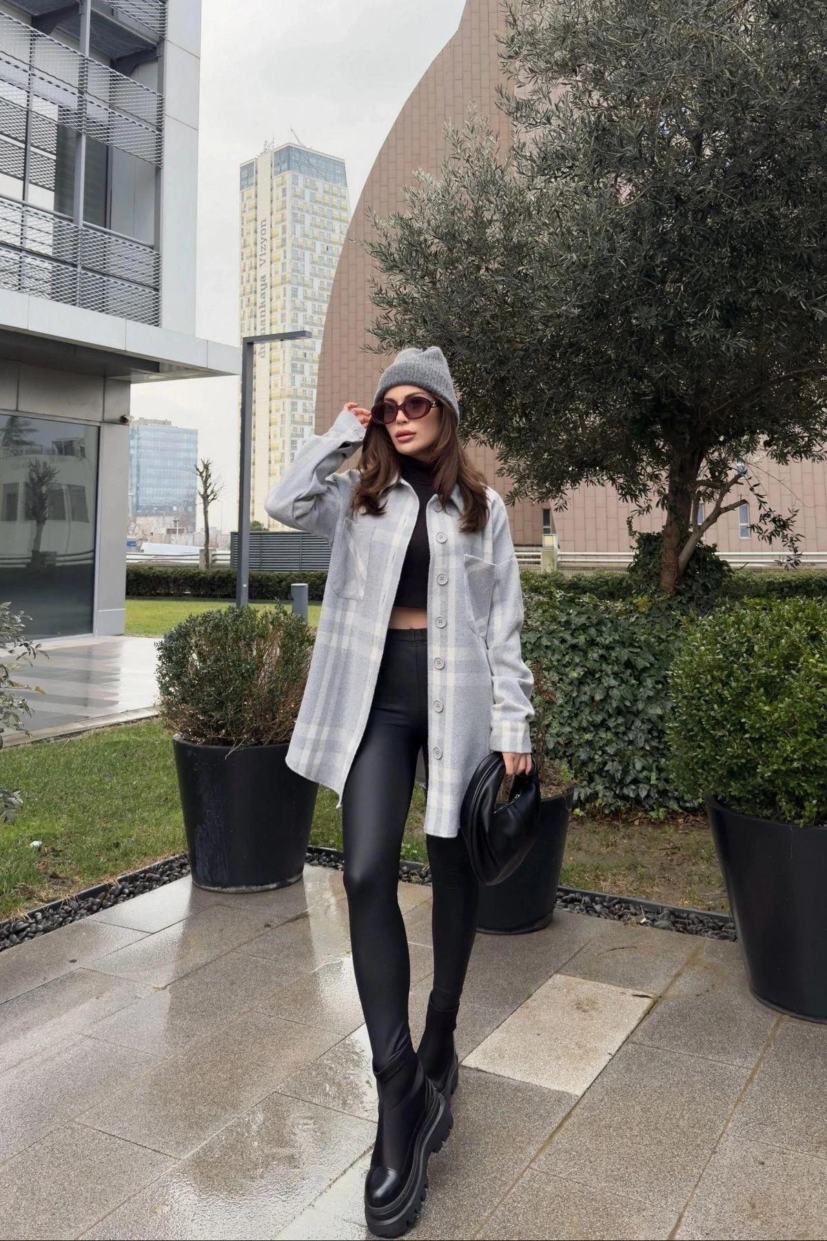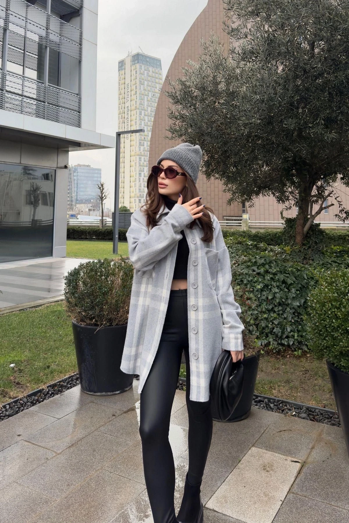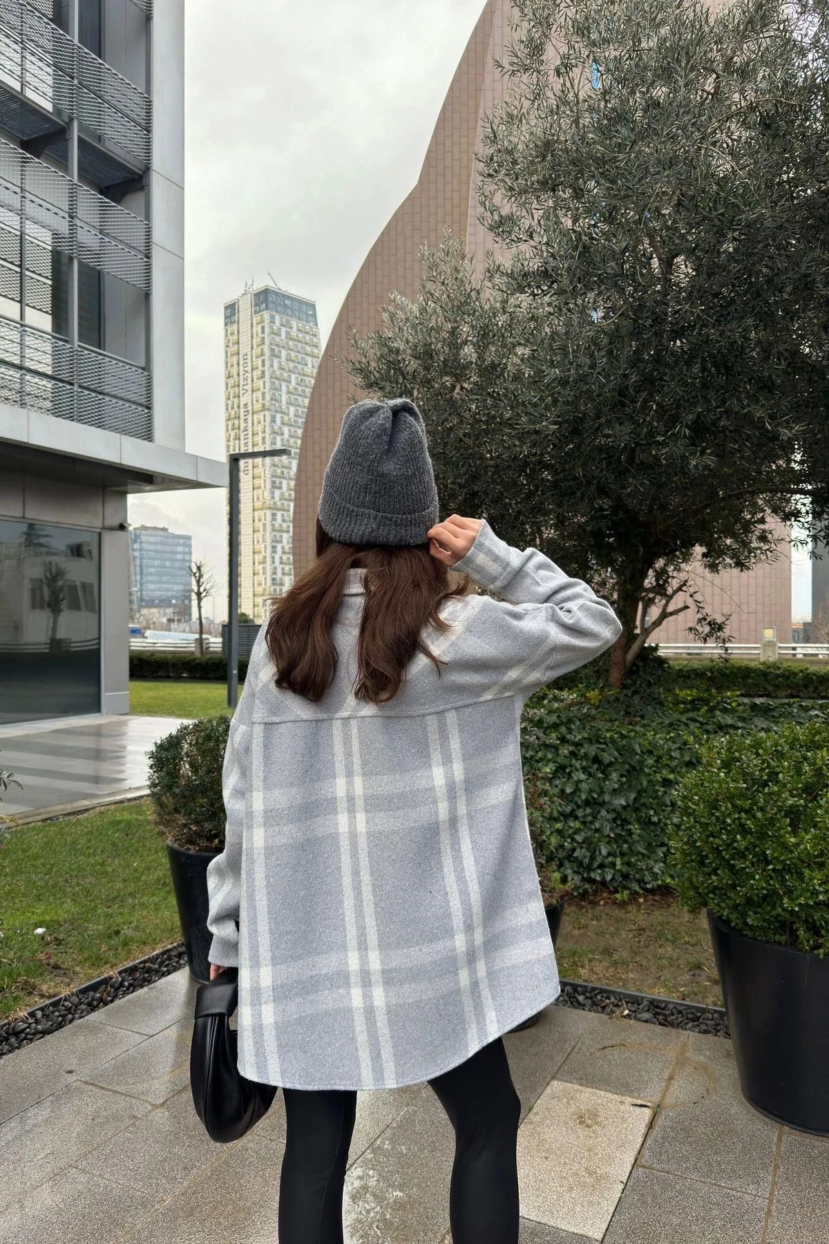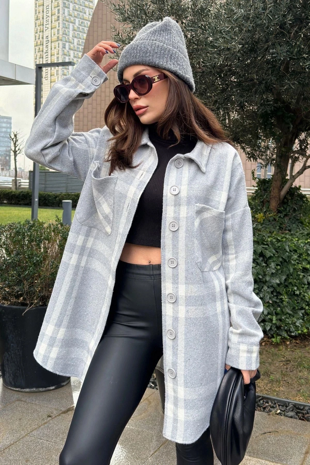 Kadın Gri Çift Cepli, Ekose Desenli, Rahat Kalıp, Uzun Kaşe Gömlek