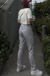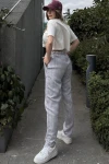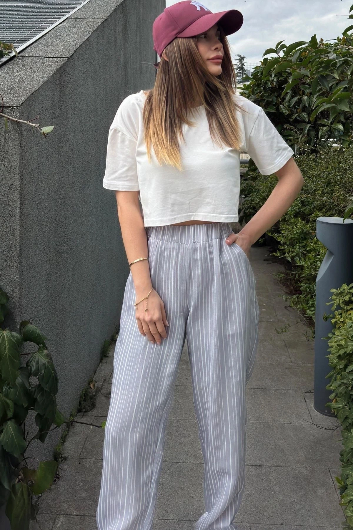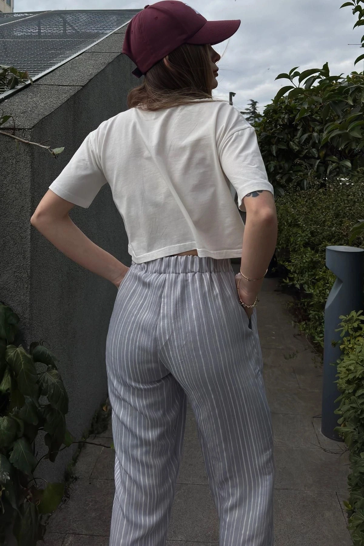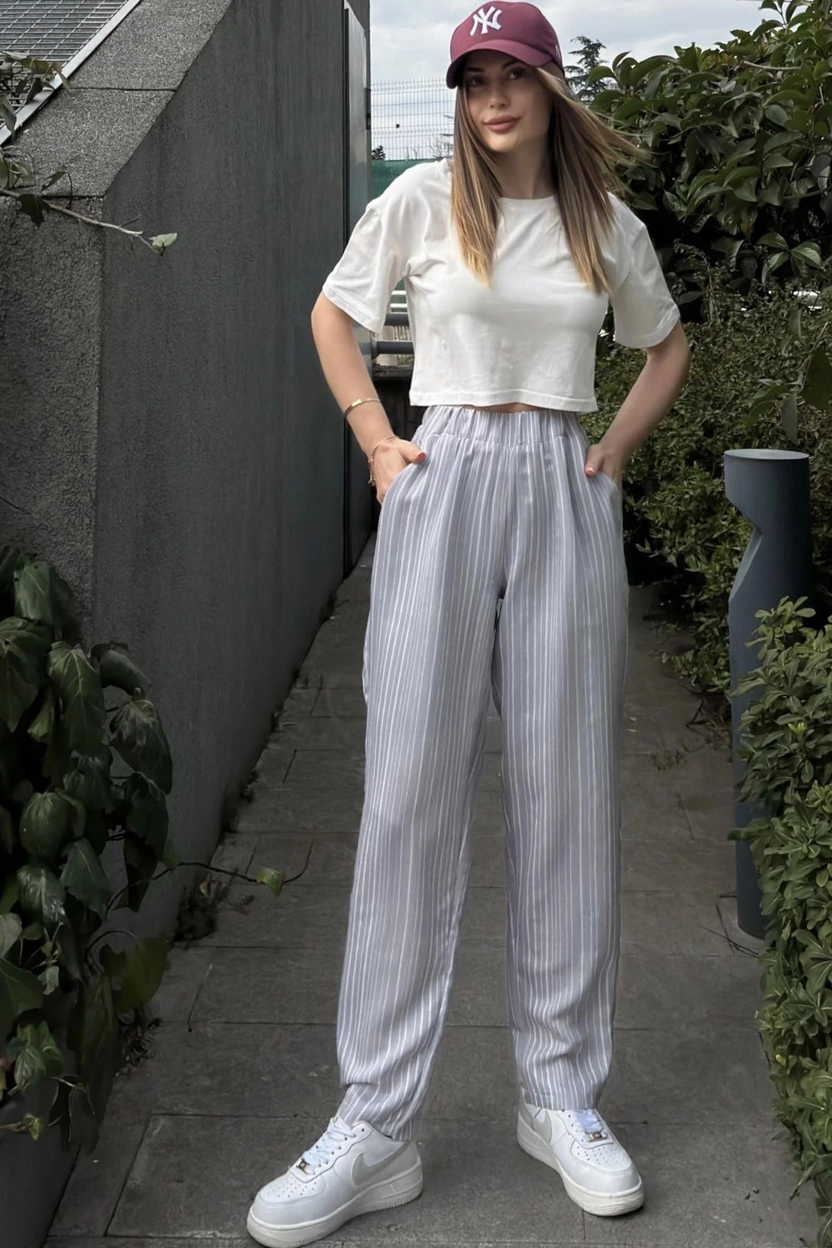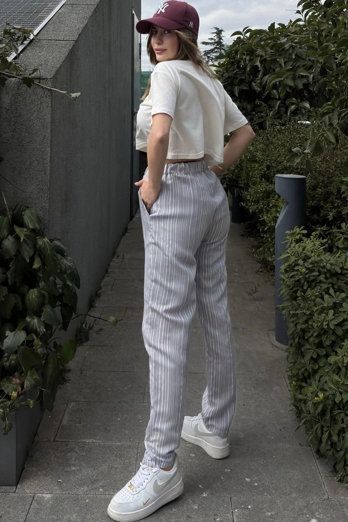 Kadın Gri Çizgili, Beli Lastikli, Cepli, Salaş Spor Pantolon