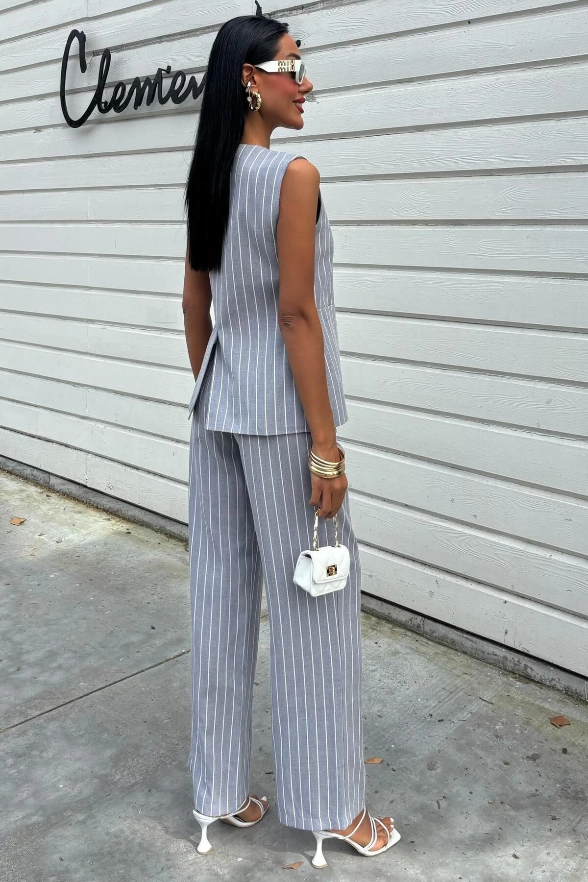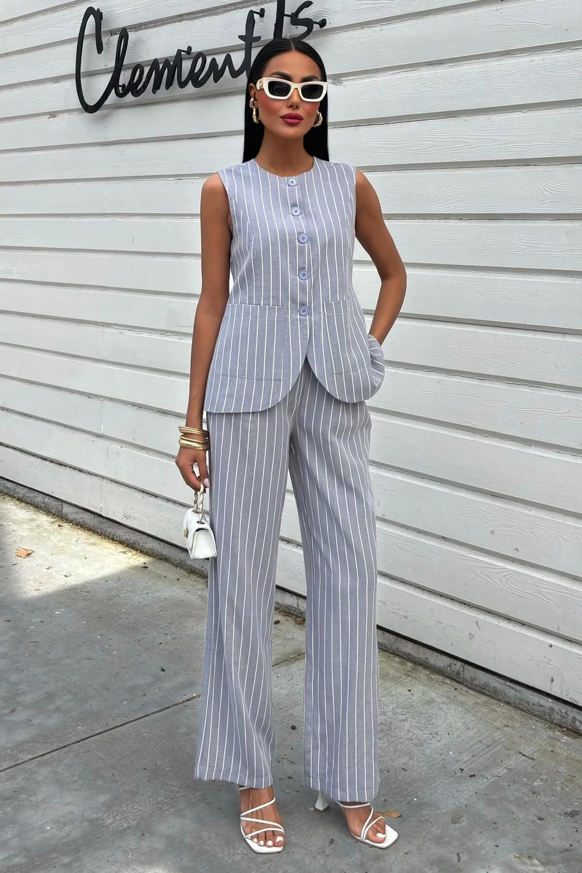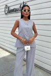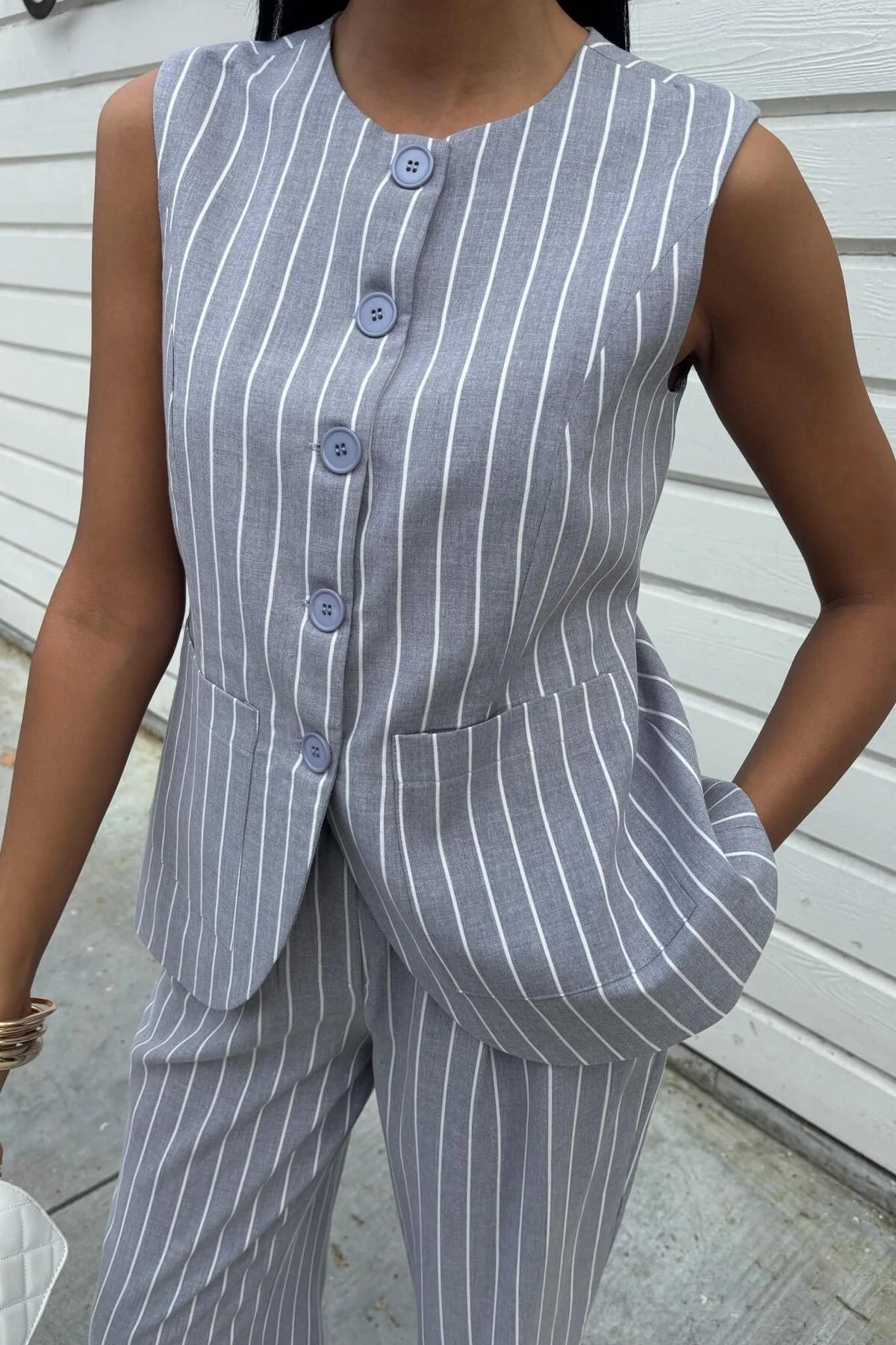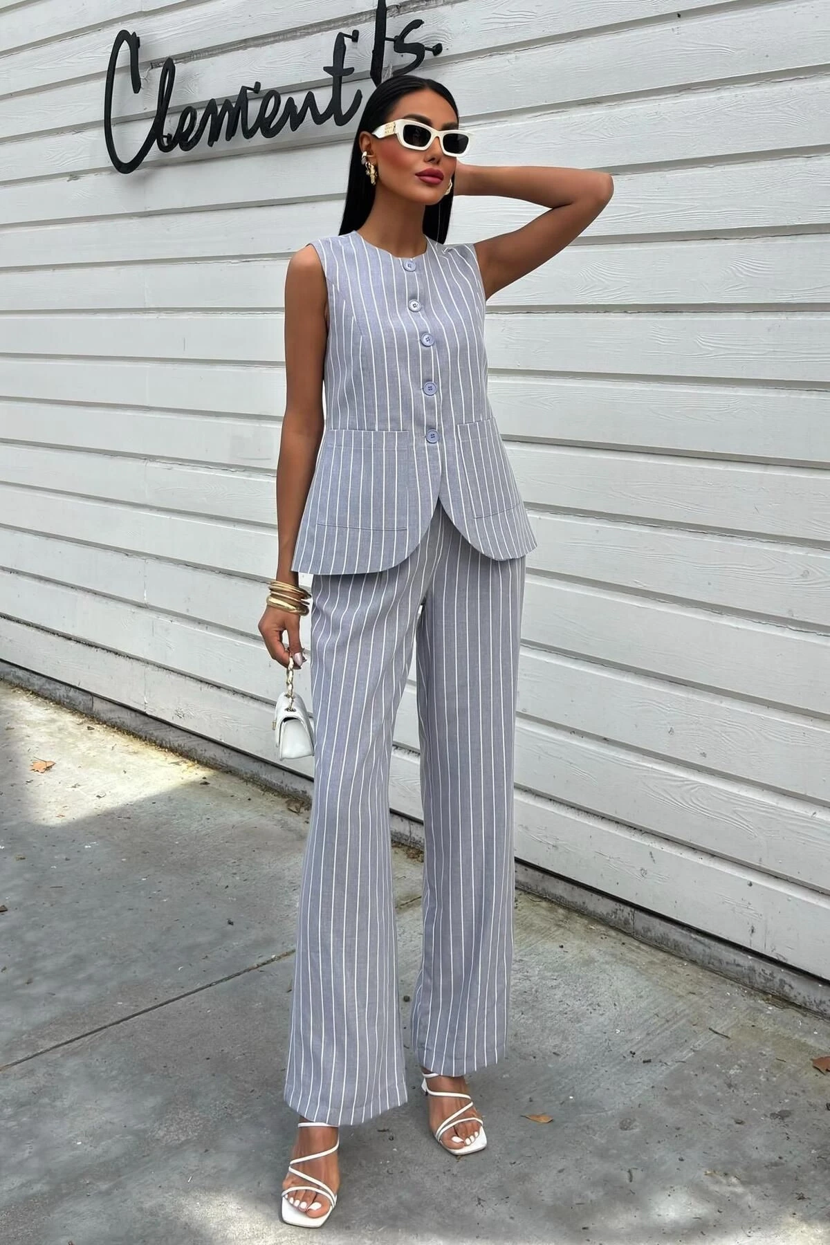 Kadın Gri Çizgili Viscon Keten Uzun İkili Takım