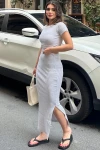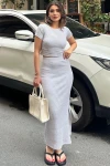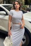 Kadın Gri Crop Bluz & Yırtmaçlı Kalem Etek - Çizgili Kaşkorse Alt Üst Takım